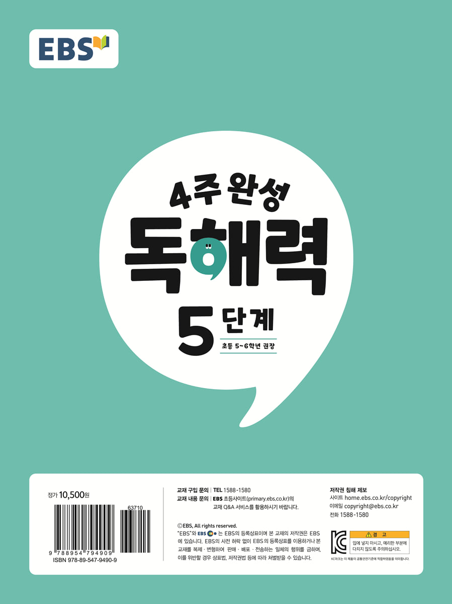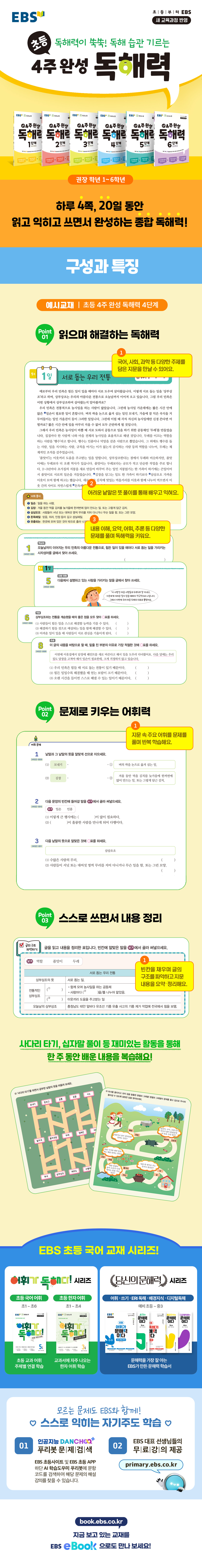 1일 국어 | 사이버 폭력, 멈춰! 2일 수학 | ‘미터(m)’의 발명 3일 사회 | 우리나라의 축제에 가 볼까요? 4일 과학 | 생긴 대로 살까, 환경에 맞춰 살까? 5일 미술 | 서민의 삶을 담은 그림, 민화 1주 마무리 학습 〈2주〉 1일 과학 | 수증기가 응결하여 생긴 이슬, 안개, 구름 2일 사회 | 독도의 자연환경과 생태계 3일 실과 | 로봇의 종류와 작동 원리 4일 사회 | 유교가 조선 시대에 미친 영향 5일 도덕 | 인권을 위해 노력한 인물들 2주 마무리 학습 〈3주〉 1일 국어 | 무엇이 궁금한가요? 2일 수학 | 통계(統計)가 필요한 순간 3일 사회 | 다양한 호칭에 얽힌 비밀 4일 과학 | 빛에도 종류가 있다고? 5일 음악 | 좋은 목소리로 노래하고 싶다면? 3주 마무리 학습 〈4주〉 1일 사회 | 일상생활 속에서 엿볼 수 있는 법 2일 과학 | 속력으로 알아보는 빠르기 비교 3일 도덕, 국어 | 다회용품에 대한 서로 다른 관점의 글 4일 음악 | 오케스트라에서 지휘자의 역할 5일 미술 | 주변의 것들이 예술이 되는 팝 아트 4주 마무리 학습 정답과 해설 |