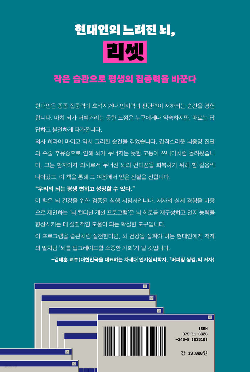 “우리의 뇌는 평생 변하고 성장할 수 있다.” 이 책은 뇌 건강을 위한 검증된 실행 지침서입니다. 저자의 실제 경험을 바탕으로 제안하는 ‘뇌 컨디션 개선 프로그램’은 뇌 회로를 재구성하고 인지 능력을 향상시키는 데 실질적인 도움이 되는 확실한 도구입니다. 이 프로그램을 습관처럼 실천한다면, 뇌 건강을 살펴야 하는 현대인에게 저자의 말처럼 ‘뇌를 업그레이드할 소중한 기회’가 될 것입니다. - 김태훈 (대한민국을 대표하는 차세대 인지심리학자, 『버퍼링 씽킹』의 저자) |