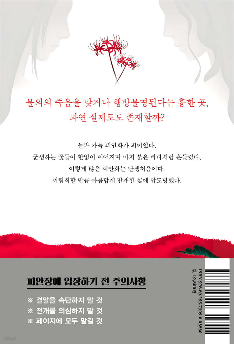 “피안화를 꺾으면 불이 난다는 말을 어릴 적에 들었지.” 유토가 옛날 생각이 난다는 듯 덧붙였다. “피안화는 일반적인 꽃과는 생태가 좀 달라.” 렌은 창밖을 바라보며 말했다. “구근에서 올라온 꽃이 시든 후에야 잎이 나오지. 그래서 잎 없이 꽃만 피어있는 거야. 꽃과 잎이 동시에 피지 않으니까 어쩐지 위화감이 들어서 신비하게 느껴지는 거겠지.” 그리고 세 사람을 향해 담담히 말을 이었다. “가을피안 무렵에 핀다는 데서 유래한 이름도 불길한 이미지에 한몫하는지 모르지. 피안…, 즉 죽음을 의미하는 말이니까. 독이 있는 이 식물을 먹으면 저세상에 가는 수밖에 없다는 뜻에서 유래했다는 설도 있어.” “만주사화라고도 하죠.” 히나타의 말에 “응” 하고 렌은 고개를 끄덕였다. “피안화는 이름이 많아. 천 개도 넘는다는군. 송장꽃, 지옥화, 유령화, 여우꽃, 독꽃, 면도날꽃….” “와, 어쩐지 무서운 이름뿐이네요.” 유토가 쓴웃음을 지었다. “그렇지. 하지만 이름이 많다는 건 그만큼 사람들을 매료해 왔다는 뜻이기도 할 거야.” 수다스러운 데 반해 렌이 건성으로 말하고 있다는 걸 알아차렸다. 뭔가에 정신이 팔린 것처럼 갑자기 말이 끊겼다. 렌이 저 먼 곳을 보는 것처럼 눈을 가느다랗게 뜨고 작게 중얼거렸다. “…이모부는 저쯤에서 불타 죽었어.” 피안화가 흐드러지게 핀 들판을 바라보며 꺼낸 말에 흠칫 놀랐다. 그의 이모와 이모부가 여기서 불의의 죽음을 맞았다는 이야기가 떠올랐다. 땅을 가득 채운 붉은색이 한순간, 사람의 몸을 무자비하게 삼키는 불길처럼 보였다. 무슨 말을 하면 좋을지 몰라 세 사람은 입을 다물었다. --- pp.116-117 “그중 무직인 하야카와 아키라 씨는 실내에서 목을 맨 것으로 밝혀졌습니다.” 아키라는 깜짝 놀라 숨을 삼켰다. 너무 무서워서 머리가 잘 돌아가지 않았다. 뉴스를 보도하는 목소리가 일부러 느리게 재생한 것처럼 일그러졌다. “목을 맸다고 합니다.” “목을 맸다고.” “목을.” 무릎에서 힘이 빠져서 아키라는 그 자리에 주저앉았다. 동요해서 거친 숨을 내쉬며 주변을 둘러보자 바닥에서 흔들리는 그림자가 보였다. 커다란 덩어리 같은 검은 그림자가 앞뒤로 천천히 흔들리고 있었다. 이건 뭐지? 아키라는 머뭇머뭇 위를 보자마자 충격으로 얼어붙었다. 천장에 묶은 밧줄로 목매단 채 느릿느릿 흔들리는 사람 형체가 벽에 선명하게 비쳤다. 아무것도 없지만 분명 있다. 자기 바로 옆에 목을 맨 시체가 매달려 있다. 아키라는 먹이를 찾는 잉어처럼 입을 뻐끔거렸다. 무서워서 목소리가 나오지 않았다. 숨이 잘 안 쉬어졌다. 머릿속에서 끼잉, 하고 귀울림 같은 소리가 났다. 라디오 스피커에서 나는 소리인지, 자신의 머릿속에서 들리는 소리인지 구분이 되지 않았다. 이 방에서 나가야 한다 싶어 아키라가 필사적으로 손을 뻗은 순간, 천둥소리가 울려 퍼졌다. --- pp.200-201 |