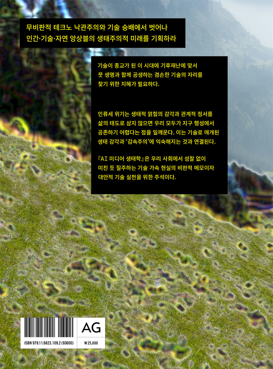 --- p.8 ‘AI 미디어 생태학’은, 숭배나 신앙의 대상이 된 현대 인류의 미디어 기술을 제자리로 돌리기 위한 필자가 지닌 문제의식에서 출발한다. 인간종만의 독특한 능력인 기술을 발명할 수 있는 재주를 통해 인류가 문명을 구성해 왔으나, 반면 고도의 기술 발전으로 인해 많은 부분 동시대 지구 행성의 인류세 위기까지 초래하고 있다는 점도 사실이다. 이 책은 인류세 위기 현실에서 기술이 종교가 된 이 시대에 과연 AI 기술의 위상과 방향이 어떠해야 하는가를 살핀다. 동시대 첨단 미디어 기술을 변혁하고 재고하는 방식에서 공동 번영의 길을 찾는 방법은 그리 쉽지 않다. 하지만 기후재난 앞에서 우리 인간의 기술 또한 겸손해져야 한다. 그래서 나는 AI 기술의 생태주의적 접근과 해법에 착안한다. 다른 무엇보다 뭇 생명과 인간 아닌 존재와의 평화로운 얽힘의 관계를 따지는 ‘생태주의’적 접근을 강조한다. --- p.10 새로움, 속도, 가속, 성장, 경쟁, 발전 등에 익숙한 우리에게, 느림, 감속, 탈성장, 공생, 돌봄 등의 정서는 익숙하지 않다. 하지만 인류세 위기는 우리 모두에게 생태적 얽힘의 감각과 관계적 정서를 삶의 태도로 삼지 않으면 지구라는 행성에서 생존하기 어렵다는 점을 일깨우고 있다. 특히 기술을 경유한 공생 감각은 ‘감속주의’에 익숙해지는 것과 연결된다. --- p.306 감속주의의 방법은 청정의 비물질 혁신 기술로 행세하는 동시대 인공지능의 기술 인프라 조건과 물성을 드러내는 일에서 시작할 필요가 있다. 일차적으로 기후위기와 관련해서 보면, 생성형 AI의 연산처리에 소모되는 과도한 에너지 소비와 탄소 배출에 따른 폐열(廢熱)에 주목할 필요가 있다. 이와 더불어, 희귀금속(희토류)의 무차별 ‘추출주의(extractivism)’로 인한 자연환경 파괴와 피폐화, 추출과 채굴에 동원되는 남반구 노동자의 수탈, 희토류의 광산 채굴 이후의 독성 제련 과정, 인공지능 강화학습 등에 동원되는 위태로운 노동자 지위 등 우리가 쉽게 보지 못하는 AI 생태 균열에 대한 구체적 실체를 드러내는 작업이 필요하다. --- p.306 더 이상 우리의 기술관이 먼 미래에 대한 순진한 기술의 낙관이나 자조 섞인 숙명적 비관의 이분법적 진단이어서는 곤란하다. 동시대 기술을 인류세 생태 패러다임에 함께 묶어두기 위해서는, 보다 현실에 밀착해 우리 주위의 인공/자연, 생명/기계, 가상/실제, 물질/비물질 사이의 배합과 배치를 새롭게 재조정하는 일부터 먼저 시작해야 한다. 그럴 때 지구 곳곳에 만연한 기술 독성을 생태주의적으로 치유할 시험대가 열릴 것이다. 결국 감속주의는 미친 듯 질주하는 자본의 기술 가속의 속도를 제어하고, 인류세 위기를 멈춰 세우는 중요한 방법이 되어야 한다. --- p.310 |