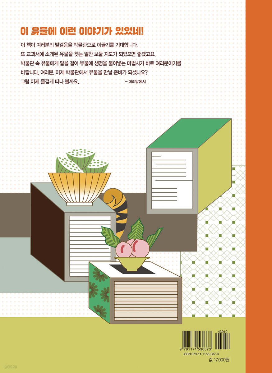 1장. 박물관에서 즐거운 여행을 할 수 있다고요? 1. 박물관은 무엇을 하는 곳인가요? 2. 박물관에서 세계 여행을 할 수 있다고요? 3. 박물관에 가면 교과서 속 유물을 만날 수 있다고요? 4. 우리나라 박물관은 언제, 어떻게 만들어졌을까요? 5. 박물관에서는 어떤 분들이 일을 하나요? 6. 박물관에서 시간 여행을 할 수 있다고요? 2장. 박물관 속 숨은 이야기가 궁금해요 1. 박물관 유물이 모두 진짜는 아니라고요? 2. 캄캄한 어둠 속에서 전시하는 이유가 있다고요? 3. 박물관에서는 왜 이렇게 하지 말라는 것이 많을까요? 4. 청동 거울은 거울인데, 왜 얼굴이 비춰지지 않나요? 5. 상설 전시와 특별 전시는 뭐가 다를까요? 6. 전시를 재미있게 보는 비법이 있다고요? 3장. 교과서 속 문화유산이 많은 박물관은 어디인가요? 1. 국립중앙박물관_국가대표 박물관이자 모두의 박물관 2. 국립경주박물관_신라로 가는 가장 빠른 길 3. 국립공주박물관_무령왕릉의 모든 것을 담다 4. 국립부여박물관_백제의 영광과 비극을 마주하다 5. 국립익산박물관_백제의 역사를 발굴하는 시간 광산 6. 국립나주박물관_영산강 유역 고대 문화와의 만남 7. 국립김해박물관_‘철의 나라’ 가야를 재발견하다 4장. 지역의 살아 있는 역사를 알려면 어디로 가면 좋을까요? 1. 국립광주박물관_보물선 유물들이 한가득 2. 국립대구박물관_과거와 현대가 만나는 곳 3. 국립전주박물관_조선 왕실의 고향이 궁금하다면 4. 국립제주박물관_바람과 돌과 사람 이야기를 품다 5. 국립진주박물관_전쟁 속에서 평화를 생각하는 곳 6. 국립청주박물관_고려 금속 문화유산의 아름다움 7. 국립춘천박물관_우리들의 얼굴을 만나러 가는 길 |