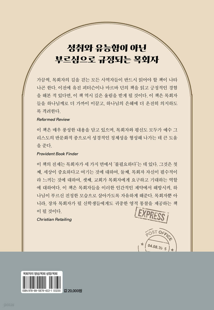 ● 목회자의 정체성 회복: 목회자는 단순한 행정가나 종교 전문가가 아니라, 말씀과 성례를 통해 교회를 세우는 자다. ● ‘불필요함’의 역설: 세상은 목회자를 크게 필요치 않을 수 있지만, 복음의 본질과 교회의 생명력은 목회자를 통해 드러난다. ● 신학적 기초: 에베소서와 목회서신을 중심으로, 성경적 근거 위에 선 목회 신학을 제시한다. ● 영성과 신학의 만남: 유진 피터슨의 깊은 영성과 마르바 던의 철저한 신학적 성찰이 조화를 이루어, 이상과 현실을 아우른 목회 신학을 보여준다. 2. 한국 교회를 향한 도전 ● 세속적 성공주의 비판: 교회 성장, 프로그램 운영, 관리 능력에 치우친 목회 현실을 비판한다. ● 갱신의 부름: 로마서 12장 2절을 인용하여, 세대의 흐름을 본받는 것이 아니라 마음을 새롭게 함으로써 변화를 받으라는 말씀을 교회 전체가 다시 들어야 함을 촉구한다. ● 성령의 선물 기억: 디모데에게 준 사도 바울의 권면처럼, 목회자들은 하나님께 받은 은사를 다시 불일 듯 새롭게 하여 복음적 사역을 이어가야 한다. 3. 의의 『불필요한 목회자』는 단순한 지침서가 아니라, 한국 교회와 목회자들을 향한 신학적 선언문이자 갱신의 외침이다. 이 책은 목회자가 복음의 본질적 사명을 붙잡고, 문화적 요구에 끌려가지 않으며, 오직 은혜의 능력으로 교회를 섬기도록 초대한다. 4. 이 책이 주는 유익 1) 목회자에게 ● 말씀의 권위 회복: 디모데전후서와 디도서를 바탕으로, 목회 사역의 근간이 프로그램이 아니라 복음임을 선명히 한다. ● 겸손과 자유의 회복: “이때에 네가 만일 잠잠하여 말이 없으면… 하나님은 다른 데로 말미암아 놓임과 구원을 얻으리라”(에 4:14)는 말씀처럼, 하나님께서 교회의 주인이심을 인정하게 한다. ● 신학적 방향성: 에베소서가 제시하는 ‘그리스도의 몸 된 교회’의 청사진을 목회 현실 속에 적용할 수 있도록 돕는다. 2) 성도들에게 ● 목회자를 ‘성공 모델’이나 ‘종교 서비스 제공자’로 보던 시각을 깨뜨리고, 함께 복음에 동참하는 동역자로 인식하게 한다. ● 평신도의 사명과 공동체적 소명을 자각시켜, “너희는 택하신 족속이요 왕 같은 제사장”(벧전 2:9)이라는 말씀을 자신의 삶 속에서 새롭게 붙잡게 한다. ● 목회자와 성도의 관계를 상하가 아닌 함께 십자가를 지는 공동체적 관계로 전환시킨다. |