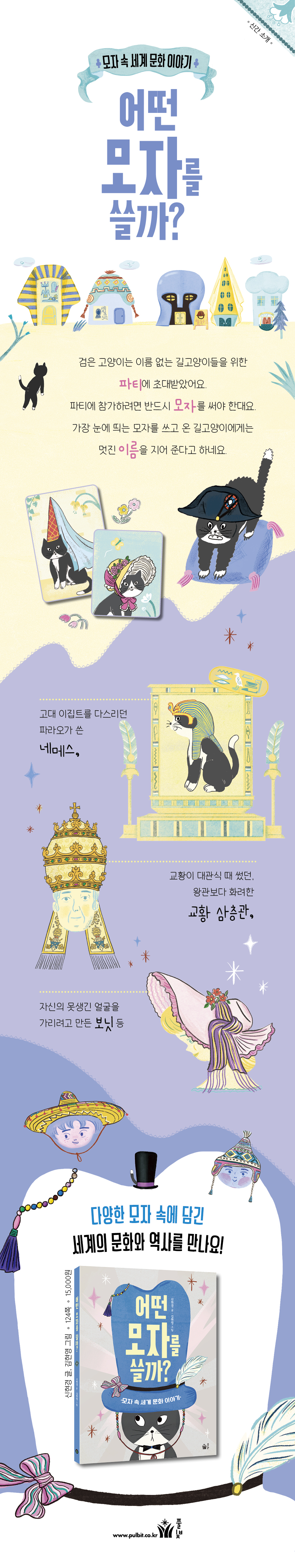 다양한 모자 속에 담긴 세계 여러 나라의 역사와 문화 ‘사람들은 어떤 이유로 모자를 쓸까? 멋으로? 추워서? 더워서? 그런데 머리에 쓰는 거면 다 모자에 속할까? 그럼 헬멧도 모자일까? 머릿수건도?’ 이 책을 쓴 작가는 이런 꼬리에 꼬리를 무는 질문에 대한 답이 너무 궁금해서 모자 공부를 시작했어요 그리고 꼬리에 꼬리를 무는 질문이 꼬리에 꼬리를 무는 지식을 가져다주는 경험을 나누고 싶어서 책으로 엮었지요. 성직자들이 쓰는 납작한 빵모자 ‘주게토’는 왜 쓰기 시작했는지 아나요? 주게토는 정수리를 가리려고 쓰기 시작한 건데, 중세 시대 성직자 들은 세속을 끊고 하느님에게 자신을 바친다는 의미로 정수리 부분을 삭발했거든요. 그러다 보니 정수리가 겨울에는 춥고 여름에는 햇볕 때문에 따가워, 정수리를 가릴 만한 작은 빵모자를 쓰기 시작했어요.비버 가죽 모자의 유행이 세계 지도를 바꿨다는 걸 아나요? 영국 왕 찰스 1세가 귀족이라면 반드시 비버 가죽 모자를 써야 한다고 명령한 이후 비버 가죽을 구하기 위해 유럽 사람들은 북아메리카 대륙으로 향했고, 네덜란드 상인들은 아메리카 원주민들에게 맨해튼섬을 사 버렸어요. 바로 지금의 미국 뉴욕 중심부에 있는 섬 말이에요. 맨해튼 다음으로 발을 들인 곳은 지금의 캐나다인데, 프랑스와 영국은 캐나다에 식민지를 만들었지요. 그 밖에도 총알에서 머리를 보호하기 위해 쇠 그릇을 뒤집어 쓴 덕분에 목숨을 구한 병사에게서 비롯된 군인용 철모, 낯선 남자로부터 여자를 보호하기 위해 쓰던 것에서 점점 여자들을 고립시키는 것으로 변해 버린 이슬람교의 쓰개 히잡과 부르카, 못생긴 얼굴을 가리려고 만든 모자 보닛, 몽둥이로 머리를 내려쳐 움푹 꺼져 버린 중산모에서 힌트를 얻은 중절모 등, 우리에게 친숙한 혹은 우리가 몰랐던 여러 모자들에 대한 지식은 물론이고, 모자에 담긴 재미난 이야기들도 이 책을 통해 만날 수 있어요. 다른 나라의 문화와 역사를 배우고 이해하는 가장 재미난 방법, 바로 《어떤 모자를 쓸까?》를 읽으며 검은 고양이를 따라다니는 거예요!