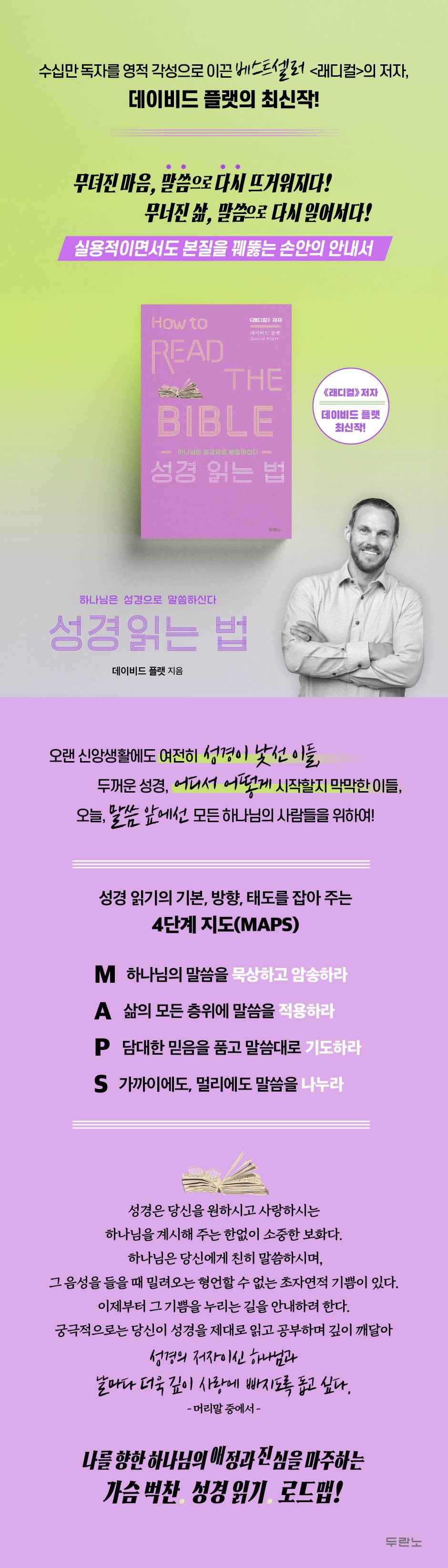 나를 향한 하나님의 애정과 진심을 마주하는가슴 벅찬 성경 읽기 로드맵!무뎌진 마음, 말씀으로 다시 뜨거워지다!무너진 삶, 말씀으로 다시 일어서다!실용적이면서도 본질을 꿰뚫는 손안의 안내서이 책은 종교적 의무로서의 성경 읽기 지침서가 아니다. 창조주 하나님과 사랑을 나누는 자리로 우리를 초대한다. 내 느낌과 주관, 그럴 듯해 보이는 통찰을 추구하는 ‘나 중심 성경 읽기’를 떠나, 저자이신 ‘하나님의 의도하신 대로’ 말씀을 대하도록 이끌어 준다. 또한 성경 읽기의 기본, 방향, 태도를 잡아 주는 믿을 만한 4단계 실용적 지도(MAPS)를 소개한다. 바로 성경을 묵상하고 암송하고, 적용하며, 기도하고, 나누는 것이다. 각 장 말미에 기도와 질문 코너도 수록해 이 책의 내용을 더 깊이 이해하고 실천할 수 있도록 도와준다. 본래 성경 공부는 딱딱하고 기계적인 종교 활동이 아니다. 성경은 하나님 나라의 보화로 가득하다. 당신을 기다리고 있는 그 보화를 누리라! 그분의 생명과 사랑으로 충만한 그분의 말씀을 꾸준히 제대로 읽기만 하면, 그 사랑이 우리 삶을 반드시 살리고 변화시킨다. 그분의 사랑을 누릴 수 있다면 우리의 전부를 드려도 아깝지 않다!
