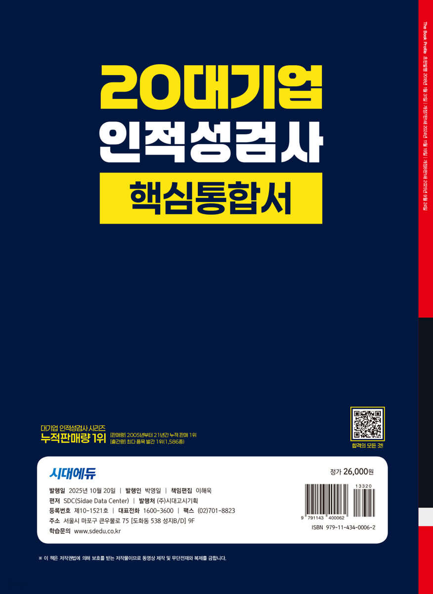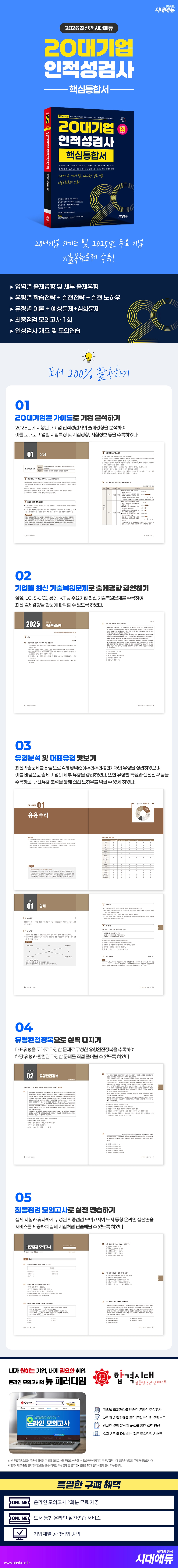 20대기업의 다년간 출제되었던 문제유형을 바탕으로 인적성검사의 여러 영역을 분석하여 단 한권의 도서로 준비할 수 있도록 구성하였다. 먼저 20대기업별 출제경향 및 시험분석을 통해 기업별 시험구성을 확인할 수 있도록 하였고, 2025년 삼성, LG, SK, CJ, 롯데, KT 등의 주요기업 기출문제를 영역별로 구성한 기출복원문제를 수록하여 최근 기업별 시험 출제경향을 알 수 있도록 하였다.