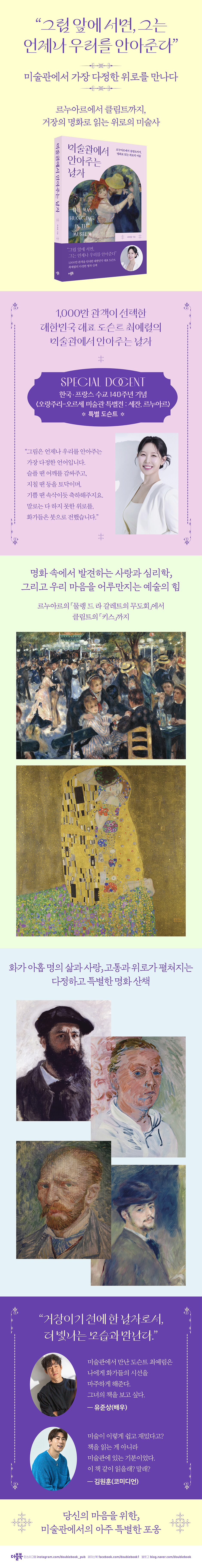 --- p.6 슬플 때는 위로가 되고, 기쁠 때는 공감이 되고, 지칠 때는 힘이 됩니다. 같은 작품이어도 보는 사람의 마음 상태에 따라 전혀 다른 메시지를 전해주는 것. 이것이야말로 예술의 진짜 매력이에요. --- p.7~8 명화를 ‘감상’하기 위해 미술관을 찾는 사람들, 또 해설을 듣기 위해 저를 찾아오는 분들이 미술관에서 가장 원하는 감정은 무엇일까요? 10여 년 동안 가장 크게 느낀 건 ‘위로’였어요. (중략) 그림 앞에서 고개를 푹 숙이고 흐느끼시는 분들을 자주 보거든요. 눈을 맞추고 경청하다 눈물을 삼키는 분들도 계세요. --- p.8 처음에는 ‘모네가 왜 이 수련을 그렸는가’를 설명했지만, 시간이 지나면서 제 설명은 이렇게 바뀌었습니다. ‘이 수련을 그리기 위해 그가 어떻게 견뎌냈는가.’ 그림에 대한 사랑, 백내장으로 흐려지는 시야 속에서도 붓을 놓지 않은 고집, 연못을 들여다보며 하루하루를 버텨낸 시간. 수련은 단순한 꽃이 아니라, 그가 생을 견뎌낸 기록이었습니다. --- p.38 나는 그림을 그릴 때 고통을 잊는다. (중략) 추하고 고통스러운 것은 인생에 이미 충분하다. 아름다움만 남기고 싶다. --- p.73~75 달리의 모든 기행과 과장된 행동을 다시 보면, 결국 한 가지로 귀결됩니다. 사랑받고 싶다는 간절한 마음. (중략)그의 모든 퍼포먼스 뒤에는 ‘나를 봐주세요, 나를 사랑해주세요’라는 순수한 외침이 숨어 있었어요. --- p.298 "힘들지, 웃어봐’보다는 ‘힘들지? 같이 울자. 이것이 우리가 살아가는 현실이라네’라고 이야기하면서요. 뷔페는 그렇게 깊은 동굴 속에서 고통을 함께하며 안아주는 남자입니다. --- p.306 드러난 고통은 절망으로만 머물지 않고, 오히려 우리에게 삶을 견디게 하는 또 다른 힘으로 다가옵니다. --- p.331 너무 사랑하기에 그만둘 수 없는 일. 화가들도 그랬습니다. 알아주든 알아주지 않든, 성공하든 실패하든, 멈추지 않고 그립니다. 무언가를 진심으로 사랑한다는 것, 그 자체가 이미 승리입니다. --- p.333 |