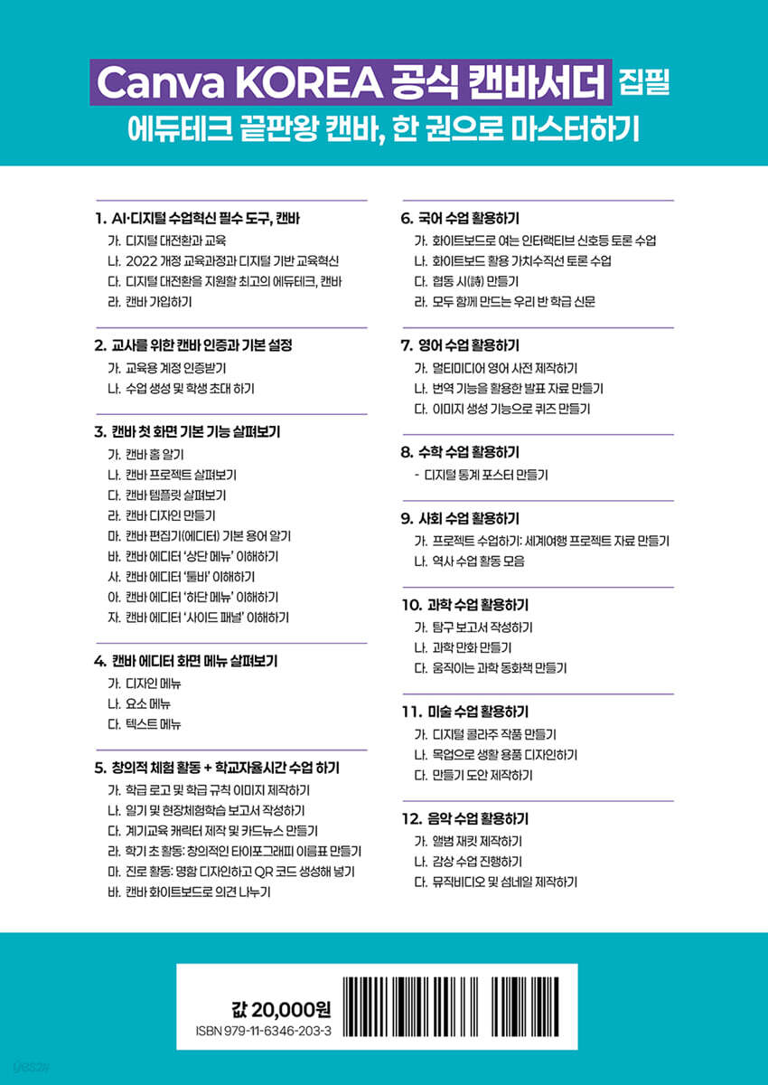 1. AI·디지털 수업혁신 필수 도구, 캔바 가. 디지털 대전환과 교육 나. 2022 개정 교육과정과 디지털 기반 교육혁신 다. 디지털 대전환을 지원할 최고의 에듀테크, 캔바 라. 캔바 가입하기 2. 교사를 위한 캔바 인증과 기본 설정 가. 교육용 계정 인증받기 나. 수업 생성 및 학생 초대 하기 3. 캔바 첫 화면 기본 기능 살펴보기 가. 캔바 홈 알기 나. 캔바 프로젝트 살펴보기 다. 캔바 템플릿 살펴보기 라. 캔바 디자인 만들기 마. 캔바 편집기(에디터) 기본 용어 알기 바. 캔바 에디터 '상단 메뉴' 이해하기 사. 캔바 에디터 '툴바' 이해하기 아. 캔바 에디터 '하단 메뉴' 이해하기 자. 캔바 에디터 '사이드 패널' 이해하기 4. 캔바 에디터 화면 메뉴 살펴보기 가. 디자인 메뉴 나. 요소 메뉴 다. 텍스트 메뉴 5. 창의적 체험 활동 + 학교자율시간 수업 하기 가. 학급 로고 및 학급 규칙 이미지 제작하기 나. 일기 및 현장체험학습 보고서 작성하기 다. 계기교육 캐릭터 제작 및 카드뉴스 만들기 라. 학기 초 활동: 창의적인 타이포그래피 이름표 만들기 마. 진로 활동: 명함 디자인하고 QR 코드 생성해 넣기 바. 캔바 화이트보드로 의견 나누기 6. 국어 수업 활용하기 가. 화이트보드로 여는 인터랙티브 신호등 토론 수업 나. 화이트보드 활용 가치수직선 토론 수업 다. 협동 시(詩) 만들기 라. 모두 함께 만드는 우리 반 학급 신문 7. 영어 수업 활용하기 가. 멀티미디어 영어 사전 제작하기 나. 번역 기능을 활용한 발표 자료 만들기 다. 이미지 생성 기능으로 퀴즈 만들기 8. 수학 수업 활용하기 - 디지털 통계 포스터 만들기 9. 사회 수업 활용하기 가. 프로젝트 수업하기: 세계여행 프로젝트 자료 만들기 나. 역사 수업 활동 모음 10. 과학 수업 활용하기 가. 탐구 보고서 작성하기 나. 과학 만화 만들기 다. 움직이는 과학 동화책 만들기 11. 미술 수업 활용하기 가. 디지털 콜라주 작품 만들기 나. 목업으로 생활 용품 디자인하기 다. 만들기 도안 제작하기 12. 음악 수업 활용하기 가. 앨범 재킷 제작하기 나. 감상 수업 진행하기 다. 뮤직비디오 및 섬네일 제작하기 |