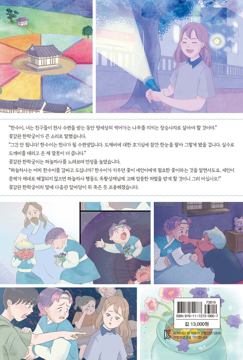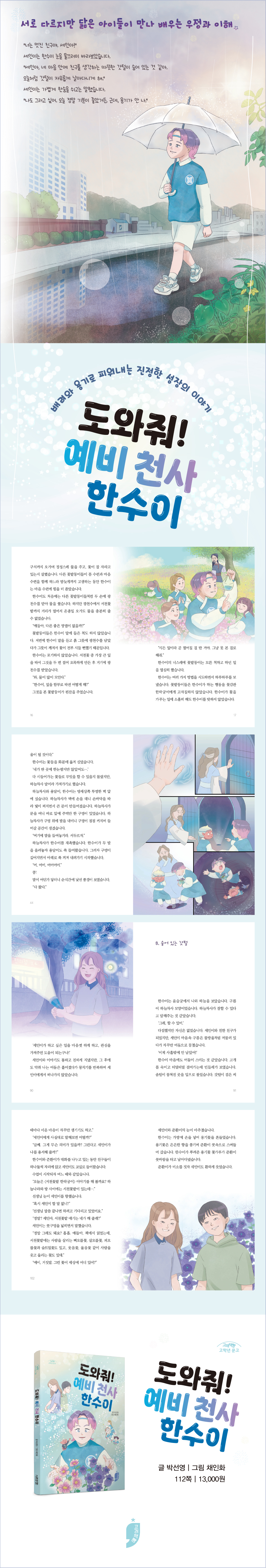 아이들의 혼이 거쳐 가는 하늘나라 서천꽃밭에 21명의 아이들이 도착했습니다. 그 아이들은 신비로운 꽃을 가꾸며 천사 수련을 받습니다. 그 수련생 중 한수이가 있습니다. 한수이는 명랑하고 영특하지만 묵묵히 노력하기보다 잔꾀를 부려 놀고 싶은 마음이 앞섭니다. 그런 한수이의 마음을 안 듯 땅세상에서 온 도깨비 소년 용달이가 찾아옵니다. 한수이는 용달이와 어울리다 수련을 게을리해 서천꽃밭에서 쫓겨날 위기에 처합니다. 한수이는 쫓겨나는 대신 용달이를 땅세상으로 데려다주고 땅세상에서 어려움에 처한 세인이를 도와 어려움을 해결하고 삼칠일(21일) 안으로 돌아오라는 미션을 받습니다. 결국 땅세상으로 내려온 한수이는 전학생이 되어 힘겨운 세인이와 세인이를 괴롭히는 준환이를 만납니다. 한수이는 하루빨리 문제를 해결하려 애쓰지만 일은 꼬여가고 시간은 자꾸만 흘러갑니다. |