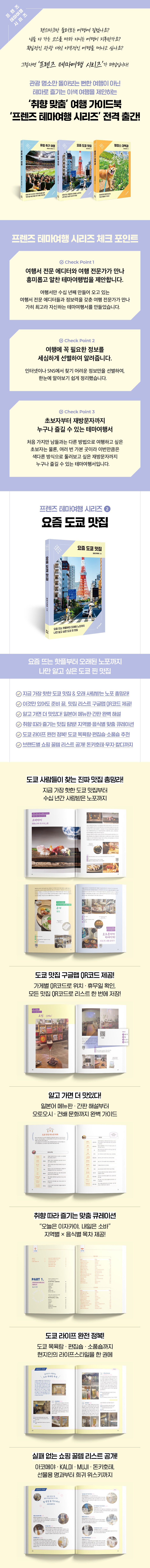 작가의 말 이 책을 사용하는 법 도쿄의 인기 맛집들은 예약이 필수! 도쿄에 가면 이것만은 꼭 먹자! 도쿄 맛집 메뉴판 해독 도쿄 맛집 간판 해독 일본의 독특한 식문화 상황별 일본어 회화 PART 1. 트렌디한 감성과 세련된 감각이 공존하는 곳 도쿄 서부 관광지의 번잡함에서 벗어난 진짜 로컬들의 뒷골목 [01 오쿠시부야 × 오모테산도] 브라세리 비롱 차테이 하토우 리골레토 어태치먼트 고마메 버터밀크 채널 에릭 로즈 카페 도쿄 만화, 피규어, 빈티지 숍이 밀집한 서브컬처 마니아들의 성지 [02 히가시나카노 × 나카노] 센쿠시야 나카나카노 난반테이 머그스 애틱룸 나카노 트라토리아 일 포르넬로 메종 드 무라 외국인들이 많이 찾는 고급 레스토랑과 감각적인 카페가 많은 부촌 [03 히로오 × 니시아자부] 기타폰슈 아마네 모츠에몬 아와비노 겐타 효우키 오데코 갓포R 독립 서점, 소규모 갤러리, 개성 강한 카페가 많은 감성 거리 [04 요요기우에하라 × 시모키타자와] 퀸디 우부 소바 키요세 무사시야 고바야시 다나카 하나레 나도야노 캇테 바쿠마츠 커리 거친 드로잉의 벽화, 소극장, 오래된 책방이 있는 자유로운 영혼들의 놀이터 [05 아사가야 × 코엔지 × 오기쿠보] 인크레더블 커피 돈구리샤 브레드 앤 비스트로 플랫 우나기노 나루세 유게 니코로쿠 네오 차이니스 바 수이켄 전통과 트렌드가 공존하는 스폿 [06 아자부주반 × 히가시아자부] 스시 우미지 스미비야키니쿠 가부토 덴푸라 요코다 약선 카레 신카이 펜톨라C 소바 이자카야 소바고야 히시누마 PART 2. 레트로 감성과 로컬의 일상을 느낄 수 있는 지역 도쿄 동부 갤러리, 공방, 커피 로스터리가 밀집한 떠오르는 도쿄 MZ 스폿 [01 기요스미시라카와 × 료고쿠 × 구라마에] 야카타부네 츠리신 호르몬야키 하세가와 칠아웃 커피 & 레코즈 셰이크 트리 플러스앵글 커피 웍스 오핀 바크 베이크 & 로스트 매클린 올드패션드 다이너 이치카츠 우에노의 양쪽 얼굴, 천천히 걷고 싶은 동네들 [02 네즈·야나카 × 오카치마치·이나리초] 가야바 커피 네즈 우동 카마치쿠 루트 북스 229 네즈쿠리야 키리 스이샤 오래된 노포와 감각적인 카페가 공존하는 따스한 감성의 거리 [03 기타센주 × 미나미센주] 토라후구 테이 가츠오 비스트로 2538 겐다야 네오반자이 다트 업 스시 에비스 서민적인 이자카야 문화가 살아 있는 동네 [04 아카바네] 테라테라 아카바네 레체 아카바네 센베로 니쿠마레야 하나레 긴메노도구로야 토리오 말라에키 하레루야 PART 3. 전통과 현대가 공존하는 역사와 문화의 중심지 도쿄 도심 에도 시대의 정취가 남아 오래된 가게와 로컬 시장이 있는 동네 [01 닌교초 × 스이텐구마에] 브라더즈 바이론베이 커피 파크렛 베이커리 일 마레 블루 닌교초 다니자키 만요켄 다테노쿠라 중고 서점과 오래된 카레 맛집이 가득한, 헌책과 카레의 거리 [02 간다 × 진보초] 본디 카레 산코엔 교자 쿠오레 도로 미스터 해피 미소테츠 카기로이 바카우마 숙성 와규 야키니쿠 에이징 비프 와테라스 프랑스 사람들이 자리를 튼 도쿄 속 작은 유럽 [03 가구라자카 × 이이다바시] 카날 카페 아카 아마 커피 위켄더스 커피 올라이트 플람므 플람므 라 프로슈테리아 비스트로 플랜 쿨 와쇼쿠비요리 오사케토 도쿄 타워가 가까이 보이는 숨은 맛집의 거리 [04 다이몬 × 하마마츠초] 자호 커피 로스터 & 와인 바 __이즈 라이프 유메이덴 PST 히가시 아자부 와라야키야 료마노토 하마마츠초 키친 에치고 사카보 하카이산 조용한 신사와 클래식한 분위기가 돋보이는 도심 속 힐링 공간 [05 요츠야 × 이치가야] 패시지 커피 기타신치 토리야 겐지 후쿠노토리 소토보리도리 피제리아 트라토리아 니타나 엘 치링기토 토로포 부록 [요즘 도쿄 꿀템 & 히든 스폿] · 현지인이 사랑하는 도쿄 목욕탕 추천 · 일본 전국의 쌀, 솥밥 키트를 만날 수 있는 쌀 편집 숍 아코메야 · 위스키 쇼핑, 돈키호테 말고 여기 가세요! M 긴자 위스키 박물관 · 돈키호테, 편의점보다 실속 있는 도쿄의 마트를 소개합니다 · 스프레드, 소스의 성지! KALDI에서 뭘 사야 할까 · 한국보다 저렴한 일본 MUJI, 실패 없는 꿀템 추천 · 만능 셀렉트 숍 돈키호테의 숨은 꿀템 · 도쿄역 지하, 그란스타는 선물용 명과의 성지 · 감성과 실용성을 담은 도쿄 사람만 아는 숨은 꿀템들 · 계절을 따라 걷는 도쿄 계절별 명소 |