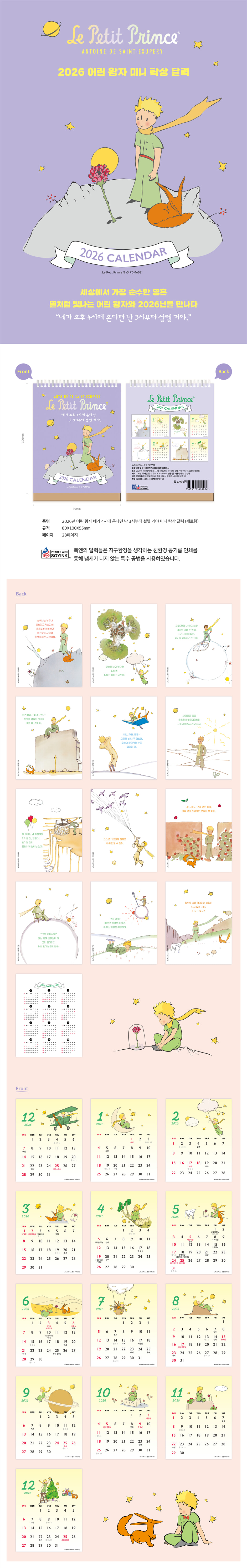 전 세계 독자들의 사랑을 받아온 명작 《어린 왕자》가 특별한 모습으로 새해를 밝힙니다. 손바닥 안에 쏙 들어오는 80×100 사이즈의 미니 달력으로 제작되어, 언제 어디서나 어린 왕자의 따뜻한 이야기를 곁에 두고 즐길 수 있습니다.