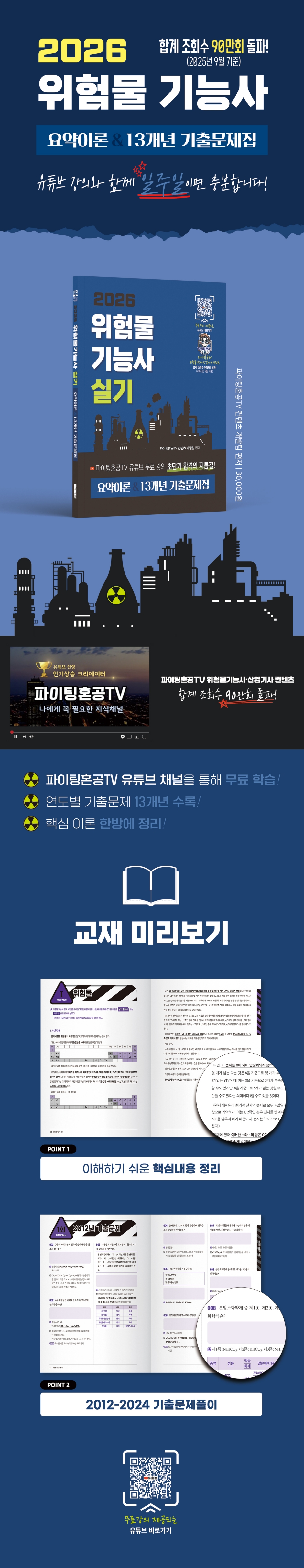 〉Ⅰ. 위험물 - 이온결합 12 - 제1류 위험물 15 - 제2류 위험물 16 - 제3류 위험물 17 - 제4류 위험물 18 - 제5류 위험물 22 - 제6류 위험물 23 - 구조식 24 〉 Ⅱ. 각종의 반응식 - 연소반응식 27 - 물과의 반응식 29 - 분해반응식 32 - 기타물질반응 33 〉 Ⅲ. 필수 암기 개념 - 기초 개념 35 - 화재와 소화 36 - 위험물의 저장/운반/취급 등의 관리 38 - 위험물안전관리법령 사항 44 기출 문제 풀이 〉 2012년 46 〉 2013년 61 〉 2014년 75 〉 2015년 91 〉 2016년 106 〉 2017년 124 〉 2018년 139 〉 2019년 154 〉 2020년 168 〉 2021년 190 〉 2022년 214 〉 2023년 241 〉 2024년 268 2024 개정 부록 298 |