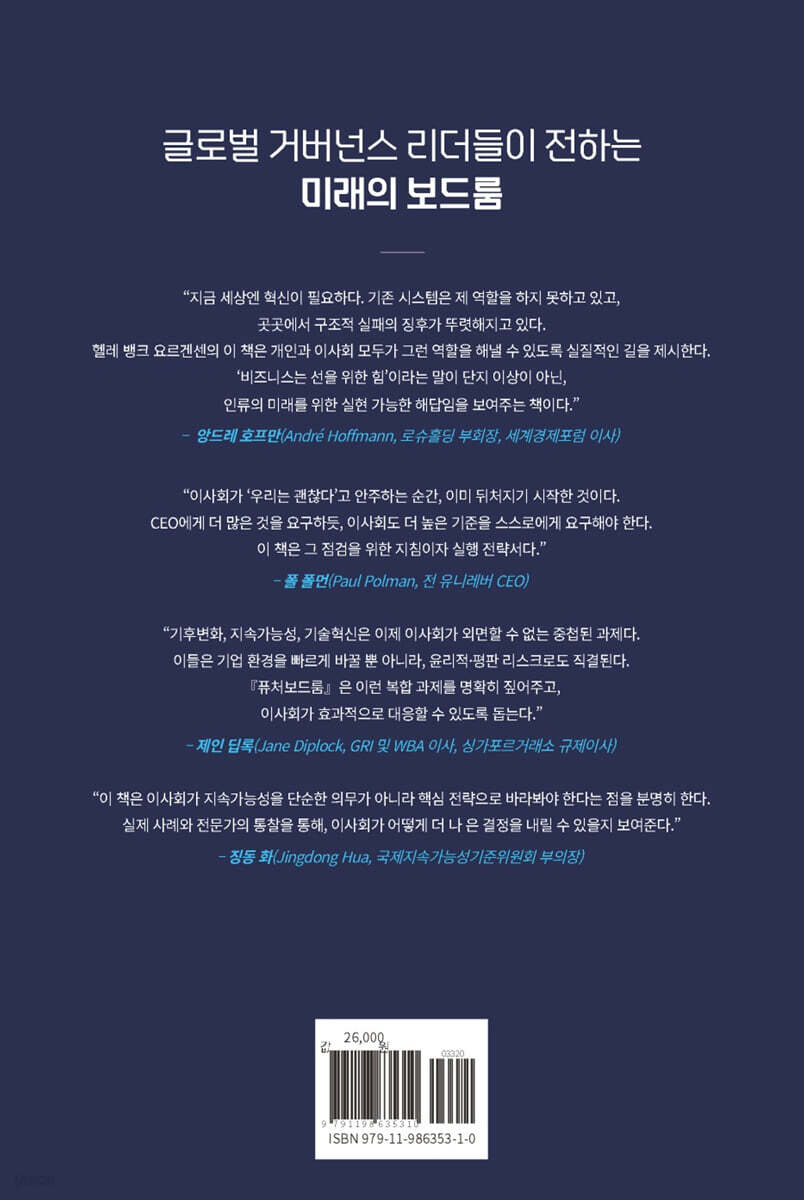 --- p.34, 「1장. 이사회를 덮친 변화의 폭풍」 중에서 각국 규제당국은 이사회 감독, 기업 투명성, 공시 품질 등 핵심 이슈를 더욱 면밀히 들여다보고 있으며, 국경을 넘는 기준을 제시하는 비정부 기구들의 활동도 한층 활발해지고 있다. 이런 흐름 속에서 이사회는 규제 환경의 변화를 예의주시하고, 가능하다면 한발 앞서 대응 전략을 세워야 한다. --- p.46, 「1장. 이사회를 덮친 변화의 폭풍」 중에서 무엇보다 이사회 진입의 문턱은 점점 높아지고 있다. 다양성을 확보하려는 요구가 강해지는 가운데, 특정 분야의 전문가보다 넓은 시야와 통찰을 갖춘 ‘제너럴리스트’를 선호하는 흐름도 뚜렷해지고 있다. 그만큼 자리를 둘러싼 경쟁 역시 치열해질 수밖에 없다. --- p.73, 「2장. 새 판을 짜야 할 때」 중에서 이사회가 가장 먼저 해야 할 일은 ‘이사회 역량 매트릭스(BSM)’를 구축하는 것이다. 필요한 전문성과 경험이 무엇인지 명확히 정리하고, 그 기준에 따라 적임자를 선임하는 것이 출발점이다. 이사회의 규모나 위원회 권한은 그 이후에도 정할 수 있다.. --- p.117, 「4장. 미래로 가는 로드맵」 중에서 국민연금의 영향력은 단순한 견제 수준을 넘어선다. 현재 국내 주식 약 160조 원을 장기 보유하고 있으며, 5% 이상 지분을 가진 상장사가 280곳이 넘는다. 기업별 평균 지분율도 6% 이상으로, 다수 상장사에서 실질적인 ‘거부권을 가진 주주’로 기능하고 있다. 실제로 일부기업에서는 국민연금의 반대 한 표로 이사 선임이 무산될 수 있다는 위기감이 현실화되고 있다. --- p.253, 「보드룸 실행노트」 중에서 이번 개정은 그 적용 범위를 ‘회사’에서 ‘주주 전체’로 확대하고, ‘전체 주주의 공평한 대우’, ‘총주주의 이익 보호’라는 문구를 신설함으로써, 소수주주 보호를 이사회의 명시적 책무로 격상시켰다. 특히 지배주주와 일반주주의 이해가 충돌하는 상황에서 이사가 합리적 근거 없이 특정 편익에 기대어 판단할 경우, 주주대표 소송이나 업무상 배임 등 법적 책임이 현실화될 수 있다. --- p.254, 「보드룸 실행노트」 중에서 이제 주총은 더 이상 의안을 통과시키는 요식행위가 아니다. 기업의 판단이 신뢰받을 수 있는지 시장 앞에서 입증받는 자리다. 중요한 것은 ‘무엇을 결정했는가’가 아니라, ‘왜 그렇게 결정했는가’를 구조적으로 설명할 수 있느냐다. 이를 위한 체계가 없다면, 어떤 이사회도 위기 상황을 버텨낼 수 없다. --- p.262, 「보드룸 실행노트」 중에서 |