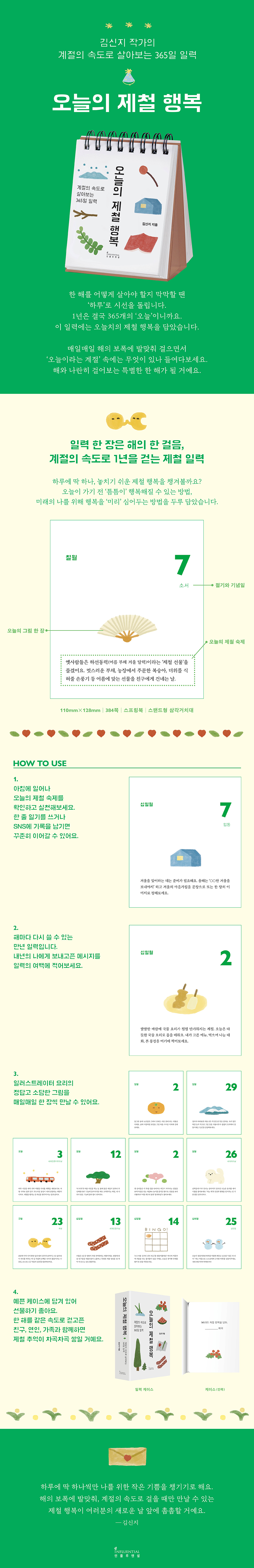 《제철 행복》 김신지 작가의 365일 일력 지금 계절이 주는 풍경을 놓치지 않고 사는 삶에 대해 이야기하며 많은 사랑을 받은 김신지 작가의 에세이 《제철 행복》이 365일 늘 곁에 두고 함께할 수 있는 일력으로 돌아왔다. 누구보다 제철에 진심인 사람, 김신지 작가에게는 해마다 반복하는 작은 ‘연례행사’가 많다. 벚꽃이 지는 시기에 북쪽으로 떠나 벚꽃을 배웅하고, 망종 무렵에는 부지런히 밖에 누워본다. 장마철에는 그만의 ‘비멍당’을 찾고 가을에는 좋았던 캠핑장을 다시 방문하며 매일 산책길에 만나는 새, 구름, 눈사람 사진도 수집한다. 지금을 놓치면 다시 한참을 기다려야 하는 크고 작은 기쁨들을 챙기다 보면 1년이 바쁘다. ‘제철 행복’의 첫 단추는 바로 지금 지나고 있는 계절을 들여다보는 일. 봄·여름·가을·겨울의 사계절을 스물네 개의 작은 계절인 절기로 쪼개어 더 자주 행복을 누릴 수 있다면, '오늘'이라는 최소 단위의 계절도 있지 않을까? 《오늘의 제철 행복》에는 하루 한 장, 오늘치의 제철 행복을 담았다. 김신지 작가가 제안하는 제철 숙제들을 따라가다 보면, 해의 보폭에 맞추어 계절의 속도로 사는 한 해를 경험하게 될 것이다. 오늘이라는 계절을 걷는 이에게 보내는 다정한 안부 《오늘의 제철 행복》과 함께 우리만의 연례행사 만들기 《오늘의 제철 행복》은 하루에 딱 하나, 나를 위한 작은 기쁨을 챙기는 방법을 알려준다. 매일 아침 일력을 넘겨 오늘의 제철 숙제를 확인하고, 하루 동안 실천해보자. 이맘때 하면 좋은 자연 관찰이나 활동, 제철 식재료 소개는 물론, ‘호미씻이’ ‘등고망원’ 같은 오래된 풍속을 실천해보는 미션까지 알차게 담겨 있다. 《오늘의 제철 행복》은 만년 일력으로 한번 구입하면 해마다 다시 사용할 수 있다. 여백에 메모를 적어 다음 해에 확인하는 즐거움, 작년에 좋았던 일을 반복하며 나만의 연례행사를 만들어가는 재미도 선사한다. 다양한 제철 숙제와 함께 실린 일러스트레이터 요리 작가의 귀엽고 정겨운 그림은 입가에 미소를 더한다. 계절을 함께 즐기고 싶은 누군가가 떠올랐다면? 일력은 받는 사람의 이름과 메시지를 적을 수 있는 예쁜 상자에 담겨 있어 선물하기에도 좋다. 길거리 간식 빙고, 여름 과일 빙고 채우기, ‘오늘의 귀여움’ 사진 찍어 보내기, 부채 등 여름 선물 하기, ‘동지 파티’ 하기 등 여럿이 함께하면 더욱 즐거운 미션도 풍성하다. 친구, 연인, 가족과 한 해를 같은 속도로 걸으며 오늘의 제철 숙제로 안부를 나누고, 제철 추억을 차곡차곡 쌓아보자. |