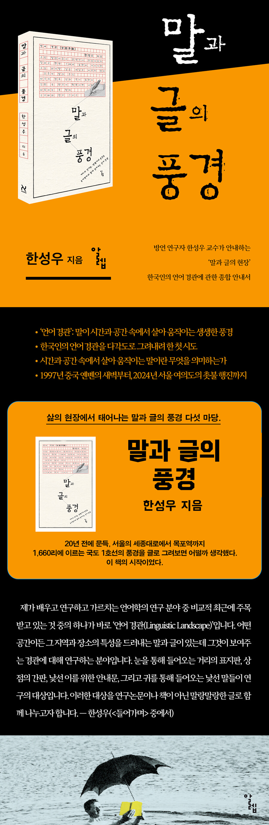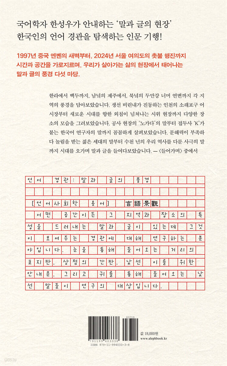 한국어 중에서도 방언(사투리)을 주로 연구하는 한성우 교수는 30년 넘게 국내외 여러 곳에 방언 조사를 다녀왔다. 그리고 20년 전에 문득, 서울의 세종대로에서 목포역까지 1,660리에 이르는 국도 1호선의 풍경을 글로 그려보면 어떨까 생각했다. 이 책의 시작이었다. 그리고 지난해 1년 동안 실제로 그 풍경을 탐사하면서 글을 썼다. 한라에서 백두까지, 남녘의 제주에서 북녘의 두만강 너머 옌볜까지 각 지역의 풍경을 담아보았고, 생선 비린내가 진동하는 인천의 소래포구 어시장부터 새로운 시대를 향한 외침이 넘쳐나는 시위 현장까지 다양한 장소의 모습을 그려보았다. 공사 현장의 ‘노가다’의 말부터 접두사 ‘K’가 붙는 한국어 연구자의 말까지 꼼꼼하게 살펴보았고, 문해력이 부족하다 놀림을 받는 젊은 세대의 말부터 수천 년의 우리 역사를 다룬 사극의 말까지 시대를 오가며 말과 글을 들여다보았다. 시간과 공간 속에서 살아 움직이는 말이란 무엇을 의미하는가 이 책을 통해 저자는 지금 여기 한국어의 언어 경관을 그려내면서, 몇 가지 통찰을 전해 준다. 먼저, 언어는 살아 있는 풍경이란 점이다. 말과 글은 단순히 문법과 어휘의 집합이 아니라, 거리의 간판, 시장의 소음, 병원의 대화 등 구체적인 삶의 현장에서 보고 들을 수 있는 ‘경관’이다. 이 경관은 그곳에 사는 사람들의 정체성과 문화를 반영하는 살아 있는 유기체다. 둘째, 모든 말은 고유한 가치를 지닌다. 표준어 중심의 위계적 언어관을 탈피하여 제주 방언, 건설 현장의 ‘노가다’ 용어, 청년 세대의 신조어 등 모든 형태의 말이 그 자체로 소중하고 가치 있음을 강조한다. 언어의 오염이나 파괴가 아닌, 자연스러운 변화와 융합의 과정으로 이해해야 한다. 규범보다 소통이 먼저다. 언어의 궁극적인 목적은 소통에 있다. ‘금일’을 모르는 세대에게는 ‘오늘’을 쓰는 것이 맞으며, 복잡한 띄어쓰기 규정에 얽매이기보다 의미 전달에 집중해야 한다고 주장한다. 언어 정책과 교육 역시 현실 사용자의 눈높이에 맞춰야 한다. 언어는 사회문화적 맥락의 산물이다. 야구장의 응원 구호, 시위 현장의 피켓 문구, 노래 가사의 변천 등 다양한 사회문화적 현상을 통해 언어가 어떻게 시대를 반영하고 공동체의 정서를 담아내는지를 분석한다. 글로벌 시대의 한국어는 융합의 언어다. K-문화의 확산과 함께 세계로 뻗어나가는 한국어의 위상을 조명하며, 외국어와의 혼용을 부정적으로만 볼 것이 아니라 새로운 가치를 창출하는 역동적인 과정으로 파악한다. 1997년 중국 옌볜의 새벽부터, 2024년 서울 여의도의 촛불 행진까지 시간과 공간을 가로지르며, 우리가 살아가는 삶의 현장에서 태어나는 말과 글의 풍경 다섯 마당. 언어 경관(말과 글의 풍경)을 그려내기 위해, 저자는 명확한 구도를 세운다. 그 구도의 두 축은 시간과 공간이다. 세월의 흐름에 따라 말과 글이 달라지며, 같은 시대를 살더라도 다른 공간에서는 다른 말과 글이 쓰인다. 가정에서, 일터에서, 모임에서 각기 다른 말을 쓴다. 언어를 연구하는 이들은 이러한 다양한 말을 차례로 시간방언, 지역방언, 사회방언이라 한다. 저자는 이런 것들이 말과 글을 그린 풍경화의 기본적인 구도가 된다고 설명한다. 1부에서는 이 땅의 모든 말과 글을 찾아 떠나본다. 남쪽 끝 제주도에서 북쪽 끝 백령도까지, 그 사이에도 수없이 많은 지역의 서로 다른 말들이 있다. 전국 각지로 연결되는 서울역에서 기차를 타고 가다 보면 산은 보이지 않고 오로지 하늘과 맞닿은 땅만 보이는 김제와 만경의 들에서 쓰이는 말과 글도 살펴본다. 그리고 어느 순간부터 우리의 머릿속에서 잊힌 북녘땅의 말도 들여다보면서 통일 이후의 말과 글에 대한 생각도 펼쳐 본다. 1부의 첫 풍경은 제주의 말을 그려냈다. 살아 있는 언어로서의 제주어를 다루면서, 저자는 제주어가 ‘오염’되거나 ‘소멸’하고 있다는 우려에 반대한다. ‘ㅁㆍㄹ(馬)’이 ‘몰’로 변하는 것은 제주어만의 고유한 변화이며, 언어를 박물관에 가두려는 시도는 오히려 언어의 생명력을 해친다고 비판한다. 또, 제주도민은 제주어와 표준어를 모두 구사하는 이중언어 화자로서 소통 준비가 되어 있음을 강조한다. 문제는 제주어를 이해하려는 노력 없이 방문하는 ‘뭍엣것’에게 있다고 신랄히 지적한다. 드라마 「우리들의 블루스」, 「웰컴투 삼달리」 등이 완벽한 제주어를 구사하지는 않더라도, 제주어가 특별하고 알아들을 수 없는 말이 아니라는 인식을 확산시켜 소통의 가능성을 열었다는 점에서 대중문화의 역할을 긍정적으로 평가한다. 2부에서는 삶의 향기가 스며 있는 곳을 찾아 발품을 팔아본다. 삶은 곧 ‘먹고 사는 것’이니 수많은 먹거리들이 오가는 어시장(소래포구)이 가장 먼저이다. 누군가를 기다리며 향기로운 커피를 마시던 추억을 되살리기 위해 ‘그야말로 옛날식 다방’에도 오랜 시간 앉아 있어 본다. 과거에는 건달들의 놀이터로 인식되던 당구장, 남녀노소를 불문하고 응원의 목소리를 높이는 야구장을 찾아, 오고 가는 말과 글도 담아본다. 가지 않는 것이 좋지만 건강하게 오래 살기 위해서 가야 하는 병원, 그리고