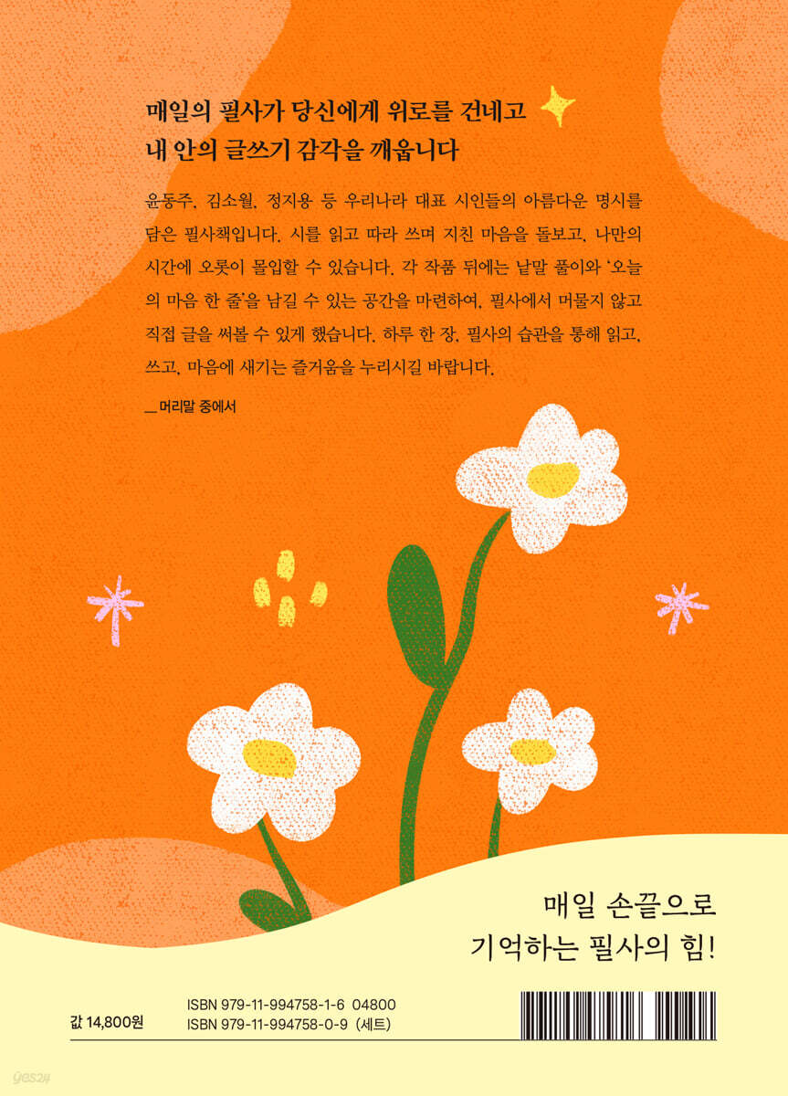 하루 한 장, 읽고 따라 쓰며 마음을 다독여요 매일 한 편의 시를 옮겨 쓰는 일은 단순한 기록을 넘어, 마음을 다독이고 삶의 리듬을 가다듬는 따뜻한 습관이 됩니다. 《하루 한 장 마음을 돌보는 한국 명시》는 윤동주, 김소월, 정지용, 한용운, 김영랑 등 우리나라 대표 시인 7명의 명시를 엄선하여 담은 필사책입니다. 하루에 한 편의 시를 쓰고, 마음속에 되새기다 보면 아름다운 시어와 운율이 내 안에 조용히 스며듭니다. 시를 한 자 한 자 정성 들여 쓰는 동안 소란스러운 마음은 고요히 가라앉고, 오롯이 나만의 시간에 몰입할 수 있습니다. 이 책은 바쁜 하루 속에서도 잠시 멈추어 숨 고르기를 하게 하는 작은 쉼표가 되어 줄 것입니다. 매일의 필사로 글쓰기 근력을 기르고 잠들어 있던 어휘력을 깨우세요 각 작품 뒤에는 낱말 풀이와 ‘오늘의 마음 한 줄’을 남길 수 있는 공간을 마련해 필사에서 그치지 않고 글쓰기로 이어갈 수 있게 했습니다. 하루 한 장의 필사 습관은 어휘력을 키우고 글쓰기 근력을 길러 줍니다. 시 속에 담긴 문장 부호와 단락 구분, 조사 하나에도 시인의 의도가 깃들어 있음을 주의 깊게 살펴볼 수 있도록 원문을 최대한 살렸습니다. 다만 독자의 이해를 돕기 위해 일부 작품에는 현대어 표기를 적용했습니다. 또한 자세한 낱말 풀이를 덧붙여 새로운 시어와 표현을 발견하고, 글쓰기의 폭을 확장할 수 있도록 세심하게 구성했습니다. 4개의 주제별 구성으로 여러 빛깔의 시를 만나 보세요 《하루 한 장 마음을 돌보는 한국 명시》는 장별로 주제를 나누어 시를 묶었습니다. ‘1장 시가 나에게 말을 걸다’에서는 필사하기 쉬운 시를 모아 누구나 부담 없이 필사를 시작할 수 있으며, 삶의 사색과 위로가 담긴 시들을 만납니다. ‘2장 마음에 등불을 켜다’는 용기와 성찰을 전하는 작품들을 통해 지친 마음을 다독이고 희망의 불빛을 밝혀 줍니다. ‘3장 동심으로 돌아가다’에는 어린 시절의 순수함을 되살리며 마음을 맑게 하는 시들을 담았습니다. 마지막으로 ‘4장 고요한 풍경에 머물다’에서는 자연과 계절의 노래를 따라 쓰며 분주한 일상에서 잠시 벗어나 고요한 평온을 누릴 수 있습니다. 이 책의 활용과 특징 1. 한국 대표 시인 7명의 명시를 엄선하여 수록 윤동주, 김소월, 정지용, 한용운, 김영랑 등 우리나라를 대표하는 시인 7명의 아름다운 시 가운데 필사하기 알맞은 작품을 고르고 골라 실었습니다. 2. 하루 한 장, 필사를 통한 자기돌봄 필사할 때는 책의 순서를 따르지 않아도 괜찮습니다. 여러 편을 한꺼번에 쓰기보다 그날 마음에 와닿는 시를 골라 한 편씩 필사하며 마음을 다독이고, 치유와 몰입의 시간을 경험해 보세요. 3. 매일의 필사와 한 줄 쓰기로 만드는 글쓰기 습관 필사 뒤에는 마음에 남은 낱말이나 장면으로 짧은 글을 적어 보세요. 같은 제목으로 새롭게 시를 쓰거나, 하루의 감정과 연결해 한 줄 일기를 남기며 글쓰기 감각을 단단히 키울 수 있습니다. 4. 어휘와 문장을 수집하며 어휘력 확장 작품마다 덧붙인 낱말 풀이와 책 뒤의 ‘나만의 어휘 수집 노트’를 통해 기억하고 싶은 표현을 기록할 수 있습니다. 자주 꺼내 읽으면 나의 언어로 되살아나고, 글쓰기에 필요한 어휘 자산으로 차곡차곡 쌓입니다. 5. 필사를 돕는 다양한 줄노트 디자인 필사에 적합한 줄노트 쓰기란을 마련했습니다. 색연필선, 점선, 물결선 등 다양한 형태의 줄노트를 편집하여 반복되는 필사에 작은 재미를 더했습니다. |
