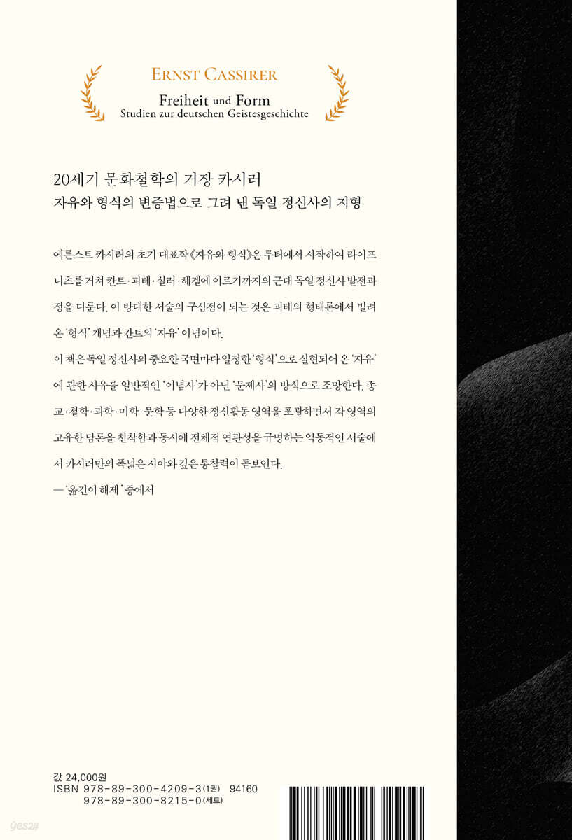 루터에서 시작하여 라이프니츠, 칸트, 괴테, 실러, 헤겔의 철학을 넘나드는 카시러의 통찰은 독일 정신사라는 광활한 바다에서 유연하게 헤엄치는 물고기의 움직임을 보는 듯하다. 카시러는 각 사상가들의 세계에 카시러 본인이 먼저 흠뻑 젖어든 다음, 한 발짝 물러서서 그가 경험한 세계를 펼쳐 보인다. 여느 정신사처럼 각 사상가의 철학에 과하게 개입하여 단정하거나 단순 나열 혹은 요약하는 양극적인 방식을 지양한다. “추상적인 철학적 공식으로 미리 규정하려 들지 않고 독일 정신사의 ‘활동과 수난’ 자체를 통해 독일 정신의 본질을 간접적으로 서술”(1권 17쪽)한다. 일정한 흐름 없이 난장으로 존재하던 각각의 철학 세계를 하나의 지도 안에 그려 내어 독일 지성사의 지형을 가늠하는 카시러만의 독창적인 독일 정신사 연구는, 카시러가 후에 전개하고 확립한 상징철학의 주요 골자인 ‘세계를 창조하고 해석하는 인간의 창조 능력’을 그 자체로 증명해 낸다. 10년간의 연구, 독창적 통찰과 집요한 사유의 기록 카시러의 첫 저작의 출간 시기(1902)를 감안했을 때, 《자유와 형식》(1916)은 최소 10년간의 연구가 수렴된 것으로 보인다. 카시러의 노트와 강의안을 보면, 1900년대 중반부터 괴테와 칸트, 헤르더의 철학을 연결하는 작업을 해왔음을 알 수 있다. 이 책을 집필하기 위해 그러모은 저서 및 논문부터 편지, 대화록, 메모로 빼곡한 참고문헌 목록에서 경계를 넘나드는 카시러만의 집요한 성실함이 보인다. 카시러는 철학 개념 하나하나에 집요하게 파고들다가도 금세 멀찍이 떨어져서 전체적 조망을 그린다. 대담한 붓질로 전체상을 그려 내는 동시에 베일 듯 섬세한 선으로 개념 하나하나를 규명하며, 거시적 조망과 미시적 분석 사이를 유연하게 오가는 지적 사유에서, 젊은 학자의 번뜩이는 통찰력과 맹렬한 탐구심이 느껴진다. 철학사의 고전으로 남을 카시러의 독일 정신사 연구 집필의 말미, 카시러의 ‘자유’에의 탐구는 1차 세계대전이라는 전대미문의 전란을 만나 철학의 경계를 넘어 인본주의적 사유로 비약적인 확장을 경험한다. 국가와 민족의 생존 앞에서 인간의 자율성이 구석으로 내몰리는 전쟁의 상황을 몸소 겪으며, 카시러는 《자유와 형식》의 집필에 치열히 몰두한다. 전쟁의 광기, 극단적 민족주의의 담론 속에서도 자유의 가치를 끝까지 수호하며, 전쟁이라는 절대적 폭력 앞에 자유의 자리를 지킬 수 있는 길을 찾기 위해 깊이 고뇌하고 분투한다. 《자유와 형식: 독일 정신사 연구》는 카시러가 신칸트학파 대표 철학자에서 문화철학의 거장으로 건너가는 길목에 세운 초석과도 같다. 그는 자신이 구축하고자 하는 철학 세계를 ‘독일 정신사’라는 장대한 연구를 통해 서사적으로 재현해 내며, 젊은 학자로서의 기개와 포부, 성실함을 여실히 보여 주었다. 카시러 사유의 원형을 보여 줄 뿐만 아니라 독일 정신사의 흐름을 역동적으로 담아낸 《자유와 형식》은 철학사의 고전으로 남을 것이다. |