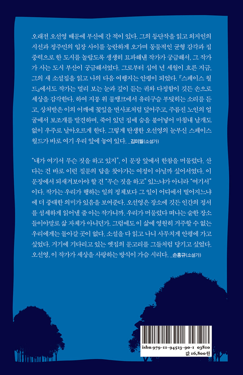나는 소설가 오선영을 만난 적이 없다. 그러나 고백하건대 오래전 오선영 때문에 부산에 간 적이 있다. 그의 등단작을 읽고 외지인의 시선과 정주민의 입장 사이를 능란하게 오가며 동물적인 균형 감각과 집중력으로 한 도시를 놀랍도록 생생히 묘파해낸 작가가 궁금해서, 그 작가가 사는 도시 부산이 궁금해서였다. 그로부터 십여 년 세월이 흐른 지금, 그의 새 소설집을 읽고 나의 다음 여행지는 안평이 되었다. 『스페이스 월드』에서도 작가는 멀리 보는 눈과 깊이 듣는 귀와 다정함이 깃든 손으로 세상을 감각한다. 하여 지붕 위 물탱크에서 유리구슬 부딪히는 소리를 듣고, 상처받은 이의 어깨에 꽃잎을 면사포처럼 덮어주고, 주름진 노인의 얼굴에서 보조개를 발견하며, 죽어 있던 집에 숨을 불어넣어 마침내 날개도 없이 우주로 날아오르게 한다. 그렇게 탄생한 오선영의 눈부신 스페이스 월드가 바로 여기 우리 앞에 놓여 있다. - 김미월 (소설가)