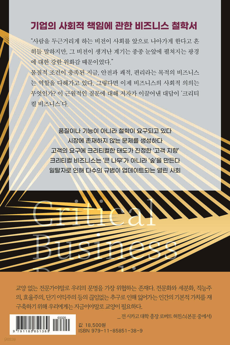 비즈니스가 지닌 잠재력은 헤아릴 수 없다. 단순한 상품이나 서비스를 제공하는 수단 이상으로 우리의 생활과 가치관, 사회 본연의 모습에 큰 영향을 미친다. 그러므로 나는 비즈니스가 지닌 이 힘을 사회적인 과제나 문제점 해결에 활용하는 것이 좋다고 본다. --- p.28 크리티컬 비즈니스의 이니셔티브는 반드시 새로운 문제를 제기하는데, 이 문제는 관찰을 통해 새롭게 발견되는 것이 아니라 많은 사람들이 당연하게 여기며 받아들이고 있던 사상이 비판적으로 고찰되고 현재와는 다른 이상적 모습이 제시되어야 비로소 생성된다. 따라서 크리티컬 비즈니스가 시작되는 과정에서 고객을 비롯한 이해관계자에게는 반드시 어떠한 가치관과 세계관의 전환이 일어나기 마련이다. --- p.43 결론적으로 정리하면, 어퍼머티브 비즈니스 패러다임으로 고객의 느슨한 니즈나 욕구에 계속해서 순응한다면 결국 사회 전체의 풍경이 느슨한 방향으로 끌려가고, 이는 또한 그 시장의 글로벌 경쟁력 상실로도 이어진다. 그러므로 현재 우리는 고객의 미적, 윤리적 감성을 끌어올릴 수 있는 크리티컬 비즈니스 패러다임이 필요하다. --- p.50 크리티컬 비즈니스는 단순히 경제적인 이익을 추구할 뿐만이 아니라 사회적인 변혁과 가치 실현을 목적으로 하고 있다. 그래서 기존의 비즈니스 모델에서 자주 보이는 ‘점유율 쟁탈은 제로섬 게임’의 사고방식과는 다른 접근법, 즉 ‘시장 전체를 늘리는 플러스섬 게임’을 추구한다. 패러다임이 아예 다르다. --- p.62 역사는 전진하는 것만으로 전개되지 않는다, 역사는 눈앞에 전개되는 광경에 대한 혐오감이나 위화감이 쌓이는 과정에서 전개되어 간다는 것이 벤야민의 주장이다. 사람을 두근거리게 하는 비전이 사회를 앞으로 나아가게 한다고 흔히들 말하지만, 그 비전이 생겨난 계기는 종종 눈앞에 펼쳐지는 광경에 대한 강한 위화감 때문이었다. --- p.77 ‘반항적인 것’은 사회의 본질적인 가치를 지닌다. 크리티컬 비즈니스는 이 반항적 정신을 구현하고 사회에 책임을 지며 개선을 목표로 하는 데 힘이 될 수 있다. 카뮈의 철학을 크리티컬 비즈니스에 적용함으로써 기업은 단순히 경제 활동의 주체일 뿐만이 아니라 사회적 정의와 윤리를 추진하는 데 있어서도 중요한 역할이 가능해진다. 반항은 과거의 부정을 인정하고 더 나은 미래를 만들기 위한 첫걸음이다. --- p.79 크리티컬 비즈니스 추진의 엔진이 되는 것은 경제적 이득에 대한 기대가 아니라 사회적 문제 해결에 대한 기대다. 자본주의에 원리적 고찰을 남긴 철학자 애덤 스미스는 저서 『도덕 감정론』에서 사회를 움직이는 것은 ‘타인과의 공감에 기초한 도덕’이라고 지적했다. 사회가 본래 공감에 의해서 움직이는 것이라면, 크리티컬 비즈니스를 실천하는 사람은 이것을 자원으로 크게 활용해야 한다. --- p.161 이미 말했듯, 사회는 다수가 아니라 오히려 소수의 주장에 의해 변화한다. 사회의 지배적 가치관이나 규범에 대해 일탈자, 소수가 반기를 들면 그동안의 안정된 환경과 시스템이 흔들리는 상태에 놓인다. 소수와 다수 사이에 생기는 그러한 대립은 결국엔 다음의 안정 상태를 만들어 가고, 그렇게 사회는 변천해 간다. 여기서 말하는 ‘열린 사회’란 그런 의미이다. 만약 기존의 규범을 모두가 준수하고 누구도 반항하지 않는다면 사회는 지극히 안정적이고 질서는 있겠지만 변화는 일어나지 않고 역사는 거기서 멈춘다. 언제까지나 똑같은 가치관이 규범으로서 강한 권위를 가지는 사회는 범죄가 발생하지 않을지는 모르나 창조 또한 발생하지 않는다. --- p.211~212 |