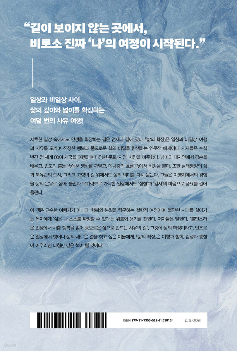 낯선 길 위에서 나를 만나는 시간, 세상 끝에서 발견한 내 안의 풍경! 세상 여행: 낯선 길 위에서 배운 깨달음 낯선 길 위에서 만난 사람과 자연, 문화는 내면의 거울이 되어 삶의 깊이를 넓혀준다. 전 세계 곳곳의 여정을 통해 진정한 자유와 풍요, 그리고 삶의 본질을 다시 묻는다. 마음 여행: 내면으로 향한 또 다른 여정 평범한 일상 속에도 인생의 답은 숨어 있다. 익숙한 풍경 속에서 새로운 시선과 감사의 마음을 발견하며, 불만을 넘어 성찰로 나아가는 내면의 여행을 그린다. |