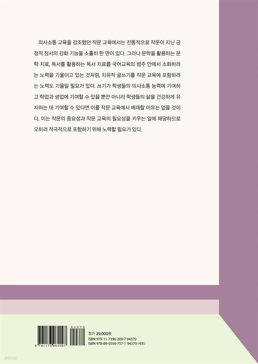 제1장 작문 교육의 필요성과 방향 1. 작문 교육이 필요한 이유 2. 글을 잘 쓰기 위한 원리 3. 작문의 기능 및 특성 제2장 작문 이론의 전개 1. 형식주의 작문 이론의 전개 과정 2. 인지주의 작문 이론의 전개 과정 3. 사회구성주의 작문 이론의 전개 과정 4. 표현주의 작문 이론의 전개 과정 5. 대화주의 작문 이론의 전개 과정 제3장 작문 능력의 인지적 요인 1. 작문 지식 2. 작문 기능 및 전략 3. 상위인지 전략 제4장 작문의 정의적 요인 1. 정의적 요인이 중요한 이유 2. 정의적 요인에 관심이 적었던 이유 3. 쓰기 동기 4. 쓰기 효능감 5. 쓰기 불안 6. 쓰기 윤리 제5장 작문 능력의 발달 1. 기초 문해력으로서의 작문 발달 2. 고등 사고력으로서의 작문 발달 제2부 작문 교육의 실천적 방법 제6장 작문 과정과 전략 1. 작문의 과정과 특성 2. 작문의 인지 과정 모형 3. 작문 과정에 따른 전략 제7장 작문 교육과정 1. 교수요목기 2. 제1차~제3차 국어과 교육과정 3. 제4차 국어과 교육과정 4. 제5차~제7차 국어과 교육과정 5. 2007~2015 국어과 교육과정 6. 2022 국어과 교육과정 제8장 작문 교과서 1. 단원 조직 방식 2. 대단원 구성 방식 3. 소단원 구성 방식 4. 쓰기 이론?전략의 교과서 적용 실제 5. 작문 교과서 재구성 방안 제9장 작문 교수?학습 1. 작문 교수?학습의 개념 2. 다양한 작문 교수?학습 방법 제10장 작문 평가의 이해와 실제 1. 작문 평가의 이론 2. 작문 평가의 타당도와 신뢰도 3. 작문 평가의 방법 4. 작문 과제의 개발 5. 작문 평가의 채점과 피드백 제3부 작문 교육의 실제와 전망 제11장 정보를 전달하는 글 쓰기 1. 정보를 전달하는 글 쓰기의 본질 2. 정보를 전달하는 글 쓰기의 방법 3. 정보를 전달하는 글 쓰기의 실제 제12장 설득하는 글 쓰기 1. 설득하는 글 쓰기의 본질 2. 설득하는 글 쓰기와 논증 구성 3. 설득하는 글 쓰기의 실제 제13장 정서 표현 및 자기 성찰 글 쓰기 1. 정서 표현 및 자기 성찰 글 쓰기의 본질 2. 정서 표현 및 자기 성찰 글 쓰기의 방법 3. 정서 표현 및 자기 성찰 글 쓰기의 실제 제14장 작문 교육의 확장: 디지털 글쓰기 1. 작문 환경의 변화와 디지털 글쓰기 2. 디지털 글쓰기의 과정과 지도 방안 3. 생성형 인공지능과 글쓰기의 변화 |