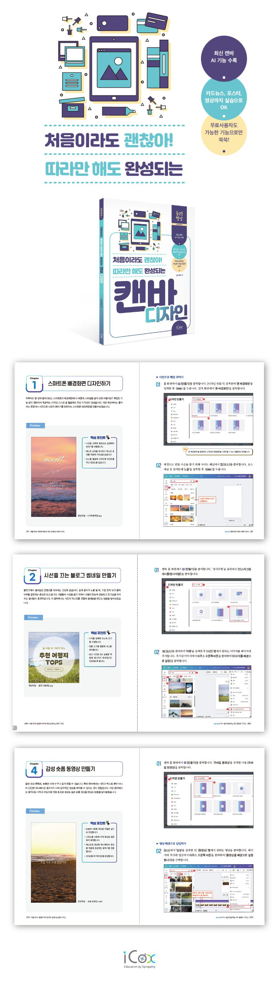 __Chapter 01. 캔바 알아보기 __Chapter 02. 캔바 회원 가입하기 __Chapter 03. 캔바 화면 이해하기 __Chapter 04. 캔바 템플릿으로 시작하기 Part 2. 따라하며 익히는 캔바 디자인 __Chapter 01. 스마트폰 배경화면 디자인하기 __Chapter 02. 동영상 카드 디자인하기 __Chapter 03. 디지털 명함 디자인하기 __Chapter 04. 카페 포스터 디자인하기 __Chapter 05. 행사 전단지 디자인하기 Part 3. 누구나 쉽게 완성하는 SNS 콘텐츠 디자인 __Chapter 01. 눈에 띄는 SNS 프로필 이미지 만들기 __Chapter 02. 시선을 끄는 블로그 썸네일 만들기 __Chapter 03. 알고 보면 쉬운 카드뉴스 만들기 __Chapter 04. 감성 숏폼 동영상 만들기 Part 4. 캔바 AI로 업그레이드 하기 __Chapter 01. 누구나 쉽게! AI로 업그레이드 하기 __Chapter 02. Magic Media로 디자인 만들기 __Chapter 03. Magic Write로 똑똑하게 콘텐츠 만들기 __Chapter 04. AI 음성으로 메시지 영상 만들기 |
