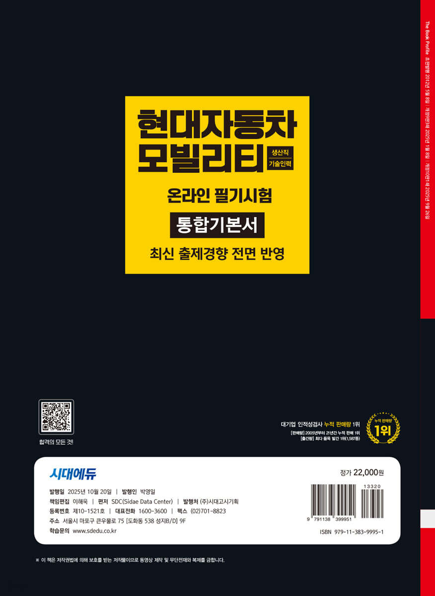 CHAPTER 01 2025년 기출복원문제 CHAPTER 02 2024년 기출복원문제 CHAPTER 03 2023년 기출복원문제 [PART 1] 적성검사 CHAPTER 01 언어 CHAPTER 02 수리 CHAPTER 03 추리 CHAPTER 04 공간지각 CHAPTER 05 기초영어 CHAPTER 06 기계기능이해력 [PART 2] 최종점검 모의고사 제1회 최종점검 모의고사 제2회 최종점검 모의고사 제3회 최종점검 모의고사 [PART 3] 인성검사 [PART 4] 면접 CHAPTER 01 면접 유형 및 실전 대책 CHAPTER 02 현대자동차그룹 실제 면접 [부록] 현대자동차 회사상식 [별책] 정답 및 해설 PART 1 적성검사 PART 2 최종점검 모의고사 부록 현대자동차 회사상식 |