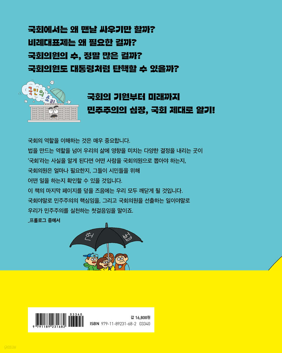 대의민주주의, 즉 시민들이 대표자를 선출해 민주주의를 실현하는 체제에서는 국회가 우리 시민들의 권리를 지켜 주기 때문이죠. 국회는 대의제 민주주의의 대표 기구로서 다양한 목소리를 대변하고, 정책과 법에 반영하는 역할을 합니다. 그렇게 중요한 것이 국회입니다. --- p.8 법치주의가 가능하게 하는 법률안을 제정·개정·폐지하는 권한을 가진 것이 바로 국회입니다. 따라서 입법권, 즉 법을 제정하는 권능을 소유한 국회야말로 민주주의를 구성하는 핵심 요체라고 할 수 있죠. --- p.80 대한민국 국회의원 숫자는 세계적으로 보아도 인구 대비 적은 편입니다. 따라서 많은 학자들은 시민들의 의견과는 달리 대한민국 국회의원 숫자를 늘려야 한다고 주장합니다. 그렇다면 왜 대한민국에서는 국회의원 숫자를 두고 일반 시민과 학자들 사이에 다른 의견을 내놓는 것일까요? --- p.112 어느 나라건 그 안에서는 개인적 또는 계급적 이해의 충돌이 있을 수밖에 없습니다. 그에 따라 정치적 의사 대립도 당연한 것이죠. 이 대립과 갈등을 조정하기 위해서는 시민들이 자신의 의견과 반대되는 입장을 이해할 만큼 이성적이어야 합니다. ... 민주주의를 지키기 위해서는 다른 사람의 의견도 수용할 줄 알아야 하고, 내 이익을 양보할 줄도 알아야 한다는 거네요. --- p.136 민주주의 국가에서 국회는 평화로운 장소이기보다는, 긴장을 유지하는 장소라고 할 수 있습니다. 한 나라에 하나의 의견만이 존재한다면, 그 나라를 민주주의 국가라고 할 수 없기 때문입니다. --- p.137 |