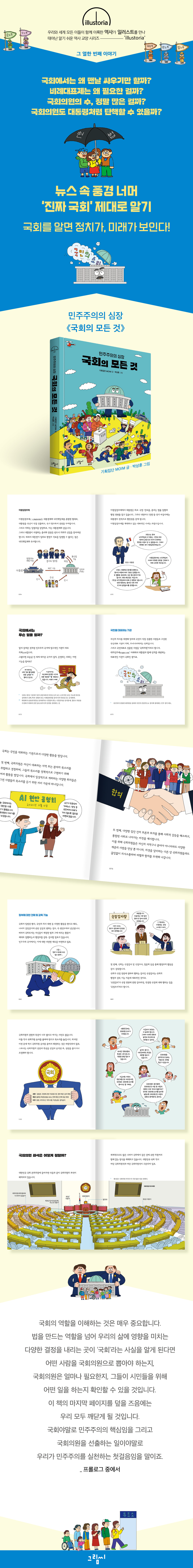 ‘국회의 모든 것’ 현재를 살고 미래를 살아갈 우리가 꼭 알아야 할 이야기를 일러스트와 함께 풀어냈다! ‘일러스토리아’ (‘illustration’과 역사를 뜻하는 이탈리아어 ‘storia’를 합성하여 만든 시리즈명) 부담 없이 읽을 수 있도록 한 페이지 한 페이지를 짧은 호흡으로 구성한 동시에, 이야기를 풍부하게 만들어 주는 경쾌하고 세련된 일러스트를 곁들여 몰입감을 높였다. 이렇게 탄생한 일러스토리아 시리즈! 앞서 출간한 10종, 《셀마 대행진》, 《패스트 패션》, 《아프리카 쟁탈전》, 《핵무기의 모든 것》, 《광고의 모든 것》, 《지정학의 모든 것》, 《실크로드》, 《장벽의 모든 것》, 《플랜테이션 세계사》, 《닭장 속에는 치킨이》에 이은 열한 번째 책은 민주주의의 심장, ‘국회’의 역사부터 현재, 그리고 국회가 우리 삶에 왜 필요한지를 담아 낸 《국회의 모든 것》이다. 민주주의가 당연한 듯한 세상에 사는 우리가 꼭 알아야 할 민주주의의 심장, ‘국회’에 대한 모든 것! 뉴스를 보면 국회의원들이 서로를 비방하며 언성을 높이는 장면을 어렵지 않게 볼 수 있을 것이다. 이러한 모습을 보면서 ‘왜 국회의원들은 툭하면 언성을 높이며 싸울까?’, ‘국회의원들은 일을 하긴 할까?’라고 의문을 품은 적이 있을 것이다. 하지만 이러한 의문에도 ‘정치란 게 다 그렇지.’ 하며 넘겨 버리는 게 일반적이다. 우리 눈에 보이는 건 국회의 이러한 모습들이 전부일지 모르지만, 뉴스에서 보는 것이 결코 국회의 전부는 아니다. 학교가 주변 유해환경으로부터 보호를 받고, 급식이 무료로 제공되며, 주 52시간 근무제가 시행되는 것도, 모두 국회에서 법안을 만들고 통과시켰기 때문에 가능한 일이다. 무엇보다 2024년 12월, 난데없는 비상계엄 사태로 인해 민주주의에 닥친 위기를 모면할 수 있던 것도 국회가 있었기에 가능한 일이었다. 이 책은 이처럼 우리 삶에 ‘직접적인’ 영향을 주며, 대한민국 국민이자 시민인 우리의 목소리를 담아 대변해 주는 국회(의회)에 대한 모든 것을 담았다. 1부에서는 국회에 대해 본격적으로 알아보기 전, 정부의 탄생과 다양한 형태를 다룬다. 사우디아라비아 국왕과 영국 국왕의 차이는 무엇인지, 총리가 수반인 독일에 왜 대통령이 존재하는지 등 구체적인 사례들은 개념에 대한 빠른 이해를 도울 것이다. 2부에서는 국회의 기원부터 역할, 기능, 운영 방식 등 국회의 본질은 물론이고, 나라마다 다른 국회의 형태와 국회의원을 뽑는 다양한 방식 등 국회에 대한 자세하고 구체적인 내용들을 담았다. 책 전반에 걸쳐 함께 곁들인 풍부한 일러스트들은 텍스트만으로는 어려울 수 있는 내용을 훨씬 쉽고 재미있게 이해할 수 있도록 해 줄 것이다. 국회는 왜 존재하며, 국회의원선거는 왜 중요한 것일까? 대한민국 헌법은 (부칙을 제외하고) 총 10장으로 구성된다. 제1장은 누구나 한 번쯤 들어 본 ‘대한민국은 민주공화국이다.’를 포함한 주권, 국민, 영토 등에 대한 규정을 담고 있으며, 제2장은 국가의 주인인 ‘국민’의 권리와 의무에 대해 설명한다. 그리고 제2장 국민 바로 다음에 오는 제3장은 바로 ‘국회’에 대한 내용이다. 우리가 알고 있는 우리나라의 최고 통수권자이자 행정부의 수장인 대통령에 관한 내용은 국회 다음인 제4장에 등장한다. 이 순서에는 모두 의미가 있다. 언뜻 보면 총선(국회의원을 선출하는 선거)보다는 대선(대통령을 선출하는 선거)이 더 중요해 보이고, 대통령이 국회의원보다 강력한 직위로 보이기에 헌법에서 국회를 대통령보다 먼저 다루는 것이 다소 낯설게 보일지도 모른다. 2024년 12월 3일 밤, 당시 우리나라 대통령이 긴급 TV 담화를 통해 비상계엄을 선포한 일이 있었다. 이 계엄령으로 시민들은 혼란에 빠진 것은 물론, 우리의 권리와 자유가 제한되어 민주주의가 위태로워질 것이라는 걸 직감하고 국회로 달려갔다. 시민들은 왜 국회로 달려갔을까? 우리나라는 대의민주주의, 즉 시민들이 시민을 대표하는 사람들을 선출하여 민주주의를 실현해 나가는 나라이다. 시민을 대표하는 국회의원들이 모여 있는 곳이 국회이고, 따라서 시민들은 민주주의를 되찾기 위해 국회로 달려간 것이다. 계엄이 선포된 지 약 2시간 반 만에, 국회는 헌법과 법률이 정한 민주적인 절차를 통해 비상계엄 해제 요구 결의안을 가결했고, 대통령은 이러한 국회의 결정에 따라 계엄령을 해제했다. 그제야 비로소 시민들은 안도할 수 있었다. 이 일련의 과정들을 보며, 우리 시민들은 다시 한 번 국회가 우리 삶에, 민주주의에 얼마나 중대한 역할을 하는지를 깨달았다. 이처럼 국회와 국회의원들이 어떠한 권리를 가지고 어떤 일을 하는지 알게 된다면, 왜 헌법에서 대통령보다 국회에 대한 내용을 먼저 규정하고 있는지를 단번에 이해할 수 있을 것이다. 또한, 우리가 원하는 사회를 만들기 위해서는 대선만큼이나, 어쩌면 대선보다도 더 총선을 중요하게 생각해야 할 까닭도 알게 될 것이다. 우리가 끊임없이 살려내야 할 민주주의의 심장, 국회 국회를 떠올리면 ‘싸우는 곳’, ‘시끄러운 곳’이라는 이미지가 먼저 떠오른다. 그러나 이는 어쩌면 당연한 일일지 