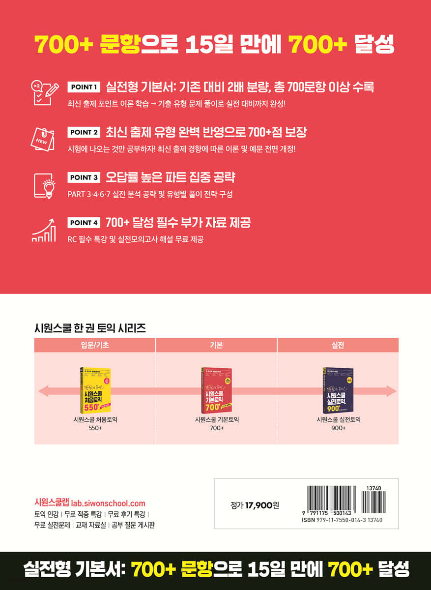 · 최신 출제 포인트를 학습하고, 그 내용을 문제 풀이에 적용하는 반복 연습에 집중하여 실전 대비에 착실한 기본서 · 약 730문항에 달하는 실전 문제를 통해 점수 향상에도 탁월한 실전형 기본서 2. 최신 출제 유형 완벽 반영으로 700+점 보장 · 2025년 기준 최신 출제 경향 그대로, 시험에 나오는 것을 중점으로 핵심 출제 포인트 이론만 학습하여 빠르고 확실하게 목표 점수에 도달 가능 · 연습 문제를 비롯한 모든 실전 문제는 기출 변형 문제이며 실제 토익의 출제 포인트와 동일 3. 오답률 높은 파트 집중 공략 PART 3 · 4 · 5 · 6의 출제 유형을 분석하고, 문제 풀이 방법과 순서, 오답 소거법까지 확실하게 학습하여 정답률 향상 4. QR코드로 바로 듣는 편리한 음원 · 회원가입 없이 교재 내 QR코드 스캔으로 음원을 모바일로 청취 가능 · 교재 음원은 시원스쿨랩 홈페이지(lab.siwonschool.com)에서 다운로드 5. 15일 완성 학습 플랜 · LC, RC 섹션은 각각 15개 Day로 구성되어 있어 최대 30일 안에 [LC + RC + VOCA]를 끝내는 학습플랜 제시 · 동영상 강의(유료) 수강 시 1일 2시간 학습으로 15일 안에 쉽고 빠르게 700+ 기본기 완성이 가능 6. 최신 기출 변형 실전 모의고사 1회분 · 최신 토익 시험과 난이도 및 유형이 동일한 기출 변형 실전 모의고사 1회분을 제공 · 모의고사의 음원, 스크립트, 상세한 해설도 모두 온라인 무료 제공 |