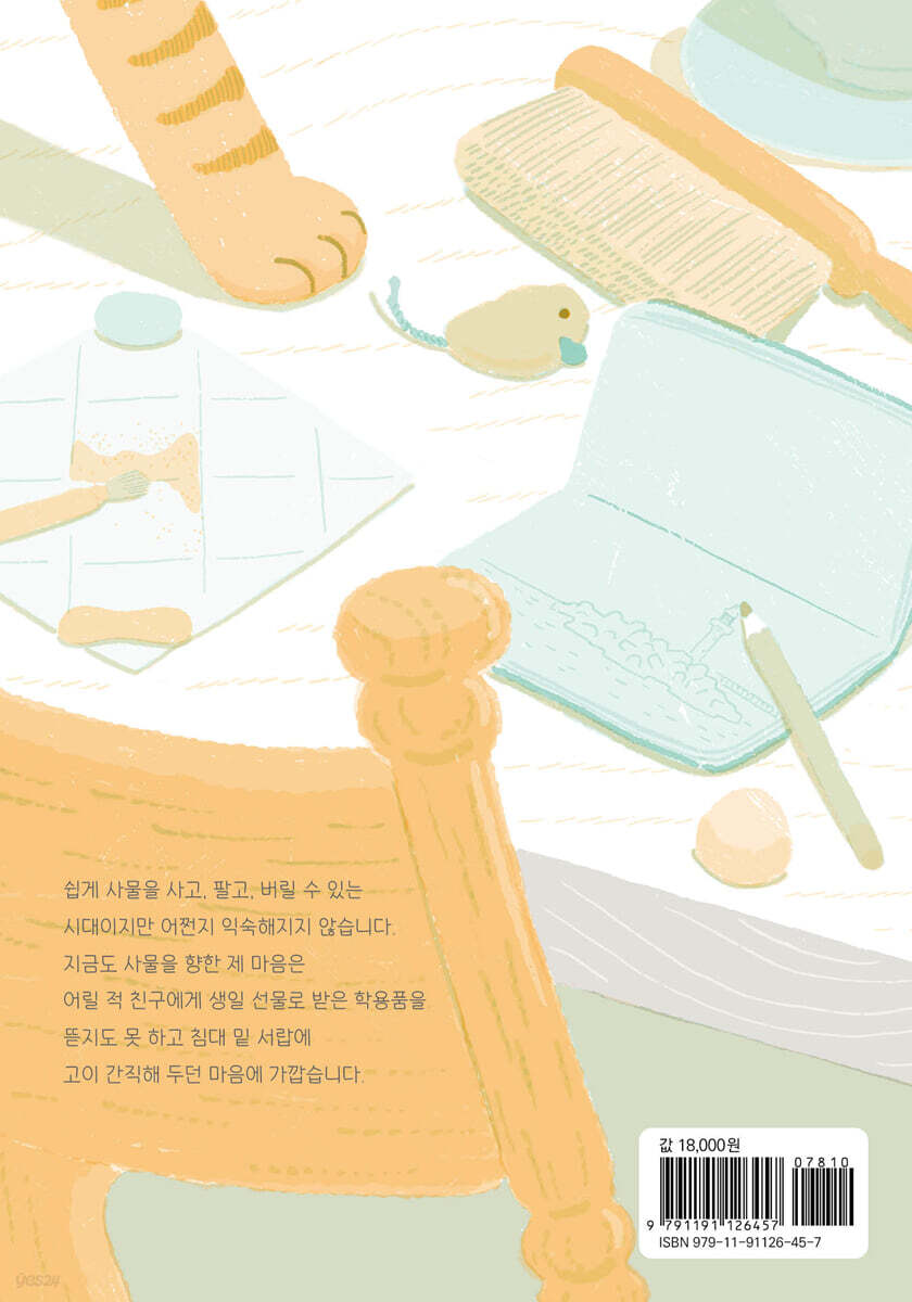 ‘설레지 않으면 버려라’는 광고부터 ‘미니멀 라이프’를 추구하는 유행, ‘당신의 방이 당신을 나타낸다-인생을 바꾸려면 방 청소부터’하라고 광고하는 청소 애플리케이션까지, 생활공간의 크기에 지불하는 비용이 늘어날수록 ‘가지고 있는 물건을 버려라’는 권유와 압박이 커지고 있다. 많은 사람이 냉정한 기준을 정해 묵은 물건을 비워내며 깔끔하고 쾌적한 집안을 유지하지만 그렇지 못한 사람들도 적지 않다. 작가도 그중 하나다. “쉽게 사물을 사고, 팔고, 버릴 수 있는 시대지만 어쩐지 익숙해지지 않습니다. 지금도 사물을 향한 제 마음은 어릴 적 친구에게 생일 선물로 받은 학용품을 뜯지도 못 하고 침대 밑 서랍에 고이 간직해 두던 그 마음에 가깝습니다.” -‘작가의 말’ 중에서 작가에게 사물은 ‘어떤 구실을 하는 무엇’이기도 하지만, 자기 삶의 흔적과 감정이 축적된 무엇이기도 하다. 집 안을 깔끔하게 정리하려는 작심으로 버릴 것을 찾아 나서기도 하지만, 버려도 되는 사물을 찾기는 쉽지 않다. 설레지 않는 것을 찾아서 버리라고 하지만 설레는 마음 이상의 가치가 깃들어 있는 사물도 많다. 버리는 것의 이점이 강조되는 시절, 작가가 들려주는 이야기는 버리지 않는 것의 이점을 보여 준다. 누군가의 마음이 담긴 선물, 기뻤던 추억이 담긴 기념품, 위로가 되었던 어떤 날의 온도를 상기시켜 주는 사물… 새로운 상품에서는 기대할 수 없는 가치들이다. 작가는 누군가는 거들떠보지 않을, 소소한 사물들의 이야기를 하나씩 꺼내어 보내준다. 그 자신에게는 최신 상품보다 훨씬 값진 것들이다. 청소기와 빗자루 내가 만난 모든 물건을 평생 껴안고 살아갈 수 없기에 작가는 오늘도 청소와 정리에 나선다. 그런데 “왜 청소를 할수록 집이 닳는 기분일까?” 작가는 청소가 싫다. 청소보다 청소기가 싫다. 시끄럽고 무겁고 거친 청소기를 돌리면서 생각한다. 그러다 빗자루를 구입한다. 빗자루는 고요하고 유연하고 평화롭다. “청소기의 목적이 당장 내 눈앞의 깨끗함이라면 빗자루는 버리지 말아야 할 것들을 구분할 수 있게 한다. 청소기가 정체불명의 것들을 보이지 않는 공간으로 사라지게 한다면 빗자루는 지금 이 순간 나와 함께 하는 것들을 보여 준다.” -16쪽 꼭 내 곁에 두어야 할 것과 반드시 눈앞에서 치워야 할 것을 구분하기 위해 작가는 빗자루의 마음으로 책장 위, 책장 아래, 방바닥이며 작업 책상 주위를 뒤져본다. 한참을 애써 봐도 버릴 물건을 찾는 것은 쉽지 않다. 상관없다. 내일 다시 찾으면 그만. 당신의 사물들 빗자루 이야기로 시작된 사물 이야기는 시계, 의자, 벼룩시장, 컵, 고양이 장난감에 관한 기억으로 이어진다. 각각의 이야기에서 사물은 단순한 소재가 아니라 기억을 촉발하고, 관계를 회상하게 하며, 작가 자신의 정체성을 비추어 준다. 그림의 색상과 글의 문장 수는 절제되어 있지만, 글과 그림이 서로의 여백을 채워 풍부한 정서를 전하며, 장면과 장면 사이, 텍스트와 텍스트 사이 또한 충분한 여백을 두어 독자가 작가와 함께 호흡하고 사유할 시간을 남겨두었다. 이 책을 읽는 동안 독자 각자가 자신에게 의미 있는 ‘하나의 사물’을 돌이켜 보는 시간과 마주할 수 있다면 좋겠다. 사물 애착가, 맹하나 대학에서 공예를 전공하고, 아크(AC)에서 일러스트레이션을 공부했다. 여러 권의 단행본에 삽화를 그렸으며, 자신만의 이야기가 담긴 만화도 그리고 있다. 『하나의 사물』은 그 첫 번째 작품이다. 오래전부터 사물을 바라보고 그리는 작업에 집중했고, 그 마음을 담아 이 책을 출간했다. |
