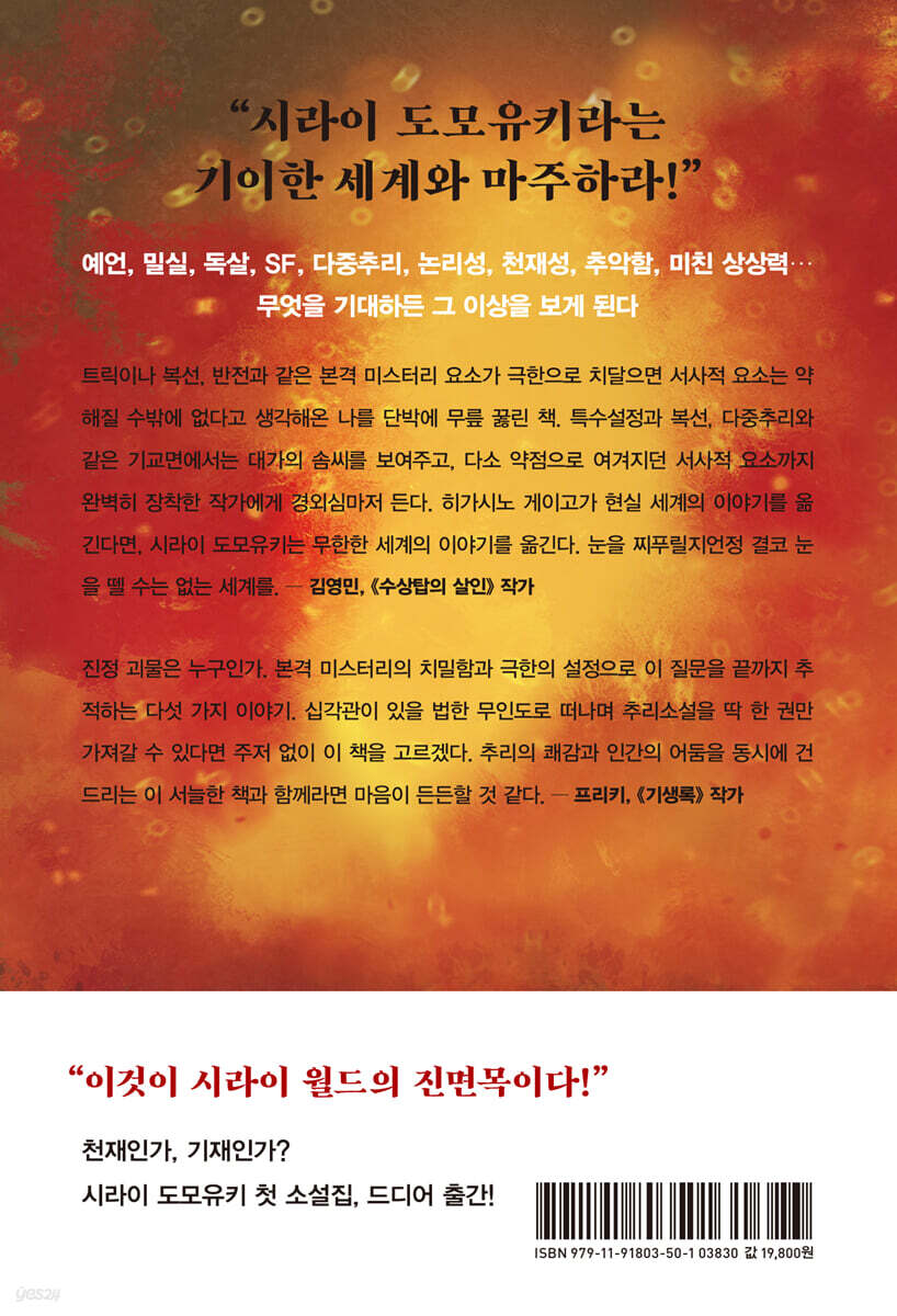 트릭이나 복선, 반전과 같은 본격 미스터리 요소가 극한으로 치달으면 서사적 요소는 약해질 수밖에 없다고 생각해온 나를 단박에 무릎 꿇린 책. 특수설정과 복선, 다중추리와 같은 기교면에서는 대가의 솜씨를 보여주고, 다소 약점으로 여겨지던 서사적 요소까지 완벽히 장착한 작가에게 경외심마저 든다. 히가시노 게이고가 현실 세계의 이야기를 옮긴다면, 시라이 도모유키는 무한한 세계의 이야기를 옮긴다. 눈을 찌푸릴지언정 결코 눈을 뗄 수는 없는 세계를. - 김영민 (《수상탑의 살인》 작가)