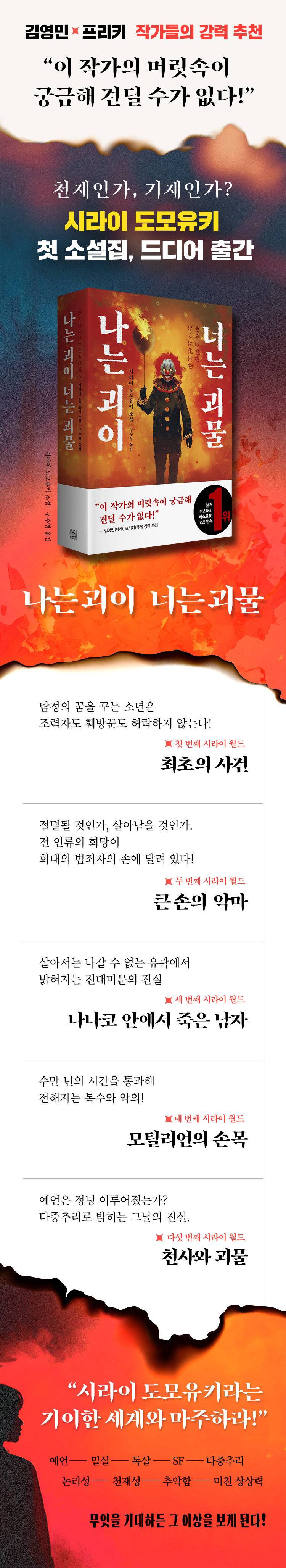 무엇을 기대하든 그 이상을 보게 될 것이다! 〈최초의 사건〉 탐정을 꿈꾸며 주변에서 사건이 일어나기만을 기다리는 소년이 있다. 한편, 지구 반대편에서는 소국의 독재자가 금단의 비밀 무기를 사용하겠다고 선언한다. 균열을 일으킨 세계에서 마침내 사건 앞에 선 소년. 본격 미스터리와 SF는 이렇게 만난다! 〈큰 손의 악마〉 점령당한 지구, 외계 침략자들의 ‘인간 샘플 채집’이 시작된다. 샘플의 지능이 기준치에 미달할 경우 해당 구역의 개체는 전원 처형된다. 절멸 앞에 선 인류가 준비한 마지막 병기는 희대의 범죄자? SF로 시작해 심리 스릴러로 치닫는 상상력의 정점! 〈나나코 안에서 죽은 남자〉 살아서는 나갈 수 없다는 유곽 ‘구로즈카’를 덮친 연쇄 독살사건. 유령 같은 것은 믿지 않던 나였지만, 그날의 진실은 유령이 되어서라도 밝혀야 했다. 소거법으로 가능성을 좁혀가는 와중에도 페이지를 넘길 때마다 예측이 무너진다! 〈모틸리언의 손목〉 일확천금을 노리고 발굴한 ‘모틸리언’ 화석. 그런데 왜 이런 곳에 손목만 덩그러니 묻혀 있는 것일까. 수만 년의 시간과 지층, 종(種)을 관통해 전해지는 어떤 복수, 혹은 악의. SF의 스케일과 와이더닛의 전율이 맞물려 폭발한다! 〈천사와 괴물〉 프릭쇼 단원들의 숙소에서 불가해한 살인사건이 발생한다. 사건 현장은 완전 밀실 상태의 욕실. 오래전의 불길한 예언이 마침내 실현된 것일까? 세 가지 논리로 세 번 뒤집히는 밀도 높은 본격 다중추리. 신체적 특징이 트릭이 되고, 예언이 증거가 된다! 다섯 가지 시라이 월드, 다섯 번의 정답 붕괴 이번에도 시라이 도모유키는 가차 없다! 일본 미스터리계를 뒤흔든 ‘특수설정 미스터리’의 독보적 1인자, 추리작가들의 작가, 본격 미스터리의 최전선을 넓혀온 괴물 같은 작가… 시라이 도모유키라는 작가에게 붙는 수식어는 이미 차고 넘친다. 2014년 《인간의 얼굴은 먹기 힘들다》로 ‘무시무시한 신예’라 불리며 데뷔한 지 꼭 10년 만의 성과다. 시라이 도모유키가 데뷔 10년을 맞아 자신이 선보일 수 있는 모든 면모를 집대성한, ‘풀 스펙 시라이 월드’와도 같은 단편집 《나는 괴이 너는 괴물》이 드디어 한국 독자들을 만난다. 한국에서는 처음으로 발표되는 단편집이다. 뿐만 아니라 한국에서의 인기를 의식한 듯 한국인 인물들도 등장해 더욱 반갑다. ‘본격 미스터리 베스트10’ 2위, ‘미스터리가 읽고 싶다!’ 3위, ‘본격 미스터리 대상’ 후보작 등 2025년 일본 주요 미스터리 랭킹을 휩쓸며 장편소설 이상의 만족감을 증명했다. 《명탐정의 제물》, 《엘리펀트 헤드》와 같은 전작들이 본격 미스터리의 극한을 갱신하는 한편 다소 마니악했다면, 《나는 괴이 너는 괴물》은 단편집인 만큼 문턱이 낮고 빠른 몰입감을 보장한다. 특수설정과 다중추리라는 작가의 본령은 더욱 공고해졌고, 과거 약점으로 지적되었던 서사는 한층 견고해졌다. 특유의 광기와 상상력, 독자의 예상을 뒤엎는 그로테스크한 세계관은 여전히 타의 추종을 불허한다. SF와 심리 스릴러, 본격 추리 등 장르를 넘나드는 다양한 스펙트럼은 이 작가의 한계가 과연 어디인지 되묻게 만든다. 김영민 작가의 “눈살을 찌푸리게 하되, 끝내 눈을 떼지 못하게 하는 세계”, 프리키 작가의 “추리의 쾌감과 인간의 어둠을 동시에 건드리는 서늘한 체험”이라는 찬사가 이를 정확히 설명한다. |