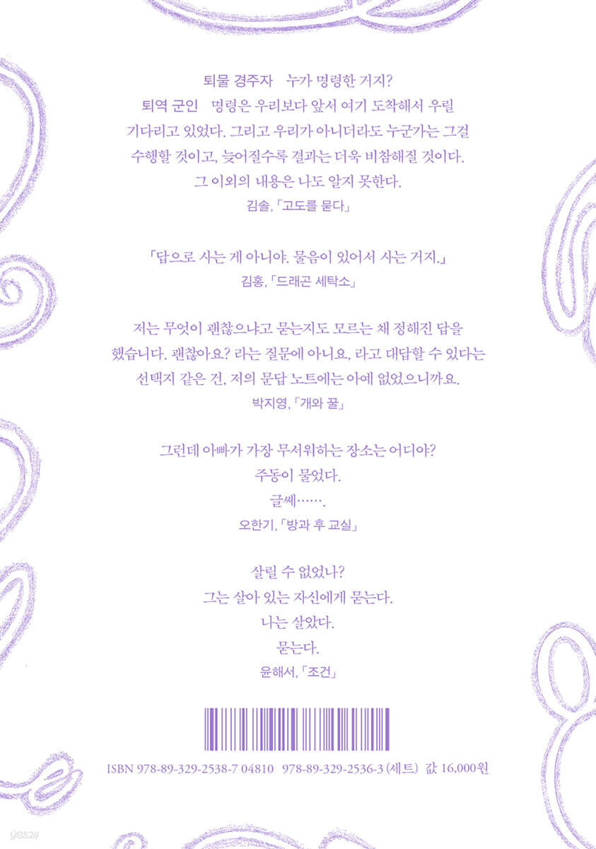 --- 「첫 문장」 중에서 중에서 퇴물 경주자 누가 명령한 거지? 퇴역 군인 명령은 우리보다 앞서 여기 도착해서 우릴 기다리고 있었다. 그리고 우리가 아니더라도 누군가는 그걸 수행할 것이고, 늦어질수록 결과는 더욱 비참해질 것이다. 그 이외의 내용은 나도 알지 못한다. --- 「김솔, 고도를 묻다」 중에서 「답으로 사는 게 아니야. 물음이 있어서 사는 거지.」 중에서 --- 「김홍, 드래곤 세탁소」 중에서 저는 무엇이 괜찮으냐고 묻는지도 모르는 채 정해진 답을 했습니다. 괜찮아요? 라는 질문에 아니요, 라고 대답할 수 있다는 선택지 같은 건, 저의 문답 노트에는 아예 없었으니까요. --- 「박지영, 개와 꿀」 중에서 그런데 아빠가 가장 무서워하는 장소는 어디야? 주동이 물었다. 글쎄……. --- 「오한기, 방과 후 교실」 중에서 살릴 수 없었나? 그는 살아 있는 자신에게 묻는다. 나는 살았다. 묻는다. --- 「윤해서, 조건」 중에서 |