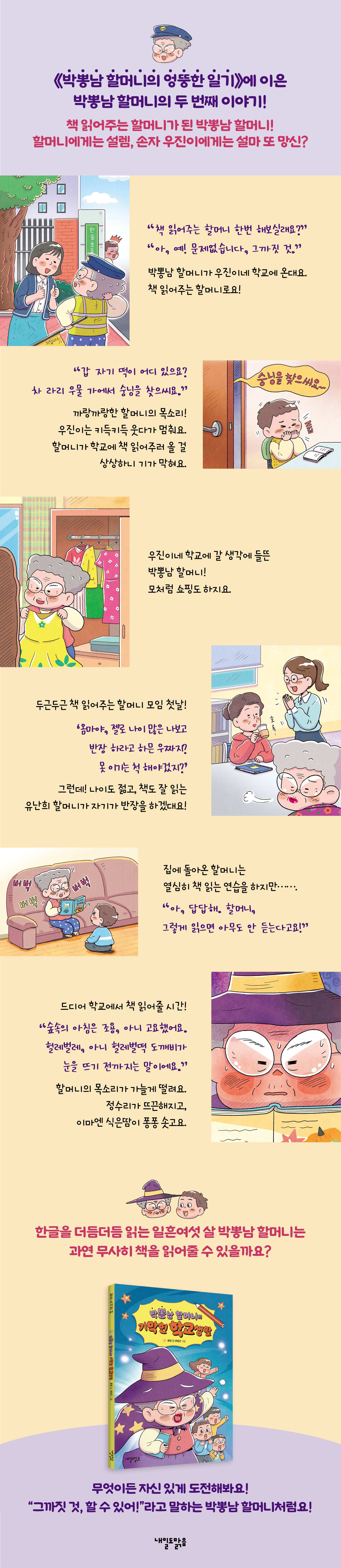 한글을 더듬더듬 읽는 일흔여섯 살 박뽕남 할머니는 과연 무사히 책을 읽어줄 수 있을까요? 삐뚤빼뚤한 글씨로 일기를 쓰고, 책도 더듬더듬 틀리게 읽지만 손자의 학교에서 책 읽는 할머니로 활동하게 되어 그저 신난 박뽕남 할머니. 그리고 할머니는 좋지만, 할머니가 학교에 오면 또 망신을 당할까 봐 걱정되는 개구쟁이 손자 우진이. 박뽕남 할머니와 우진이의 두 번째 이야기가 펼쳐집니다. 우진이는 할머니가 ‘책 읽는 할머니’로 학교에 오게 되어서 안절부절못해요. 한글도 잘 모르는 할머니가 책을 제대로 읽어줄 리 없다고 생각하기 때문이에요. 한편 가정 형편상 어린 시절 초등학교까지만 다닌 할머니는 일흔여섯 살의 나이에 손자의 학교에 같이 다닐 수 있다는 생각에 설레어 열심히 책 읽는 연습을 해요. “갑 자기 떡이 어디 있으요? 차 라리 우물 가에서 숭닝을 찾으씨요.” 느리게, 더듬더듬, 까랑까랑한 목소리로 책을 읽는 할머니를 보고 우진이는 기가 막힐 뿐이지요. 박뽕남 할머니도 우진이 앞에서는 잘할 수 있다고 큰소리를 쳤지만 마음속으로는 걱정이 태산이에요. 아니나 다를까. 아이들 앞에 선 박뽕남 할머니는 자꾸만 틀리게 읽고 분위기는 금세 어수선해지고 말아요. 정수리가 뜨끈해지고, 식은땀이 퐁퐁 솟아나는 위기의 순간, 박뽕남 할머니는 어떻게 이겨낼까요? 무엇이든 자신 있게 도전해봐요! “그까짓 것, 할 수 있어!”라고 말하는 박뽕남 할머니처럼요! 엄마가 갑자기 우진이 학교 앞에서 교통 봉사를 해달라고 해도, 선생님이 갑자기 책 읽는 할머니로 활동해달라고 해도 박뽕남 할머니는 그까짓 것 할 수 있다고 큰소리부터 쳐요. 그러고 나서 잘하려고 열심히 노력을 하지요. 무작정 도전하는 박뽕남 할머니도 뭐든지 잘하는 것 같은 유난희 할머니에게 질투심을 느껴 은근슬쩍 따라 해보기도 하고, 긴장을 해서 실수를 하기도 해요. 그래도 자기만의 방법으로 실감 나고 재미있게 책을 읽어줘요. 하고 싶은 일이 있다는 건 행복한 일이에요. 물론 그 일을 잘하면 더 좋겠지만, 조금 못하더라도 열심히 하려는 마음과 곁에서 응원해주는 사람이 있다면 힘을 낼 수 있어요. 무엇이든 자신 있게 도전해봐요. “그까짓 것, 할 수 있어!”라고 말하는 박뽕남 할머니처럼요! |