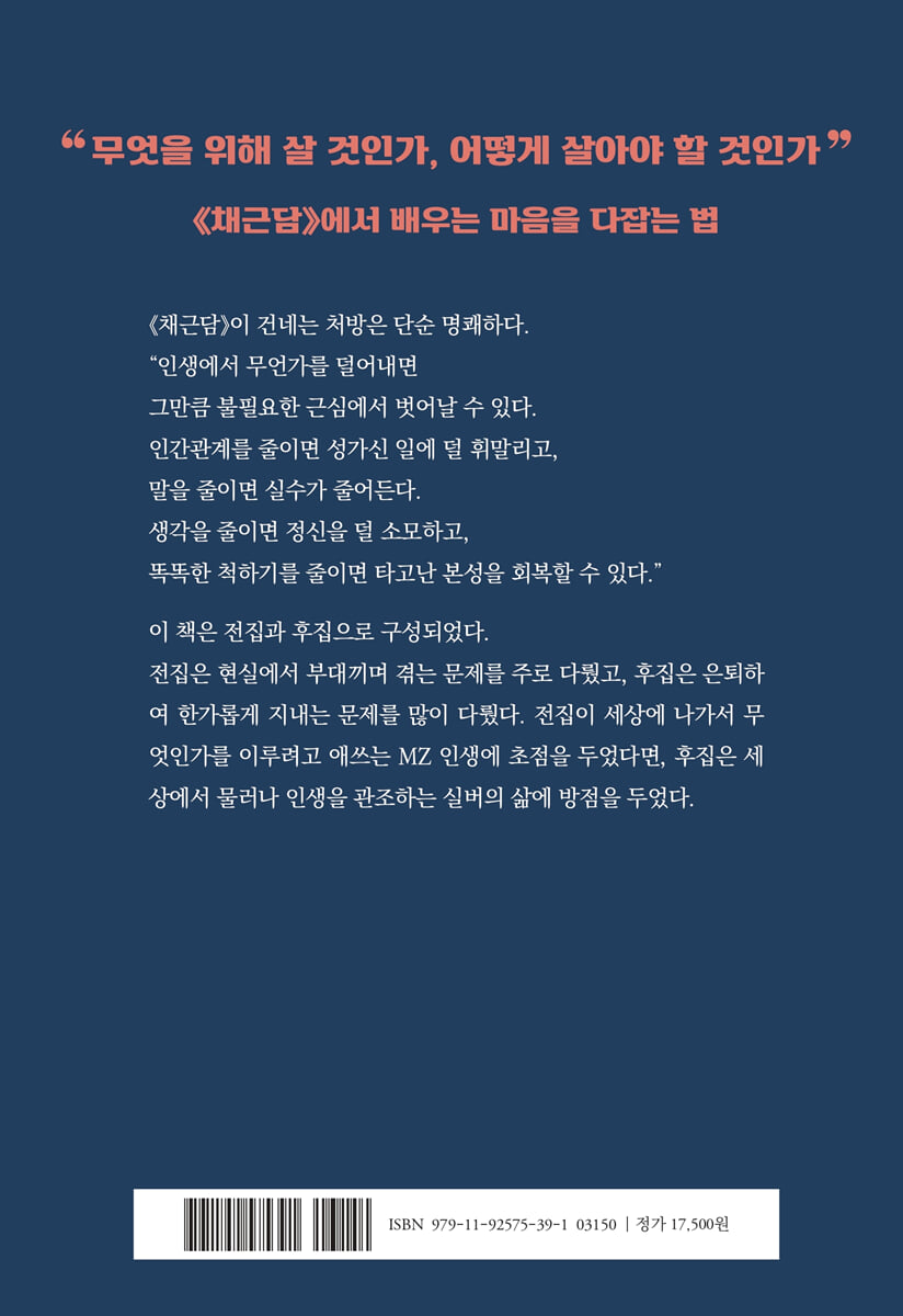 ㆍ전집 001~224 - 무엇인가를 이루려고 애쓰는 MZ들에게 001. 한때 적막할망정 만고의 처량함을 취하지 말라/002. 지나친 예의보다 소탈한 게 낫다/003. 마음은 거울처럼 보여주고 재능은 돌에 숨겨라/ 004. 알아도 아는 체하지 않는 사람/005. 몸에 좋은 약은 써/006. 기쁜 마음으로 사는 것이 인간의 삶/007. 평범한 것에 비범이 있어/008. 고요하게 움직이고 웅장하게 고요하라/009. 밤에 홀로 있을 때에야 진심을 알아/010. 피는 꽃도 한철, 폭풍·천둥번개도 한때/011. 맑고 깨끗해야 하는 이유/ 012. 생전에 할일, 하루에 할 일/013. 가장 좋은 처세는 양보/014. 물욕에 사로잡히지 않으면/015. 친구를 사귈 때에는 급히 정을 쏟지 말라/016. 누림에는 분수를 넘지 말고 행함에는 분수를 줄이지 말라/017. 남을 이익 되게 하는 것은 곧 나를 위하는 바탕/018. 자랑은 삼가고 죄는 뉘우쳐라/019. 명예와 부끄러움/020. 완벽하려고 하면 근심을 불러/021. 가정에 부처가 있고 일상생활에 도가 있어/022. 흔들리는 등불과 재의 불씨/ 023. 남의 허물을 너무 엄하게 꾸짖지 말라/024. 깨끗한 것은 더러운 것에서 나와/025. 거만하지 말라/026. 사후에 후회할 것을 분별해야/027. 처지에 연연하지 말라/028. 원망하지 않으면 인덕/029. 지나치게 깔끔하면 도움이 안 돼/030. 일이 막혀 고달플 때에는 초심/031. 부자는 너그럽고 후해야, 총명한 사람은 재주를 감추어야/032. 낮은 곳에 있어 보아야 높은 데가 위태로운 것을 알아/033. 도덕과 인의는 몸에서 이루어져/034. 독선이 자신을 해쳐/035. 어려운 곳에서는 한 걸음 물러서라/036. 엄하게 하기보다 미워하지 않기가 어려워/037. 순박함을 지키고 총명함을 물리쳐라/038. 악귀를 항복시키려거든 자신의 마음을 항복시켜라/039. 제자 교육에는 교우가 중요/040. 욕망의 길로 빠지지 말라/041. 지나치게 너그럽거나 야박하지 말라/042. 뜻이 있으면 길이 있어/043. 한 걸음 물러서는 겸양의 덕/044. 학문하는 사람은 한 가지에만 집중해야/045. 욕망에 사로잡히지 말아야/046. 탐욕과 집착은 위기를 불러/047. 착한 사람은 온화하고 악한 사람은 웃음소리에도 살기가/048. 어두운 곳이라고 죄를 짓지 말라/049. 마음 쓸 일이 많은 것이 가장 큰 재앙/050. 선인에게는 관대한 것이 좋고 악인에게는 엄한 것이 좋아/051. 신세진 일은 잊지 말라/052. 계산하는 베풂은 한 푼의 가치도 없어/053. 모든 사람이 나와 같지는 않아/054. 마음이 깨끗해야 책을 읽고 옛 도를 배울 수 있어/055. 원망받는 유능한 자보다는 인생을 즐기는 무능한 자/056. 책을 읽되 성현의 뜻을 보아야/057. 참된 마음을 찾아야 즐거움을 누려/058. 일이 잘 풀릴 때 뜻밖의 슬픔/059. 권력으로 얻은 부귀영화는 꽃병의 꽃/060. 평범한 삶이 안락한 삶/061. 온화함과 엄한 기운 겸비해야/062. 평판을 얻으려는 자는 욕심이 많은 사람/063. 반쯤만 채우고 만족하라/064. 사사로운 욕망과 객기를 없애야/065. 마음이 밝으면 어둠 속에도 빛을 봐/066. 명예도 지위도 없는 즐거움/067. 자기 악행을 두려워하는 사람/068. 어떠한 어려움도 순리로 받아들여야/069. 여유와 너그러움 속에 복이 있어/070. 복은 구할 수 없고 화는 피할 수 없어/071. 군자는 떠들지도 나서지도 않아/072. 마음이 따뜻한 사람은 받는 복도 두텁고 은총도 오래가/073. 물욕에 얽매이면 삶이 쓰리고 아파/074. 괴로움도 겪고 즐거움도 맛보아야/075. 마음을 비워야/076. 지나치게 맑은 물에서는 물고기가 살지 못해/077. 사나운 말도 길들이면 준마/078. 무욕의 마음을 보물로 여긴 것은/079. 외부의 적, 내부의 적/080. 뉘우침은 예방만 못해/081. 인품은 치밀해야 하지만 자질구레하면 못써/082. 바람은 대숲에 소리를 남기지 않아/083. 치우치지 않음이 덕/084. 곤궁해도 자포자기 말아야/085. 한가할 때를 조심해야/086. 깨달았으면 고쳐라/087. 쉴 때 생각이 맑으면 마음의 참모습 보여/088. 괴로운데도 즐기는 것이 마음의 참 기능/089. 베푼 은혜에 보답을 바라지 말라/090. 하늘이 복을 박하게 한다면 덕을 후하게 하여 대항하라/091. 하늘은 스스로 돕는 자를 도와/092. 사람을 평가하려면 노년을 보라/ 093. 벼슬 없는 재상, 벼슬 있는 거지/094. 내가 누리는 것은 조상의 음덕/095. 군자의 변절은 소인이 뉘우치는 것만 못해/096. 나무랄 때는 봄바람이 언 땅을 녹이듯/097. 내가 관대하면 세상이 온화해져/098. 지조를 지키되 엄격함을 드러내지 말라/099. 역경에서 고통은 약/100. 욕망의 불꽃은 자기 자신을 태워/101. 마음이 진실하면 여름에도 서리를 내리게 해/102. 자연스러운 게 가장 아름다워/103. 헛된 부귀공명에서 벗어나야/ 104. 즐거움은 반쯤에서 그쳐야/105. 남의 허물을 들추지 말라/106. 몸가짐을 가벼이 하지 말라/107. 두 번 다시 태어날 수 없어/108. 은혜와 원한을 없게 하라/109. 번성했을 때 더욱 조심/110. 옛친구의 정/111. 옳은 일은 반대하지 말고, 더러운 곳은 멀리하라/112. 뜻을 굽혀 칭찬을 듣느니/ 113. 친구의 과실을 방치하면/114. 작은 일도 소홀히 하지 말라/115. 밥 한술의 은혜/116. 모든 것을 드러내는 자는 성공하지 못해/117. 새싹은 낙엽이 질 때 움터/118. 스스로 고립되는 것은 지조가 아냐/119. 분노와 욕망을 이겨라/120. 한쪽만 믿으면 속아/121. 남의 단점을 책망하지 말라/ 1