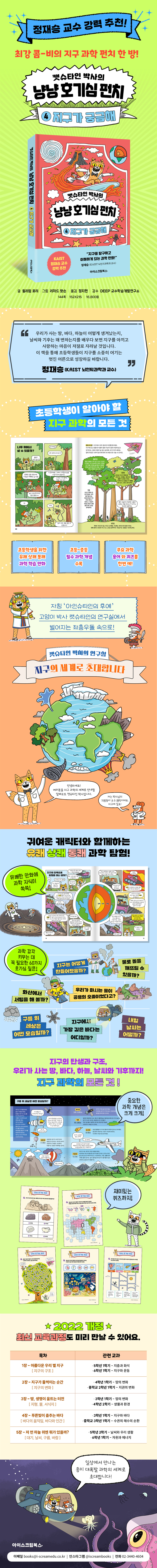 초등학생을 위한 지구 과학 탐험 백과!귀여운 캐릭터들과 함께하는 유쾌 상쾌 통쾌 과학 탐험!우리가 발 딛고 사는 지구는 놀라운 이야기들로 가득한 신비한 행성입니다. 지구는 어떻게 만들어졌을까요? 하늘에서 내리는 비는 어디에서 시작될까요? 바닷속 깊은 곳에는 어떤 생물이 살고 있을까요? 이 모든 궁금증은 지구 과학을 통해 해결할 수 있습니다. 지구 과학을 배우는 것은 단순히 지식을 쌓는 것이 아닙니다. 지진과 화산, 기후 변화와 태풍, 날씨의 변화처럼 우리 삶과 직접 연결된 자연 현상을 이해하고, 환경 문제나 기후 위기와 같은 지구의 중요한 이슈에 관심을 갖는 첫걸음을 내딛는 것이죠. 또한 초등학생 때부터 지구에 대해 깊이 배우면 지구를 사랑하고 지켜야 한다는 생각이 자리잡게 되면서, 과학적 사고력은 물론 자연을 바라보는 따뜻한 감수성도 함께 자라날 것입니다. 요즘처럼 기후 변화와 자연 재해가 잦아지는 시대에 지구 과학을 아는 것은 미래를 준비하는 가장 중요한 공부이기도 하지요.아인슈타인을 닮은 고양이 박사 ‘캣슈타인’과 햄스터 조수 ‘햄릿’은 최강 콤비입니다. 생김새도 성격도 달라서 전혀 콤비처럼 보이지 않지만, 햄릿의 엉뚱한 호기심을 해결해줄 수 있는 건 척척박사 캣슈타인 뿐이죠. 이 책은 이들이 겪는 에피소드를 통해 지구에서 발생하는 다양한 과학 현상을 쉽고 재미있게 알려 주며 어린이의 시선에서 지구를 이해할 수 있도록 도와줍니다.지구의 탄생과 구조, 날씨와 기후, 그리고 우리가 사는 땅, 바다, 하늘에 대한 모든 것!기상천외한 캣슈타인 박사의 연구실로 초대합니다!★ 흥미진진한 만화에 과학 지식이 쏙쏙!지구 과학은 지구에서 일어나는 모든 자연 현상을 탐구하는 과학의 한 분야입니다. 『캣슈타인 박사의 냥냥 호기심 펀치』 시리즈의 ④권 「지구가 궁금해」는 우리가 발 딛고 사는 지구에 대해 누구나 쉽게 이해하기 쉽도록 구성하였습니다. “지구의 탄생과 구조”, “대기와 바다”, “지진과 화산”, “생물권” 등 지구를 구성하는 다양한 요소와 그 상호작용을 흥미롭게 다루고 있으며, “물로 돌을 깨뜨릴 수 있을까?”, “지구에서 가장 깊은 바다는 어디일까?”, “구름 위 세상은 어떤 모습일까?”와 같이 초등학생 눈높이에 딱 맞는 엉뚱한 호기심을 쉽고 간단명료하게 설명해 주어 독자들이 지구 그 자체에 흥미를 가지도록 도와줍니다. 또한 유쾌한 만화와 설명글이 적절하게 교차되어 긴 글 읽기가 부담스러운 어린이들도 재미있게 읽을 수 있습니다.★ 과학 용어는 기본! 최신 개정 교육 과정 연계로 교과서 미리보기이 책의 또다른 특징은 ‘수렴 경계와 발산 경계’, ‘태양풍과 자기장’, ‘열수 분출공’ 등 낯설고 어려운 과학 용어를 접할 수 있다는 점입니다. 만화와 설명글에 등장하는 주요 과학 용어마다 중요 표시를 해 두어서 꼭 전문을 읽지 않더라도 과학 용어를 익힐 수 있습니다. 이에 더해 2022 개정 교과 과정 내용을 반영해 교과서에 나오는 과학 개념들도 미리 학습할 수 있어 더욱 유용합니다. 햄릿의 기상천외한 발상에 웃음 짓다가, 캣슈타인 박사의 번뜩이는 해결법과 설명을 따라가다 보면 어느새 과학을 친숙하게 느낄 수 있을 것입니다.★ 원리 삽화로 과학 문해력 키우고 ‘냥냥 호기심 퀴즈’로 재미 UP!이 책은 설명글 뿐만 아니라 간단하고 명쾌한 그림으로 과학 원리를 쉽게 설명해 줍니다. 눈으로 확인하기 어려운 개념을 익힐 때에는 때론 글보다 그림으로 정보를 습득하는 게 효과적입니다. 어려운 과학 개념도 그림으로 접하면 분명하게 이해될 때가 있어서 저절로 과학 문해력이 자라는 경험을 할 수 있습니다. 이와 함께 사다리 타기, 미로 찾기, 숨은 그림 찾기 등 곳곳에 재미있는 퀴즈를 배치해 흥미를 더했습니다.평소 과학이 지루하고 어렵게만 느껴졌던 친구들, 복잡한 과학 개념을 쉽게 공부하고 싶은 친구들, 일상에서 과학의 재미를 찾고 싶은 친구들에게 이 책을 추천합니다. 오늘은 캣슈타인 박사의 연구실에서 어떤 일이 일어날지, 두근거리는 마음으로 책을 펼쳐 보세요!