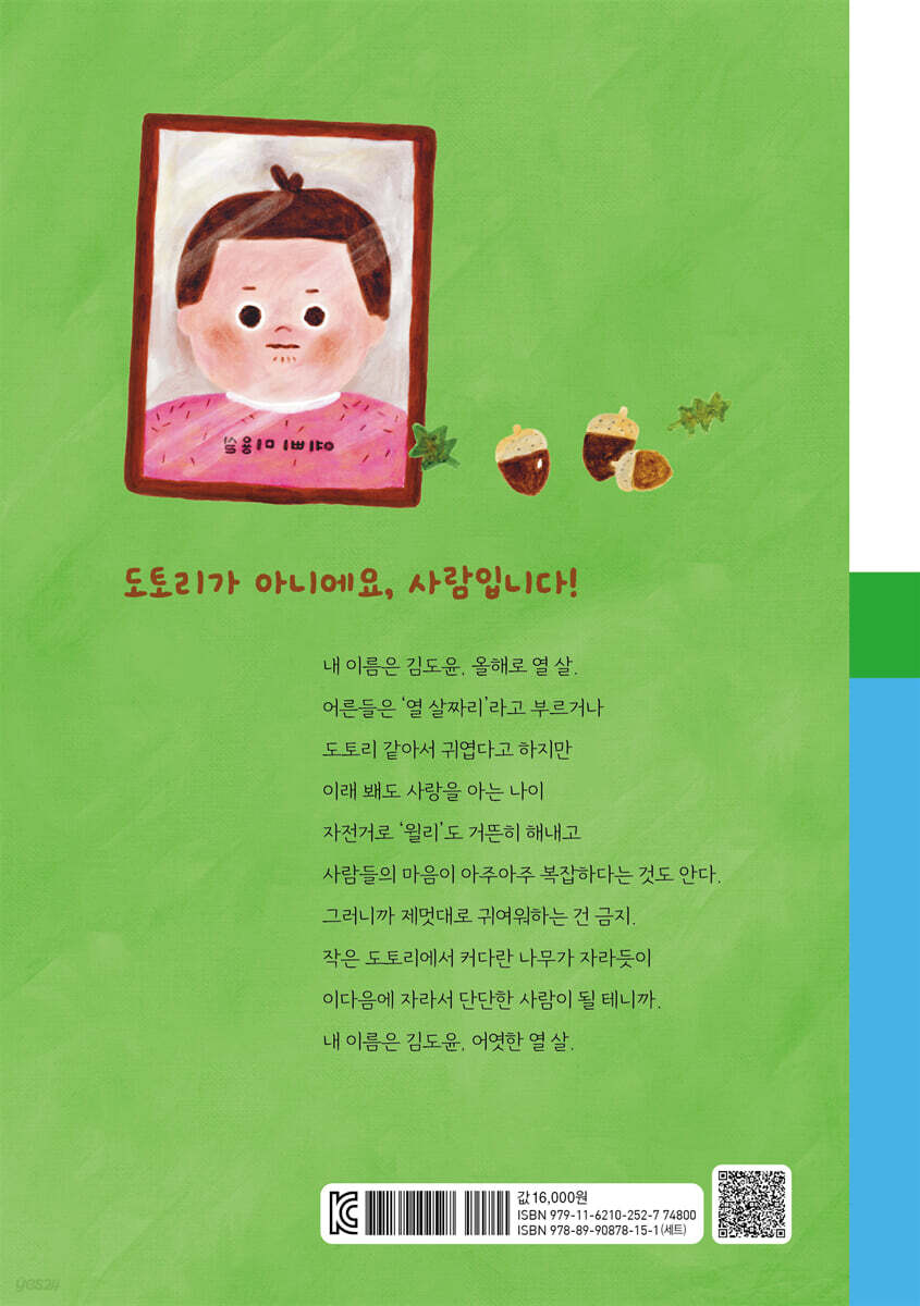 어른들은 이따금 나를 ‘열 살짜리’라고 부른다. 열 살 뒤에 ‘짜리’를 붙여서 내가 어리다는 걸 강조하려는 거다. 마흔 살이 넘은 우리 엄마 아빠보다 내가 많이 어린 건 맞다. 하지만 나는 어른들 생각처럼 어리기만 한 건 아니다. --- p.9 “사마귀를 이렇게 자세히 본 건 오늘이 처음이야.” “나도 그래.” 영은이 말에 내가 맞장구쳤다. “진짜 험악하게 생겼다.” “어허, 말조심해. 듣는 사마귀 님 기분 나빠.” 사마귀 턱이 뾰족해서 인상이 날카로워 보이는 건 나도 인정한다. 그렇다고 험악하다는 말까지 들을 이유는 없지 않을까. 누가 내 외모를 그렇게 말하면 난 엄청 속상할 것 같았다. “사마귀는 이렇게 생긴 게 잘생긴 거야.” --- p.28 막 돌아서려는 찰나였다. 사마귀가 갑자기 기어가던 다리를 우뚝 멈추었다. 그리고 배를 흔들흔들 움직이기 시작했다. 사마귀와 함께한 지난 시간 동안 한 번도 보지 못했던 모습이었다. 나는 눈을 크게 뜨고 내 사마귀를 바라보았다. 잠깐 동안이긴 했지만 사마귀가 춤추듯 배를 흔들었다. “잘 가.” 나는 손을 흔들며 말했다. 바람이 소소소 불었다. 사마귀가 천천히 풀 사이로 사라졌다. --- p.64 “헬멧을 써도 안 되는 건 안 돼. 외발자전거도 아니고 쓸데없이 앞바퀴를 왜 들고 타? 제발 그냥 ‘정상적’으로 타라, 아들.” 엄마 말에 나는 화가 났다. 마음 같아선 식탁 옆에서 방방 뛰며 소리 지르고 싶었다. ‘치! 엄마 맘에 드는 것만 ‘정상’인가? 그런 게 어딨어?’ 눈시울이 붉어지고 목구멍이 뜨거워졌다. --- p.84 “영은아, 있잖아. 내 머리가 도토리처럼 깎였어.” “도토리? 왜 그랬어?” 내 말에 영은이가 되물었다. “내가 원한 게 아니야. 내가 단지 어린이라서, 그렇게 깎으면 귀여울 거라고 어른들 마음대로 그렇게 깎아 버렸어. 내가 귀여워 보여서 좋은 건 어른들뿐인데…….” “싫다고 똑 부러지게 표현했어야지.” “몰라. 나 이제 어떡해.” --- p.134 책에서 보았는데, 이 작은 도토리 안에는 커다란 나무로 자랄 수 있는 무한한 잠재력이 숨어 있다고 한다. 오늘 내 마음속에 자리 잡은 단단한 무엇도 언젠가는 커다란 나무처럼 자라날 수 있을까. 나는 눈을 감고 멋진 나무 한 그루를 떠올려 보았다. 설렘으로 가슴이 두근대었다. ‘아아, 난 커서 어떤 사람이 될까?’ --- p.164 |