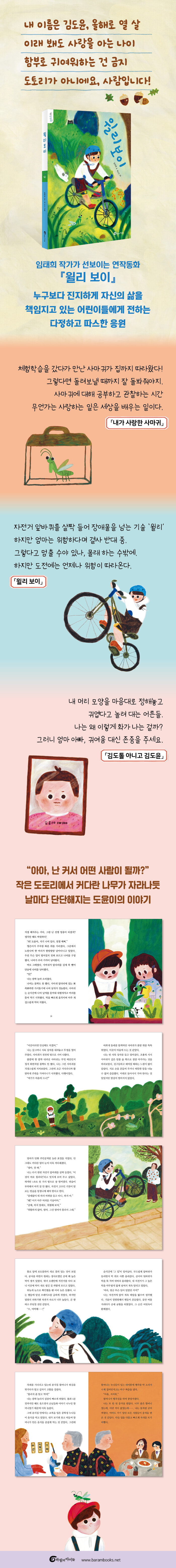 자기 자신의 미래에 대해 궁금해하는 어린이들에게 『윌리 보이』는 「내가 사랑한 사마귀」와 「윌리 보이」, 「김도톨 아니고 김도윤」 세 편의 단편으로 구성된 연작동화집이다. 주인공 도윤이는 절친 기찬이와 효재랑 자주 어울려 놀고, 어른스러운 대화 상대가 되어주는 영은이하고도 친하게 지낸다. 이야기는 공원에서 사마귀를 데려오거나 틈틈이 친구들과 자전거 기술을 연습하는 등 도윤이의 어린이다운 생활을 충실히 따라가면서도 도윤이가 모든 일을 어떻게 바라보고 어떤 생각을 하는지에 초점을 맞춘다. 그렇다면 「윌리 보이」에서 턱을 꿰매는 부상을 입은 도윤이는 이제 엄마 말을 들으면 자다가도 떡이 생긴다는 교훈을 얻게 되었을까? 묘하게도 즉각적인 교훈을 얻은 건 도윤이가 아니라 윌리를 금지시켰던 엄마다. 밥 먹다 사레 들린 아빠가 “죽을 뻔했다”고 말하는 것을 듣고는 세상에 위험하지 않은 일은 하나도 없다는 걸 깨달은 것이다. 엄마는 도윤이의 마음을 몰라 준 것을 사과하고 그 대신 앞으로는 몰래 타지 말라고 타이른다. 문제는 도윤이다. 자전거를 타고 싶지만 겁이 나서 탈 수가 없게 된 것이다. 피를 철철 흘리고 음식도 제대로 먹을 수 없는 고통에 시달렸으니 그럴 만도 하다. 결국 도윤이에게 중요한 것은 엄마 말을 잘 들어야겠다는 교훈을 얻는 일이 아니라 무언가 도전하다가 실패했을 때 어떻게 극복할 것인가 하는 점이다. 두려움이란 누구의 도움도 없이 스스로 극복해야 할 일이다. 도윤이는 과연 자전거를 다시 탈 수 있을까? 「김도톨 아니고 김도윤」은 좀더 복잡한 이야기를 들려준다. 어느 날, 미용실에 갔다가 우스꽝스러운 모양으로 머리를 깎게 된 도윤이는 아빠가 도토리 닮았다고 놀리자 너무나 화가 난다. 어른들이 어린이를 놀리며 귀여워하는 흔하디흔한 풍경. 그런데 도윤이는 왜 화가 나는지, 화가 난다는 사실을 어떻게 표현해야 할지, 화를 어떻게 다스려야 할지 도무지 모르겠다. 사람의 마음이나 감정은 한없이 복잡한 것이고 단순하게 설명하거나 이해하기 어려운 영역이기 때문이다. 그렇기 때문에 다른 사람과 이야기를 나누는 것이 중요할 것이다. 도윤이는 주위를 둘러보고 분노라는 감정에 대해 이모조모 생각해본 끝에 마침내 아빠에게 도토리라고 놀리지 말라고 요청한다. 앞으로 머리도 혼자 깎으러 가겠다고 말하자 아빠는 당황하지만 곧 미소를 짓는다. “그래, 그러렴.” 마침내 도윤이는 자신이 하고 싶은 말을 그대로 말해도 괜찮은 거라는 사실을 깨닫는다. 『윌리 보이』는 사춘기에 돌입하기 직전의 어린이들이 어린이다움을 간직한 채 진지하게 성장해가는 모습을 들여다보는 동화로, 동화 작가 임태희가 오랜만에 선보이는 작품이다. 등단작 『내 꿈은 토끼』에서 고분고분하지 않고 할 말 다 하는 어린이를 통해 유년 시절을 새롭게 바라보게 했던 젊은 작가는 이제 어린이의 삶을 곁에서 지켜보는 다정한 양육자의 시선을 갖추고 돌아왔다. 어른들도 틀릴 수 있고 아이들처럼 계속해서 배울 게 많으니까. 작가에게는 어린이가 몇 살이든 충분히 존중하고 믿어야 한다는 신념이 여전하다. 각각의 나이에 맞는 방식으로 어린이도 제 삶에 책임감을 갖고 있을 터. 열 살 도윤이는 여전히 자라는 중이고 앞으로도 사람에 대해, 세상에 대해 많이 배워야 할 것이다. 중요한 건 자신의 삶을 진지하게 대하는 자세이다. “아아, 난 커서 어떤 사람이 될까?” 스스로에 대해 궁금해하는 어린이란 얼마나 믿음직스러운 존재인지. 이제 막 유년기를 벗어나려는 중학년 어린이들에게 꼭 필요한 책이다. |