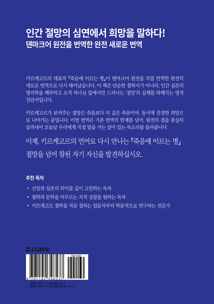 오늘 우리는 풍요 속의 공허를 살아갑니다. 겉으로는 성공과 행복을 추구하지만, 마음 깊은 곳에서는 불안과 절망이 더 크게 자리를 차지합니다. 키르케고르가 《죽음에 이르는 병》에서 진단한 ‘절망’은 단순한 우울이나 슬픔이 아닙니다. 자기 자신을 잃어버리고, 진정한 나로 살지 못하는 상태?오늘날 많은 사람들이 겪는 내적 공허와 정확히 맞닿아 있습니다. 이 책은 절망의 정체를 직시하도록 이끌고, 그 속에서 희망으로 나아가는 길을 보여줍니다. 그래서 《죽음에 이르는 병》은 19세기 철학서가 아니라, 지금 우리 시대를 위한 영적 안내서입니다. “당신은 이미 병들어 있다. 그러나 이 병은 몸의 병이 아니라, 자기를 잃어버린 절망의 병이다.” 키르케고르가 말한 이 ‘죽음에 이르는 병’은 오늘 우리 시대가 숨기고 있는 얼굴입니다. 이 책은 당신이 피하려 했던 절망을 정면으로 마주하게 하고, 그 속에서만 열리는 참된 희망을 보여줍니다. 《죽음에 이르는 병》 1부와 2부는 무엇을 다루나요? 이 책은 크게 두 부분으로 나뉩니다. 1부 - 절망의 얼굴들 키르케고르는 인간 안에 숨어 있는 ‘절망’을 해부합니다. 그는 절망을 단순한 우울이나 슬픔이 아니라, “자기를 잃어버린 병”이라고 말합니다. 자기를 제대로 알지 못하는 절망, 자기를 부정하는 절망, 그리고 하나님 없이 스스로 서려는 절망이 다양한 모습들을 하나하나 보여줍니다. 2부 - 절망을 넘어서는 길 하지만 책은 절망을 말하는 데서 멈추지 않습니다. 절망의 뿌리는 결국 하나님과의 단절, 곧 죄라는 것을 밝히며, 그 치유의 길은 오직 그리스도 안에서의 믿음임을 전합니다. 믿음은 우리를 참된 자기 자신으로 회복시키고, 절망을 넘어 희망으로 나아가게 합니다. 그래서 《죽음에 이르는 병》은 단순한 철학서가 아니라, 오늘을 사는 우리에게 “자기 자신을 잃지 않고 살아가는 법”을 알려주는 삶의 안내서이자 희망의 책입니다. 《죽음에 이르는 병》의 집필 시기 《죽음에 이르는 병》은 1849년, 키르케고르가 ‘안티-클리마쿠스(Anti-Climacus)’라는 가명으로 발표한 저작입니다. 키르케고르의 후기 대표작 가운데 하나로, 인간 실존을 “절망”이라는 관점에서 분석하며, 오직 그리스도 안에서의 믿음만이 절망을 치유할 수 있다고 주장합니다. 당대 덴마크 교회와 사회를 향한 신학적 비판이자, 동시에 가장 심오한 실존 진단서로 평가받습니다. 이번 번역의 특징 이번에 선보이는 《죽음에 이르는 병》은 단순히 또 하나의 번역본이 아닙니다. 1. 현대 독자를 위한 존댓말 번역 딱딱하고 낡은 문체 대신, 오늘의 언어로 자연스럽게 옮겼습니다. 키르케고르가 지금 우리에게 직접 말을 거는 듯한 생생함을 담았습니다. 2. 성경 어휘를 충실히 반영 《죽음에 이르는 병》은 철학서이자 동시에 성경에 뿌리내린 신학적 저작입니다. 이번 번역은 성경(개역개정)의 표현을 충실히 반영하여, ‘죄’, ‘절망’, ‘믿음’, ‘희망’ 같은 핵심 개념을 본래 의미대로 되살렸습니다. 그 결과, 이 책은 단순한 철학책이 아니라 영적 진단서로 읽히게 됩니다. 3. 덴마크어 원전에서 직접 옮긴 새로운 번역 기존 한국어 번역과 달리, 중간 언어가 아닌 덴마크어 원전을 바탕으로 옮겼습니다. 원전의 깊이와 뉘앙스를 최대한 살려내어, 한국어로 처음 만나는 완전히 새로운 번역본입니다. |