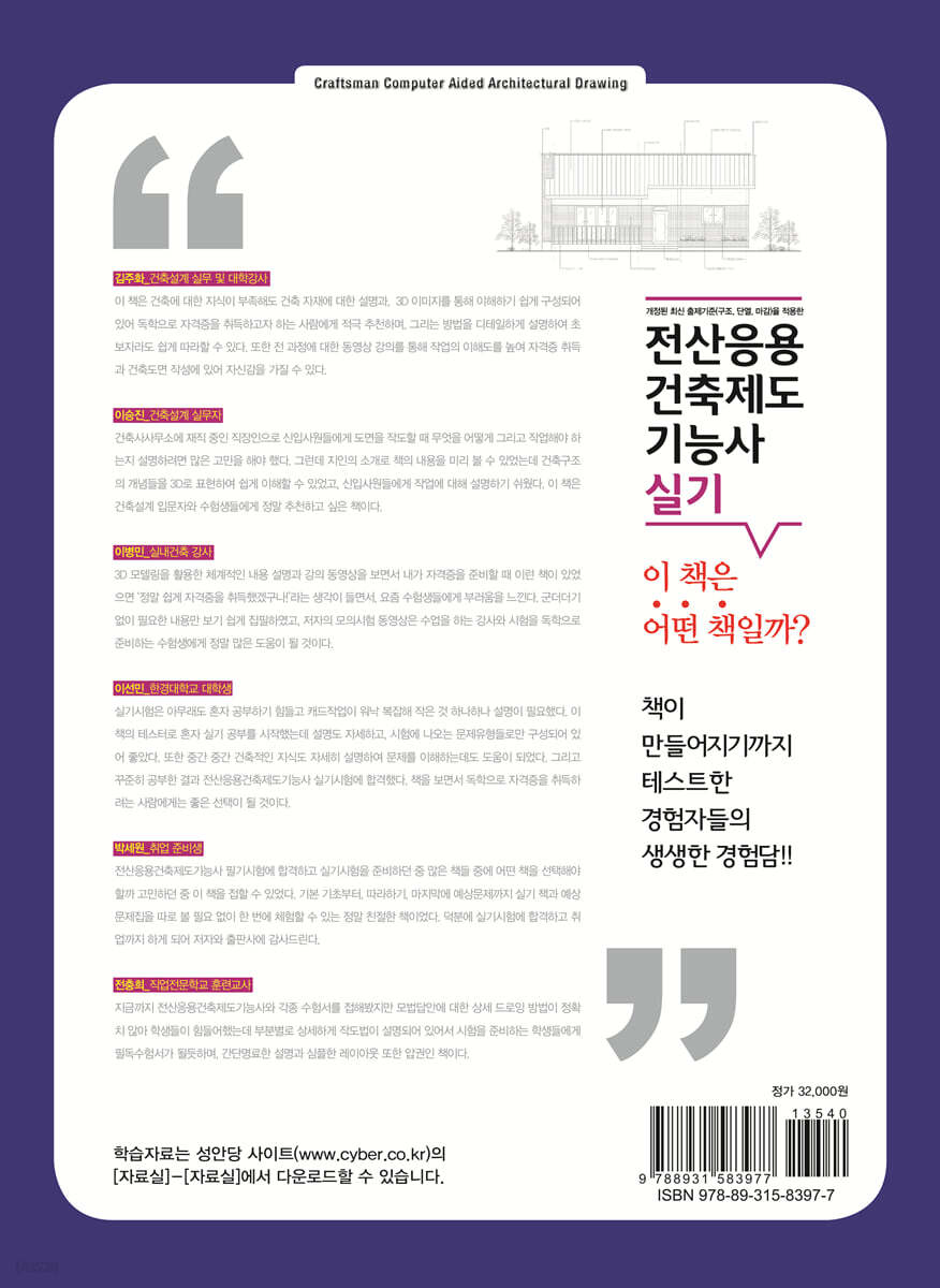 - 건축 CAD 분야 23년 경력의 현직 강사 집필 - AutoCAD 초보자도 쉽게 학습할 수 있는 동영상 강의 제공 - 3차원 모델을 바탕으로 이해도를 높인 설명과 작성 과정 기술 - 과정평가형 과정 외부평가 공개문제 및 기출문제 - 저자 블로그를 통한 신속한 학습 지원 - 2015년~2025년 기출문제 수록 - 무료 동영상 강의 및 완성파일 제공 전산응용건축제도기능사는 1997년 자격종목 신설 이후 지금까지 과거의 설계조건을 그대로 출제하고, 관련 교재들도 90년대에 작성된 도면을 그대로 반영하여 많은 부분이 현실과 맞지 않았습니다. 하지만 2014년 3회(의무검정) 실기시험부터는 지금까지 출제되었던 설계조건에서 바닥구조와 단열조건이 현실에 맞게 수정되어 출제되었고, 2025년 발표한 공개문제를 수록했습니다. 또한 일선 교육기관의 요청으로 과정평가형 과정 외부 평가 공개문제 및 기출문제를 수록하였습니다. 이 책은 새로운 출제기준과 조건을 반영하여 좀 더 빠른 자격증 취득에 도움을 드릴 것입니다. |