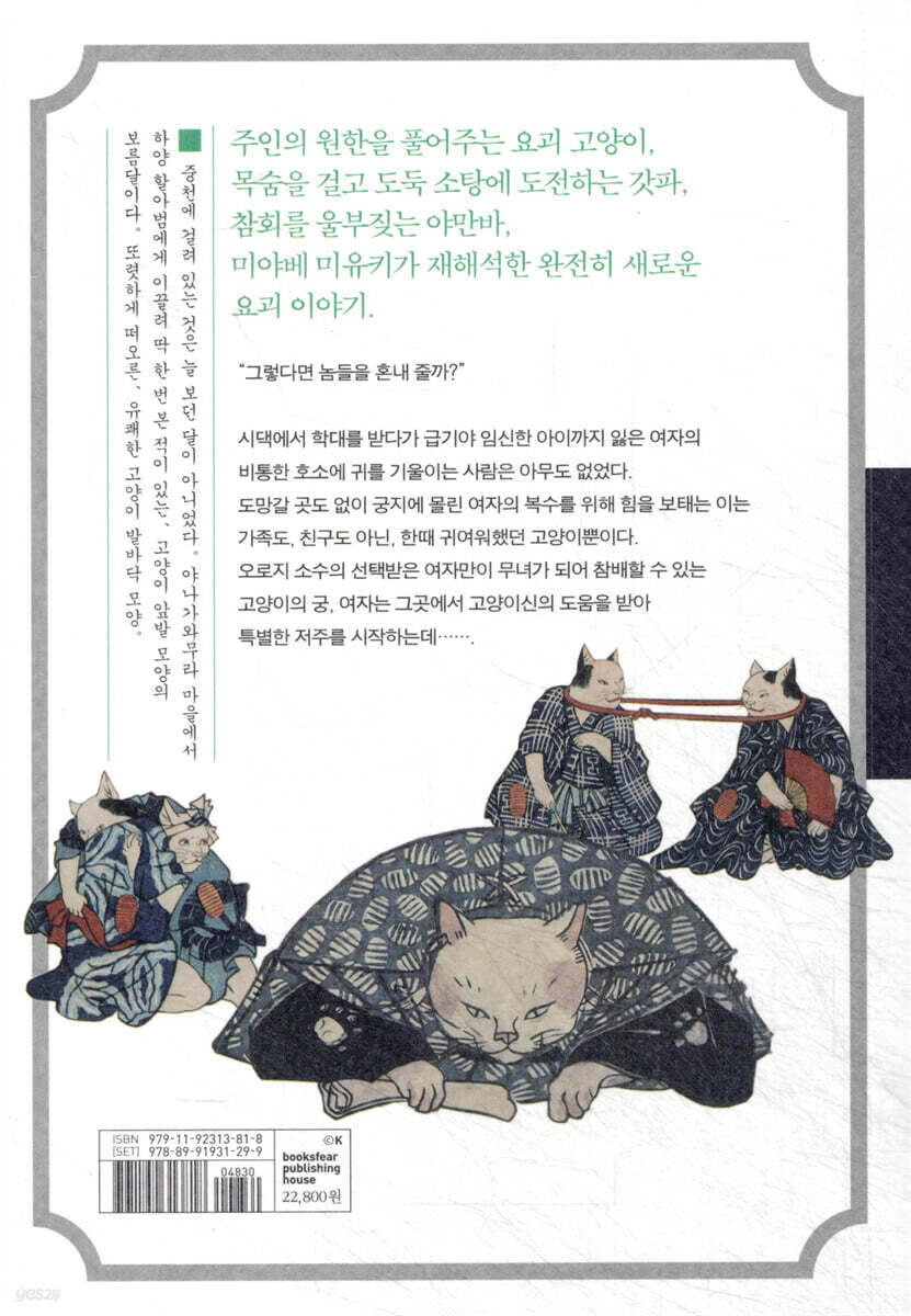 예스펀딩 1463% 달성! 일본 최고의 미스터리 작가 미미여사의 미시마야 시리즈 신작. 주인의 원한을 풀어주고 업을 받는 요괴 고양이부터 희대의 악녀에게 복수하는 모녀 등 잔인한 세계 속에서 어떻게든 삶을 완성해나가는 이야기.