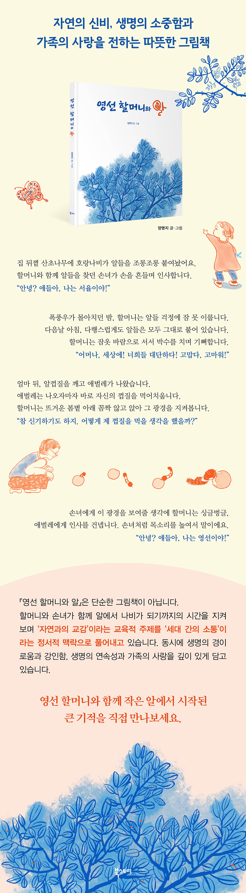 이 책은 손녀 서율이가 산초나무에서 호랑나비 알을 발견하면서 시작된다. 서율이가 알을 향해 “새 친구들”이라 부르며 다정히 인사하는 모습에서부터 작은 알이 애벌레가 되고 다시 나비로 날아가기까지의 과정을 따라가며 독자는 새로운 생명이 주는 기쁨과 설렘을 함께 느낄 수 있다. 이를 위해 작가는 장면마다 알의 변화를 확인할 수 있도록 화면을 할애하여 소박하지만 섬세하게 그 과정을 표현해 놓았다. 그러던 어느 저녁, 거센 비바람이 몰아치고 할머니는 알들이 걱정되어 잠을 이루지 못한다. 다음날 아침 할머니는 잠옷 차림으로 달려가 알들을 확인한다. 다행히 알들은 모두 그대로 붙어 있었고, 할머니는 그런 알들을 보며 진심으로 기뻐하고 생명의 강인함에 깊은 감동을 받는다. 며칠 뒤 알에서 애벌레가 깨어나고, 나오자마자 자기 껍질을 먹어치운다. 이 장면을 꼼짝 않고 지켜본 할머니는 손녀가 태어나자마자 엄마 젖을 찾던 순간을 떠올린다. 이렇게 자연 속 작은 생명이 가족의 사랑과 연결되며 책은 단순한 관찰 기록을 넘어 삶의 연속성과 유대의 가치를 담아낸다. 또한 이 책은 자연과 교감하는 경험을 세대 간 소통이라는 정서적 맥락 속에 녹여낸다. 특히 그 교감은 일방적이지 않다. 손녀가 먼저 알에게 다가가 인사하고, 이를 본 할머니가 따라 하며 서로의 마음을 이어간다. “안녕? 나는 서율이야!”라는 손녀의 순수한 인사에 이어 “안녕? 나는 영선이야!”라며 화답하는 장면은 아이와 어른이 자연을 통해 마음을 나누는 순간을 상징적으로 보여준다. 이는 세대가 자연을 매개로 연결되고, 서로의 세계를 이해하는 과정을 보여준다. 나아가 삶을 긍정적으로 바라보는 태도와 가족에 대한 사랑을 동시에 일깨워준다. 작가의 실제 경험에서 탄생한 이야기 이 작품은 작가의 실제 경험을 바탕으로 쓰였다. 첫 손자가 여섯 살이던 무렵, 집 뒤에 심은 산초나무에 매년 호랑나비가 찾아와 알을 낳았고, 작가는 손주들과 그 과정을 지켜보며 깊은 감동을 느꼈다. 작가는 “호랑나비 알은 15년 넘게 손주들과 이어진 특별한 매개체였다. 작은 생명이 세대를 이어주고 대화를 열어주는 다리가 되었다. 이 책을 통해 다른 가정에도 그런 따뜻한 순간이 전해지길 바란다”고 밝혔다. 『영선 할머니와 알』은 어린이에게는 호랑나비의 생태 과정을 흥미롭게 알려주는 학습 그림책이자, 성인에게는 삶과 시간의 의미를 되새기게 하는 감성 동화다. 아이들은 자연의 경이로움을 배우고, 부모와 조부모 세대는 잊고 있던 생명의 소중함과 가족 간의 유대감을 다시금 느낄 수 있다. 또한 작은 알에서 시작된 위대한 생명의 여정을 통해 현대사회에서 점점 희미해져 가는 자연과의 교감을 회복하고 세대를 잇는 사랑의 가치를 일깨우는 경험을 하게 될 것이다. |