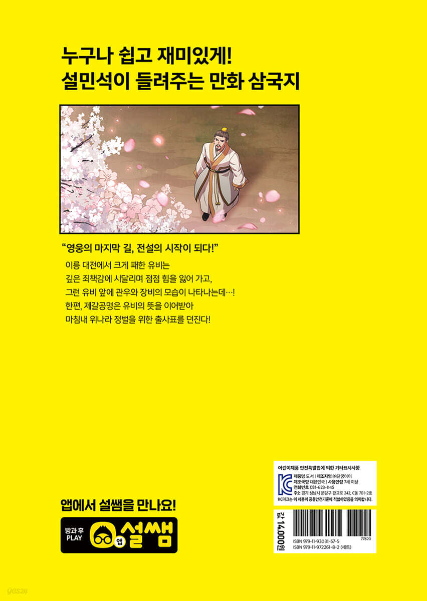 삼국지를 난생처음 읽는 독자를 위해, 방대한 내용을 핵심적으로 담았습니다. 복잡한 이름, 반복되는 사건은 간결하게 정리하여 삼국지를 그 누구보다 쉽고 재미있게 설민석 선생님이 들려드립니다. 2. 눈길을 사로잡는 색다른 그림 웹툰 명가 ‘재담미디어’ 산하의 ‘스튜디오 담’이 각색과 작화에 참여하여, 새로운 스타일의 만화 〈설민석의 삼국지 대모험〉이 탄생했습니다. 생동감 넘치는 캐릭터와 그림이 요즘 어린이의 눈길을 사로잡습니다. 3. 놀라운 상상력으로 탄생한 새로운 인물 ‘유비, 관우, 장비’ 같은 영웅뿐만 아니라, 삼국 시대를 살았던 평범한 사람들이 이름을 가지고 등장합니다. 상상력으로 탄생한 새로운 인물을 지켜보며 이야기에 더욱 공감하고 몰입해 보세요. 4. 이야기 속의 또 다른 이야기! 삼국지 이야기를 실감 나게 들려주는 ‘마람카’, 그 이야기에 점점 빠져드는 어린 황제 ‘아자드’! 마람카와 아자드에게 무슨 일이 벌어지고 있는 걸까요? 두 사람의 긴장감 넘치는 이야기는 또 다른 기대를 불러일으킵니다. . 꼼꼼하게 담은 권말 역사 정보 삼국지의 배경이 되는 실제 인물과 사건 등 배경지식과 정보를 꼼꼼하고 정확하게 담았습니다. 〈삼국지연의〉와 비교하여 이 책에서만 볼 수 있는 이야기도 만날 수 있습니다. 또한 〈정사 삼국지〉 내용까지 간략하게 비교한 표를 수록하여, 방대한 내용의 삼국지 정보를 한눈에 볼 수 있습니다. |