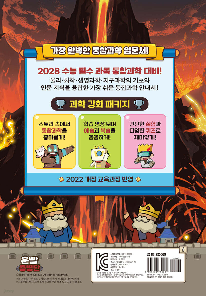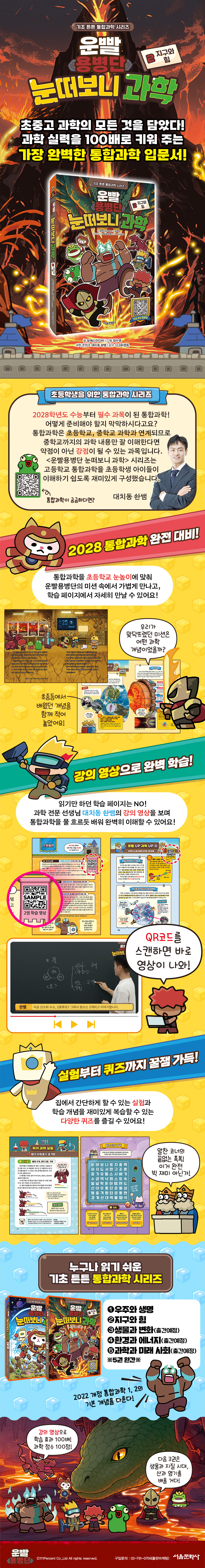 · 과학 분야에 관심이 많은 친구 ·YES · 도파민 가득한 스토리를 읽고 싶은 친구 ·YES 〈운빨용병단 눈떠보니 과학〉 시리즈로 모두 모여! 기초 튼튼 통합과학 시리즈 『운빨용병단 눈떠보니 과학』 2권 지구와 힘 편 출간! 통합과학의 핵심 내용과 흐름을 초등 눈높이에 맞춰 쉽게 풀어낸 만동화 시리즈입니다. 용병단의 모험 속에서 과학 개념을 퀘스트 해결하듯 재미있게 다루고, 강의 영상을 보고 학습 페이지를 읽으며 자연스럽게 통합과학을 내 것으로 만들 수 있습니다. 학부모와 아이들 모두가 찾던 가장 완벽한 통합과학 입문서 〈운빨용병단 눈떠보니 과학〉 시리즈! 1.2028학년도 수능 통합과학 ‘완전하게’ 대비 2028학년도 수능부터 문과·이과 구분 없이 새롭게 도입되는 필수 과목 ‘통합과학’은 초등학교, 중학교 과학 내용과 연계됩니다. 〈운빨용병단 눈떠보니 과학〉 시리즈는 고등학교 통합과학을 아이들이 이해하기 쉽도록 초등학교, 중학교까지의 과학 내용과 고등학교에서 새롭게 배우게 될 심화 개념을 함께 연결하여 정리했습니다. 2. 강의 영상으로 학습 내용을 ‘꼼꼼하게’ 학습 이 시리즈의 과학 원고를 집필하신 선생님이 직접 설명해 주는 강의 영상을 보며 학습 페이지의 내용을 보다 정확하고 쉽게 이해할 수 있습니다. 장별 학습 페이지 상단에 있는 QR 코드를 스캔만 하면 영상을 바로 볼 수 있도록 디지털 접근성을 높였습니다. 선생님의 재미있는 설명과 놀라운 실험을 보고 들으며 과학적 호기심을 충족시키고, 통합과학 교육과정에서 요구하는 융합적인 사고 능력을 기를 수 있습니다. 내용이 어렵다면 QR코드를 스캔해 언제든지 영상을 다시 볼 수 있습니다. 3. 알찬 학습 페이지를 ‘완벽하게’ 구성 각 장 끝에 있는 〈운빨 UP 과학 UP〉 학습 페이지를 읽으며 통합과학의 핵심 개념을 한 눈에 정리할 수 있습니다. 〈럭키 과학 실험〉은 집에서 간단하게 실험할 수 있는 활동을 소개하고, 〈럭키 과학 상식〉은 고등학교에서 다루는 내용이나 일상·사회 문제와 관련된 과학 상식을 쉽게 소개합니다. 마무리로 〈운빨 퀴즈쇼〉의 다양한 퀴즈를 풀며 학습 내용을 복습할 수 있습니다. |