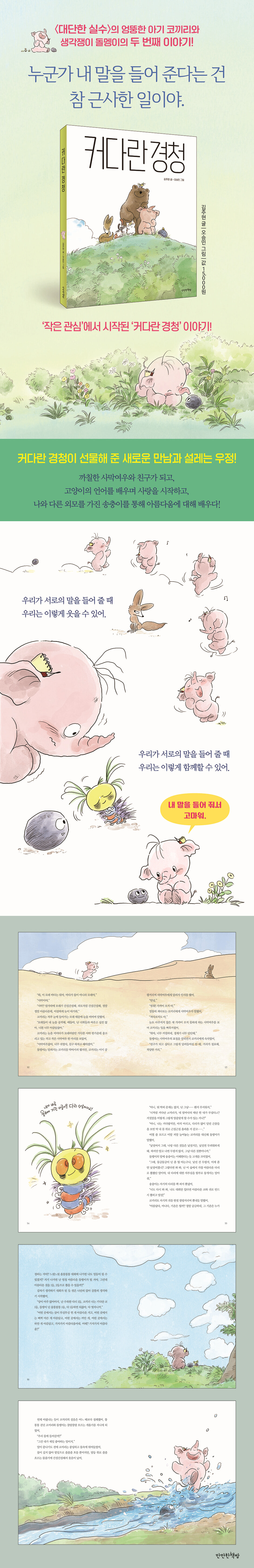 “친구 따위 필요없다고!”를 외치는 친구들에게 더 필요한 책! 어느 날, 길을 걷던 돌멩이와 코끼리는 모래바람만 가득한 사막에서 혼자 사는 사막여우를 만났어요. 작고 작은 사막여우를 보는 순간 코끼리는 너무 귀엽다며 친구 하자고 달려갔어요. 돌멩이가 말릴 새도 없이요. 하지만 사막여우는 눈도 마주치지 않은 채 가까이 오지도 못하게 해요. 이런 사막여우를 보고 코끼리는 까칠하다며 투덜거리죠. 사실 사막여우는 자기보다 큰 동물한테 잡아먹히기가 쉬워요. 그래서 경계심이 강하죠. 그런데 생전 처음 본 어마어마하게 큰 코끼리를 보고 얼마나 놀랐겠어요. 그럼 사막여우랑 친구가 되려면 어떻게 해야 할까요? [커다란 경청]은 서로 다른 환경에서 자란 동물들의 모습을 통해서 친구란 무엇인지, 친구가 되려면 어떻게 해야 하는지 생각하게 만듭니다. “친구 따위 필요없다고!”를 외치는 아이가 있다면 사막여우과 코끼리의 이야기를 들려주세요. 커다란 귀를 펄럭이며 서로의 이야기에 귀 기울이는 둘도 없는 친구가 되는 법을 배울 수 있을 거예요. “낯설면 두렵지만 알고 나면 두렵지 않아. 그냥 다른 것뿐이니까.” 서로를 이해하는 가장 좋은 방법, 그건 바로 커다란 경청! 우리는 모두 자기만의 대화 방식이 있어요. 어떤 사람은 말을 많이 하지요. 아기 코끼리처럼요. 어떤 사람은 과묵해요. 돌멩이처럼요. 근데 입이 아니라 몸으로 말하는 친구도 있어요. 고양이들은 꼬리로 자신의 마음을 표현하거든요. 생김새는 어떨까요. 자신과 다르게 다리가 많은 송충이를 처음 본 코끼리는 “악, 징그러워!”라고 소리쳤어요. 자신의 다리에 자부심을 가지고 있던 송충이는 코끼리의 말에 마음의 상처를 입고 맙니다. 낯설면 두렵지만, 알고 나면 두렵지 않습니다. 그냥 다른 것뿐이니까요. 서로의 다름을 인정하지 않을 때 소통은 막힙니다. 작가는 이 책에서 사이좋게 지내려면 서로의 언어를 알아가야 한다고 말합니다. 서로의 말을 잘 듣고, 잘 보는 게 사랑의 시작이라고요. 우리가 서로에게 줄 수 있는 가장 큰 선물은 “잘 들어주는 것”이라는 사실을 작가는 깊이 있게 그리고 재미있게 전하고 있습니다. 아기 코끼리는 고양이와 대화를 할 수 있을까요? 마음의 상처를 준 송충이와 화해를 했을까요? 언어가 달라도, 모습이 달라도 사랑의 마음으로 서로가 가진 생각과 방식을 나누다 보면 더 큰 새로운 세상이 펼쳐진다는 것을 이 책은 보여 줍니다. “내 말에 귀 기울여 들어 주는 건 커다랗게 두 팔로 안아 주는 기분이야.” 내 모습 그대로를 좋아해 주는 단 하나의 친구! ‘경청’이라는 말은 귀 기울여 듣는 걸 뜻해요. 잘 들으면 서로를 이해할 수 있어요. [커다란 경청]에서 돌멩이는 위로해 줄 손도 들어줄 귀도 없지만 그 누구보다 코끼리의 이야기를 커다랗게 들어주고 아픈 마음을 위로해 줄 줄 알았어요. 무엇보다 있는 그대로 친구를 좋아해 준답니다. 코끼리에게 돌멩이는 소중한 걸 넣어 두는 호주머니 같은 존재예요. 돌멩이가 없었다면, 코끼리가 생각해 낸 “까칠한 경계” “오톨도톨한 사랑” 같은 멋진 단어들을 간직할 수 없었을 거예요. 경계심이 많아 적당한 거리가 필요했던 사막여우, 대화 방식이 달라 그들의 언어를 배워야 이해할 수 있었던 고양이들, 겉모습이 달라 서로가 가진 아름다움을 이해하지 못했던 송충이와의 만남과 자신의 모습만 보고 미련곰탱이로 불리는 것에 상처받았던 곰과의 만남까지. 서로를 이해하는 가장 좋은 첫 번째 방법은 서로의 이야기를 귀 기울여 잘 들어주는 거라는 걸 보여 줍니다. 처음에는 너무 달라 오해가 많았던 돌멩이와 코끼리도 이제는 누구보다 서로를 잘 이해하게 됐답니다. 함께하는 시간이 길어서가 아니라, 서로의 이야기를 귀 기울여 커다랗게 들어주었기 때문이에요. 지금 여러분 곁에 돌멩이나 코끼리처럼 자신의 장점을 알아주는 친구가 있나요? 자신의 있는 그대로의 모습을 좋아해 주는 친구가 있나요? 혹시 없다면 내가 먼저 커다란 경청을 해 보면 어떨까요? |