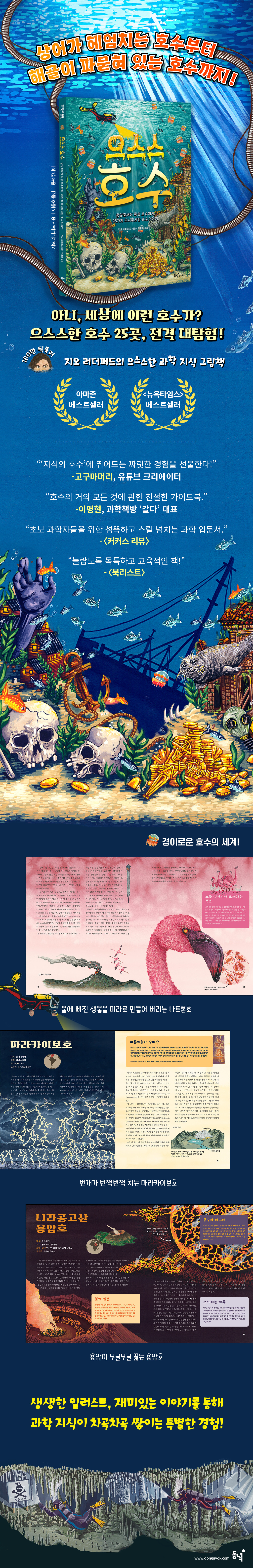 상어가 헤엄치고, 용암이 흐르고, 해골이 잠들어 있는 25가지 무시무시한 호수들 《으스스 호수》는 우리 지구에 있는 25개의 미스터리 호수를 소개한다. 개중에는 과연 호수라고 부르는 게 맞는지 의심스러운 것도 있다. 물이 아닌 용암이나 아스팔트, 부글부글 끓는 산성 액체, 방사능에 오염된 물로 채워진 호수가 바로 그것이다. 이런 호수가 생겨나는 데는 여러 가지 원인이 있다. 어떤 호수는 빙하나 운석에 의해 땅이 패여 자연스럽게 만들어지기도 하고, 저수지나 수력 발전, 폐기물을 버리는 장소로 쓰려고 인공적으로 만들어지기도 한다. 독특하고 으스스한 호수들에 대해 알아 갈수록 독자들은 이 수역들이 단지 하늘을 반사하는 고요한 웅덩이가 아니라 역사와 과학을 품은 놀라운 영역이라는 것을 알게 될 것이다. 이 호수들은 우리가 사는 지구의 놀라운 다양성, 회복 탄력성뿐만 아니라, 무궁무진한 자연의 경이를 새롭게 알 수 있게 해 준다. 하지만 호수들은 현재 기후 변화의 영향을 많이 받고 있다. 수많은 호수가 사라지는 한편, 어떤 호수들은 생태계를 해치는 환경오염 때문에 신음하고 있다. 이 책은 지구의 경이로운 호수들의 면면을 보여 주면서 이를 지키는 방법을 고민하게 한다. 우리 주변의 호수를 들여다보며, 물속에는 눈에 보이는 것보다 더 많은 사실이 숨어 있다는 사실을 떠올리는 것도 좋은 독서 경험이 될 것이다. 읽을수록 차곡차곡 쌓이는 과학 지식 어린이 과학자들을 위한 아주 특별한 과학 그림책 탄자니아의 나트론호에 생물이 빠지면 왜 미라가 되어 버릴까? 여기엔 사실 어떤 마법이 있는 것은 아니다. 뜨거운 물과 강한 염기성, 높은 염도가 그곳에 빠진 생물의 피부를 태운 뒤, 바삭바삭한 미라로 만들어 버리는 것이다. 매일같이 번개가 번쩍번쩍 치는 베네수엘라의 마카라이보호는 어떠한가? 이곳의 독특한 지형과 기후는 폭풍의 발달과 번개 발생에 아주 이상적인 환경이다. 그뿐만이 아니다. 어떻게 바다에 사는 무시무시한 황소상어가 니라카과의 민물호수에서 살게 되었을까? 황소상어가 가진 체액 염분 조절 능력에 그 비밀이 있다. 이처럼 호수의 비밀을 따라가다 보면 독자들은 우리 자연에 녹아 있는 흥미로운 과학 지식을 보다 쉽고 재미있게 익히게 된다. 또한, 책의 도입부에 있는 〈호수에 관한 이런저런 사실들〉을 통해 독자들은 육수학이라는 낯선 영역을 배울 준비를 마치고, 호수에 대한 비밀을 본격적으로 탐구할 수 있다. 본문 마지막에는 어려운 용어에 대한 풀이까지 실려 있어 배움의 깊이를 더한다. 알찬 읽을거리 속에 작가가 그림 곳곳에 숨겨 놓은 아주 작은 유령을 찾아보는 것도 이 책만의 소소한 재미이다. 이 책은 호기심 가득한 어린이 과학자들을 위한 특별한 과학 그림책이다. 이 책을 따라 전 세계의 호수로 모험을 떠나면서 소름이 잔뜩 돋고, 우리 세계의 기묘한 것들에 대한 호기심이 불타오르길 바란다. 호숫가를 걸을 때는 경계를 늦추지 말길. 발밑의 어두운 물속에는 알려지지 않은 무시무시한 것들이 숨어 있으니까! |