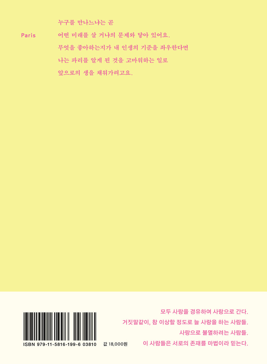 012 와인은 누구로부터 누군가에게로 연결되어 있음을 018 카페 팔레트의 늪 같은 시간 024 꿈이라는 방 한 칸 028 창문 가득 꽃향기 030 영혼의 여름날, 그리고 바람 한 점 037 그래서 그래 040 이번 생의 나는 너무했다 046 와인 고래 052 만찬까지는 아니더라도 060 기다리니 좋았다 066 골목 아닌데 더 골목 같은 072 여름날의 레몬그라스 074 저쪽으로 가자 078 하면 안 되는 것을 해볼까, 물론 해도 되는 것은 하고 082 운하 쪽에는 좋은 일이 기다리고 있을 것만 같다 088 살아 있는 시인들의 사회 092 어디로 096 우리 마음은 밤에 일제히 운다 102 불이 켜지면 사랑하겠다 106 에필로그 : 자꾸 말하면 꿈이 되지요 108 파리에서 낭만을 이야기하기 좋은 곳 111 그린이의 말 : 무언가를 남기고 왔습니다 |