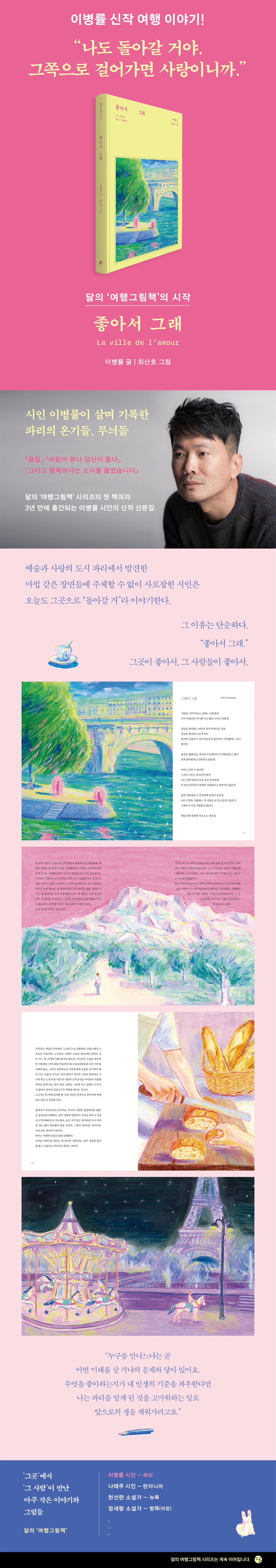그게 행복일 거라는 생각이 문득,” 마음이 끌리는 것을 오래 바라보는 일은 그 안에서 나 자신을 확인하는 일 어느 공간에서 느껴지는 ‘기운’에는 그곳을 이루는 모든 요소가 담겨 있다. 건물과 거리, 햇살과 바람, 그곳의 사람들과 그들이 나누는 대화와 표정까지. 결국 한 장소에서 특별한 에너지를 받는다는 것은 그 모든 요소가 나와 같은 주파수를 갖고 있다는 뜻이다. 공명하는 감각을 느낄 수 있다는 건 결코 흔치 않은 행운이다. 좋아하게 되는, 그리고 좋아할 수 있는 무언가를 만나는 일은 언제나 쉽지 않기 때문이다. 이병률 시인에게는 프랑스 파리가 그렇다. 신춘문예에 당선되어 시인이 된 곳도, “센강이 보이지 않는 센강 변”에서 첫 시집을 준비하던 곳도 파리였다. 언제나 그곳은 알 수 없는 기운으로 시인을 강하게 이끌었다. 『좋아서 그래』는 그렇게 오랜 시간 아끼며 사랑해온 도시, 파리를 노래하는 산문집이다. 베스트셀러가 된 여행산문집 3부작으로 익히 알려져 있듯, 수많은 도시를 걸어온 그가 이번에는 파리의 길목과 사람들, 카페와 예술가들 그리고 그곳의 공기와 시간을 기록한다. 좋아하는 것을 오래 바라보며 얻은 시선은 파리의 풍경을 새롭게 비춘다. ‘사랑’과 ‘예술’은 파리를 말할 때 빼놓을 수 없는 단어다. 이 도시는 어쩌다 사랑과 예술의 도시가 되었나. 이곳의 무엇이 사람들로 하여금 사랑과 예술을 이야기하게 만드는 걸까. 시인은 관광지의 화려함이 아닌, 오래된 건물과 그 위에 남은 낡고 귀한 잔상들 속에서 이유를 찾아나선다. 그러나 그가 발견한 것은, 자신은 이 도시의 모든 것과 사랑에 빠져 있으며 그렇기에 언제든 이곳으로 돌아가려 애쓰게 될 것이라는 사실이다. 그 깨달음은 시인을 다시금 행복하게 만든다. 그곳으로 걸어가면, 언제든 다시 사랑할 수 있을 테니까. 그래서 이병률 시인은 문득 생각한다. “좋아하는 것을 놓치지 않는 것, 그게 행복”이라고. 마음이 이끌리는 것에서 자신을 확인하는 일. 그래서 ‘문득 들었던 생각’은 이렇게 매듭지어진다. “누구를 만나느냐는 곧 어떤 미래를 살 거냐의 문제와 닿아 있어요. 무엇을 좋아하는지가 내 인생의 기준을 좌우한다면 나는 파리를 알게 된 것을 고마워하는 일로 앞으로의 생을 채워가려고요.” _「에필로그: 자꾸 말하면 꿈이 되지요」 중에서 ‘그곳’에서 ‘그 사람’이 만난 아주 작은 이야기와 그림들 달에서 펴내는 ‘여행그림책’의 시작 『좋아서 그래』는 이병률 시인의 첫 그림책이자 달의 ‘여행그림책’ 시리즈의 첫번째 책이다. “그곳에서 그 사람이 만난 아주 작은 이야기와 그림들”이라는 문장을 품은 이 기획은 시인 나태주, 소설가 천선란, 소설가 정세랑 등 다양한 장르의 필자들이 마음 한편에 간직해온 어느 장소와 기억을 아름다운 그림과 함께 풀어내는 시리즈로, 그 시작을 시인 이병률이 열었다. 누군가의 여행기를 읽는 일은 그 사람의 결을 들여다보는 일과 닮아 있다. 낯선 곳에서 무엇을 보고 듣고, 어떤 풍경을 마음에 담았는지를 따라가다보면 그 사람이 지닌 삶의 단면을 한층 더 깊이 이해할 수 있다. 사소한 선택 하나, 짧은 기억 하나에도 그가 그곳에서 느낀 온도와 감정이 스며 있기 때문이다. 이 시리즈는 그렇게 타인의 결을 통해 나의 결을 찾아가는 여정이다. 각자의 자리에서 자신만의 세계를 쌓아온 이들이 ‘여행지에서 만난 아주 작은 이야기들’을 전하며, 그 안에 담긴 풍경과 마음을 독자에게 건넨다. 일러스트레이터 최산호가 그린 가장 선명한 파리 ‘여행그림책’이라는 시리즈의 이름답게 『좋아서 그래』가 지닌 또다른 매력은 책 속 그림들에 있다. 가수 아이유, 박서련 소설가, 황인찬 시인 등 다양한 예술가와 함께 작업하는 최산호 일러스트레이터가 이 책의 그린이로서 참여했다. 그의 시선으로 표현된 형형색색의 파리는 지금껏 우리가 보아온 파리와 사뭇 다르다. 푸르고 붉은 빛의 파리는 그 어느 때보다 선명하다. 바라볼수록 “좋은 일이 일어날 것만” 같은 그의 그림은 시인의 글과 만나 독자들을 순식간에 파리로 이동시킬 것이다. |