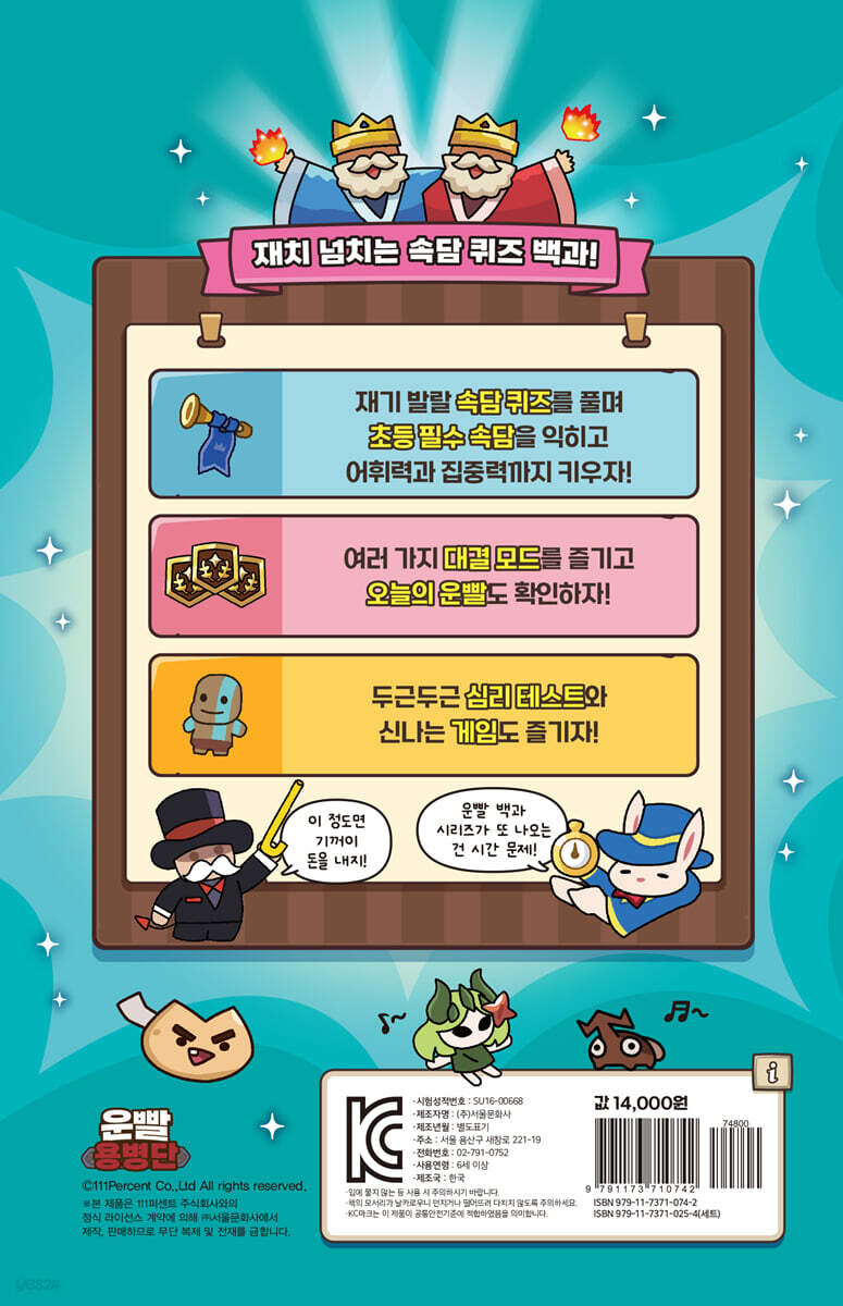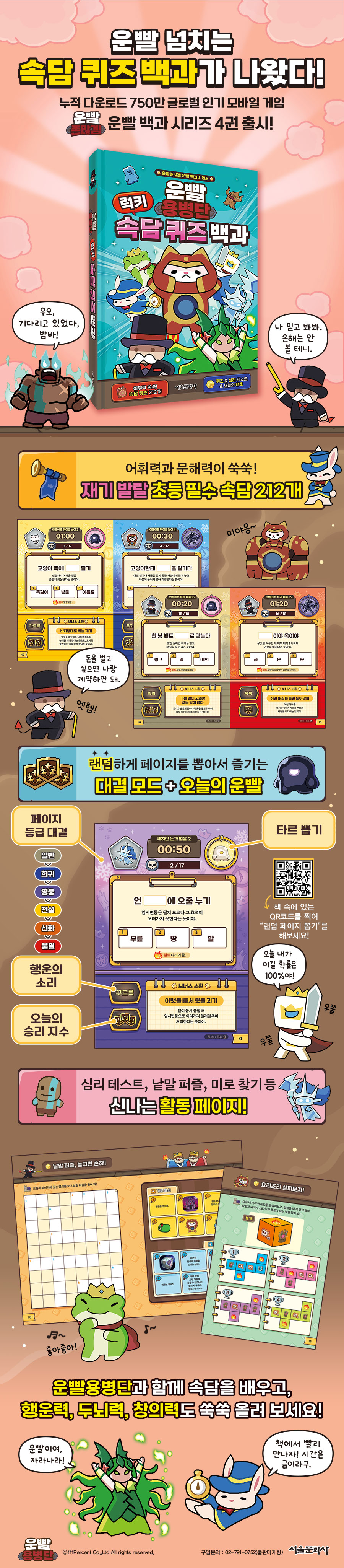 운빨용병단 캐릭터와 찰떡궁합인 6가지 주제로 살펴보는 초등 필수 속담 212개, 매 권 달라지는 대결 모드와 오늘의 운빨 뽑기, 그리고 새로운 유형이 가득한 놀이 페이지까지! 『운빨용병단 럭키 속담 퀴즈 백과』는 인기 모바일 게임 운빨존많겜의 세계관과 캐릭터를 바탕으로 구성한 속담 퀴즈 백과로, 운빨용병단의 인기 캐릭터를 컨셉으로 한 6가지 주제별로 초등 필수 속담 212개를 쉽고 재미있게 배울 수 있도록 구성하였다. ‘랜덤 페이지 뽑기’로 즐기는 ‘대결 모드’와 ‘오늘의 운빨’은 매 권마다 주제가 달라져 책을 펼칠 때마다 새로운 재미를 느낄 수 있고, 이번 권에서는 ‘오늘의 소리’를 통해 의성어 106개도 익힐 수 있어 어휘력을 더욱 풍부하게 키울 수 있다. 「운빨존많겜 운빨 백과 시리즈」는 가족 · 친구들과 함께 즐길 수 있는 유익한 놀이형 학습 백과 시리즈로, 매 권 색다른 주제와 다채로운 활동을 더하여 독자들에게 계속 다가갈 예정이다. |