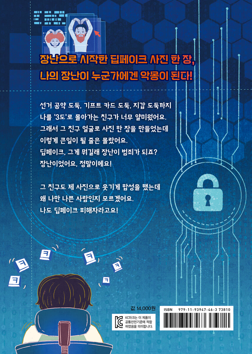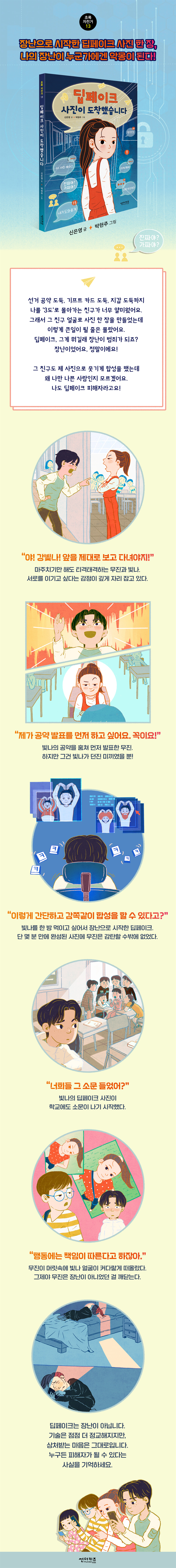 누군가에겐 평생 지워지지 않는 상처가 됩니다! 학교에서 유명한 앙숙인 무진과 빛나는 반 회장 선거에서 만나게 됩니다. 빛나를 꼭 이기고 싶었던 무진은 빛나의 선거 공약을 몰래 알아내 먼저 발표하지요. 하지만 빛나도 당하고만 있지 않습니다. 가짜 공약을 무진에게 흘린 빛나는 무진을 공약 도둑으로 만들어 골탕을 먹입니다. 게다가 회장에 당선된 자기 얼굴에는 왕관을 씌우고, 무진이 얼굴에는 웃긴 분장을 해서 별그램에 업로드합니다. 매번 빛나에게 당한다고 생각했던 무진은 빛나 얼굴을 딥페이크로 합성해 이상한 사진을 만들어 버립니다. 그 장난 때문에 빛나는 제대로 학교생활을 할 수 없게 되지요. 상황은 더 심각해집니다. 이번엔 무진의 여동생 라라가 딥페이크 피해자가 된 거예요. 그제야 무진이는 깨닫습니다. 내가 장난으로 만든 한 장의 사진이 누군가에겐 잊지 못할 상처가 될 수 있다는 것을. 《딥페이크 사진이 도착했습니다》는 장난과 책임, 가해자와 피해자, 그리고 후회와 성장의 과정을 그린 이야기로, 디지털 시대를 살아가는 어린이들에게 깊은 생각거리를 선물합니다. |